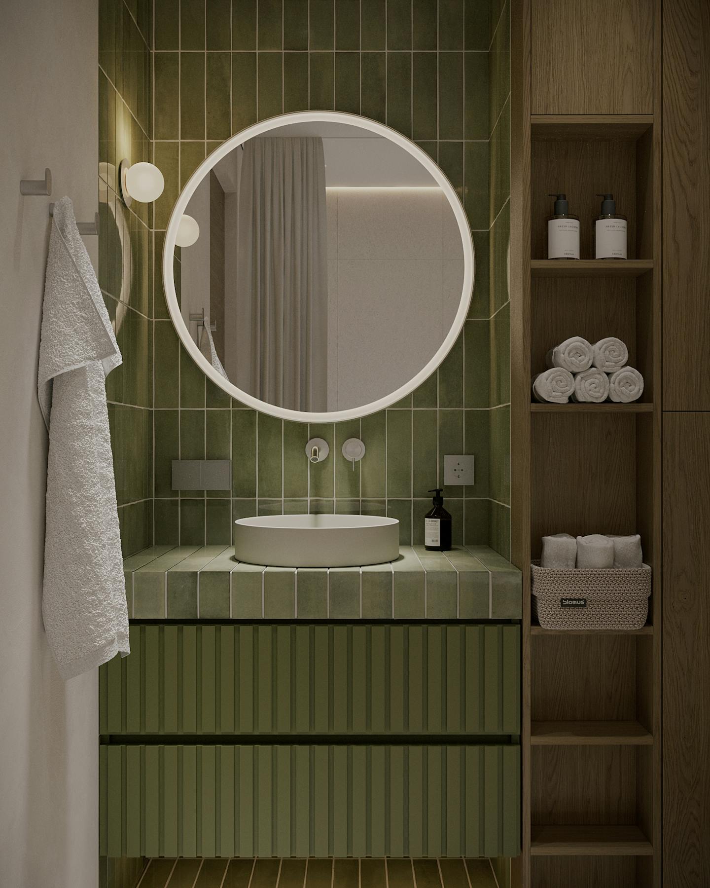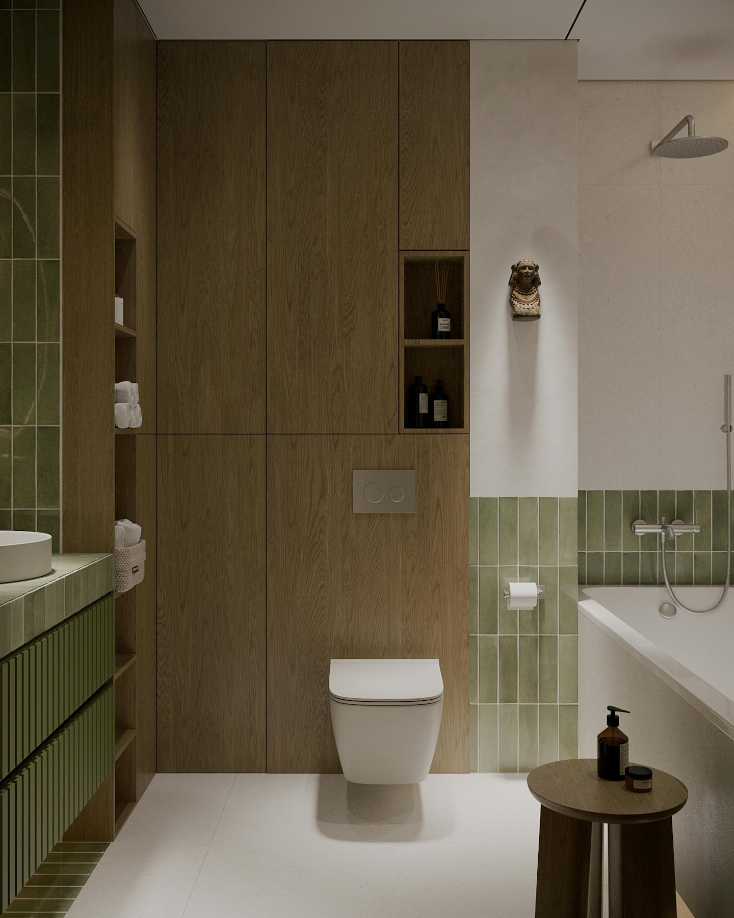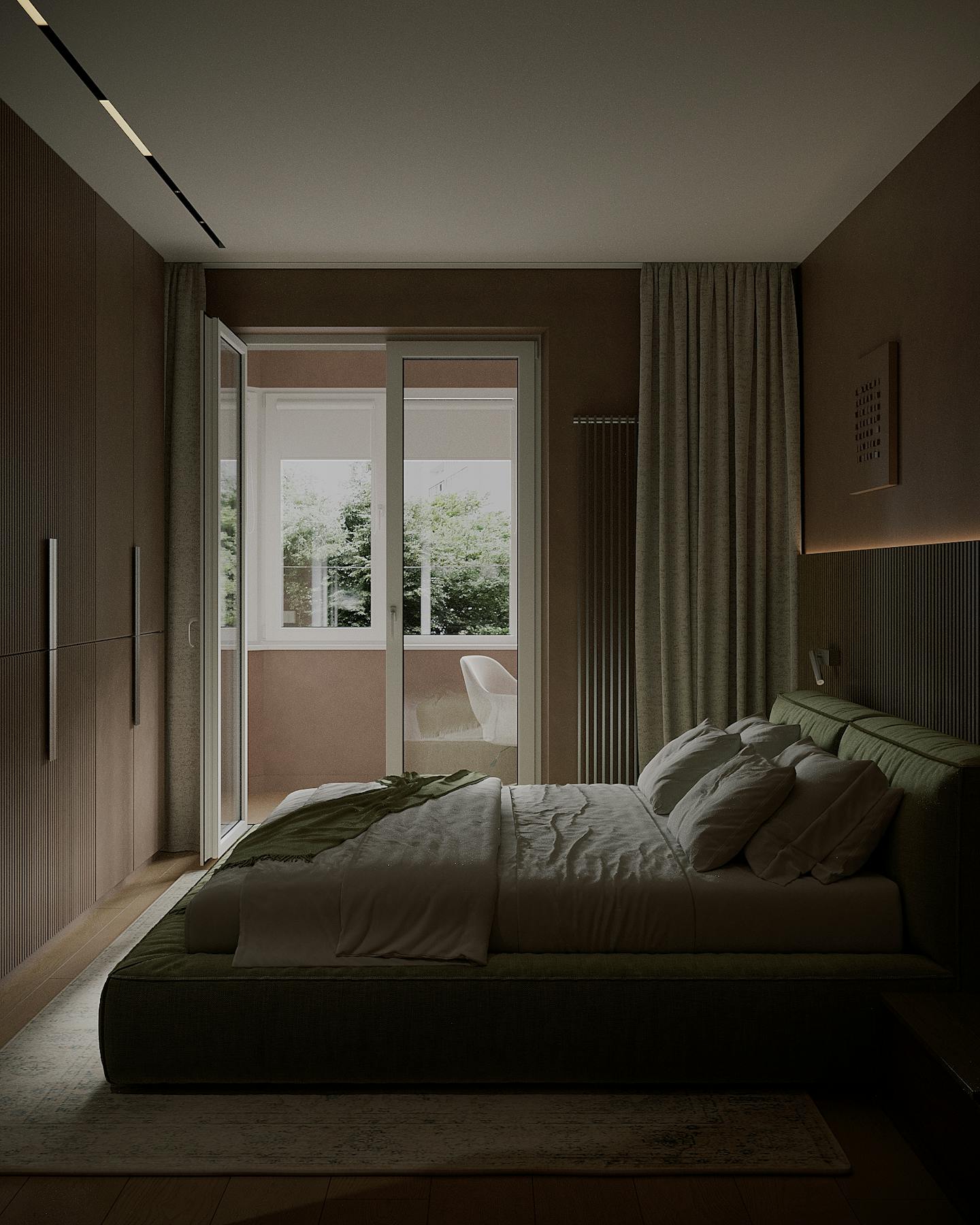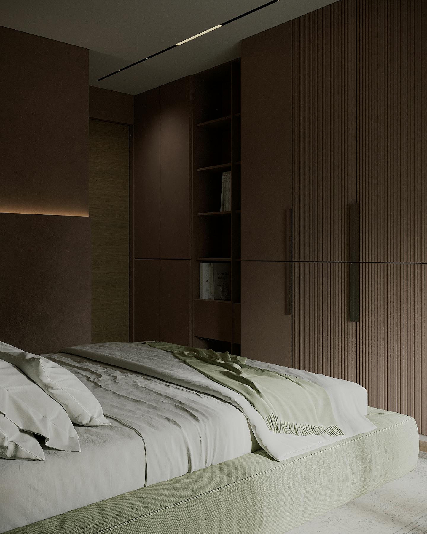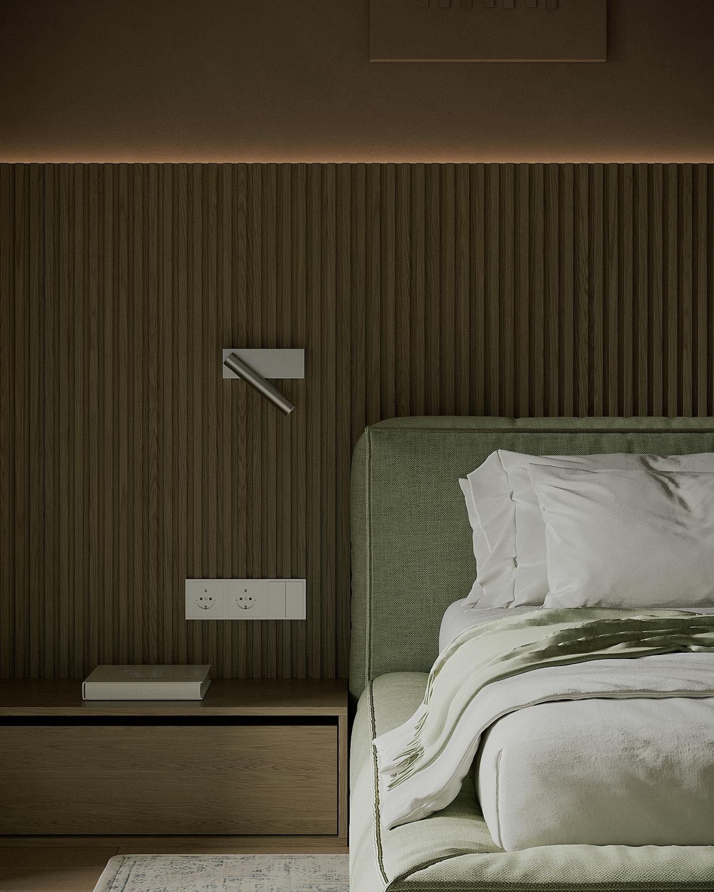 Оливковый цвет в сочетании с минималистичным подходом создает пространство, где каждый элемент находится на своем месте.