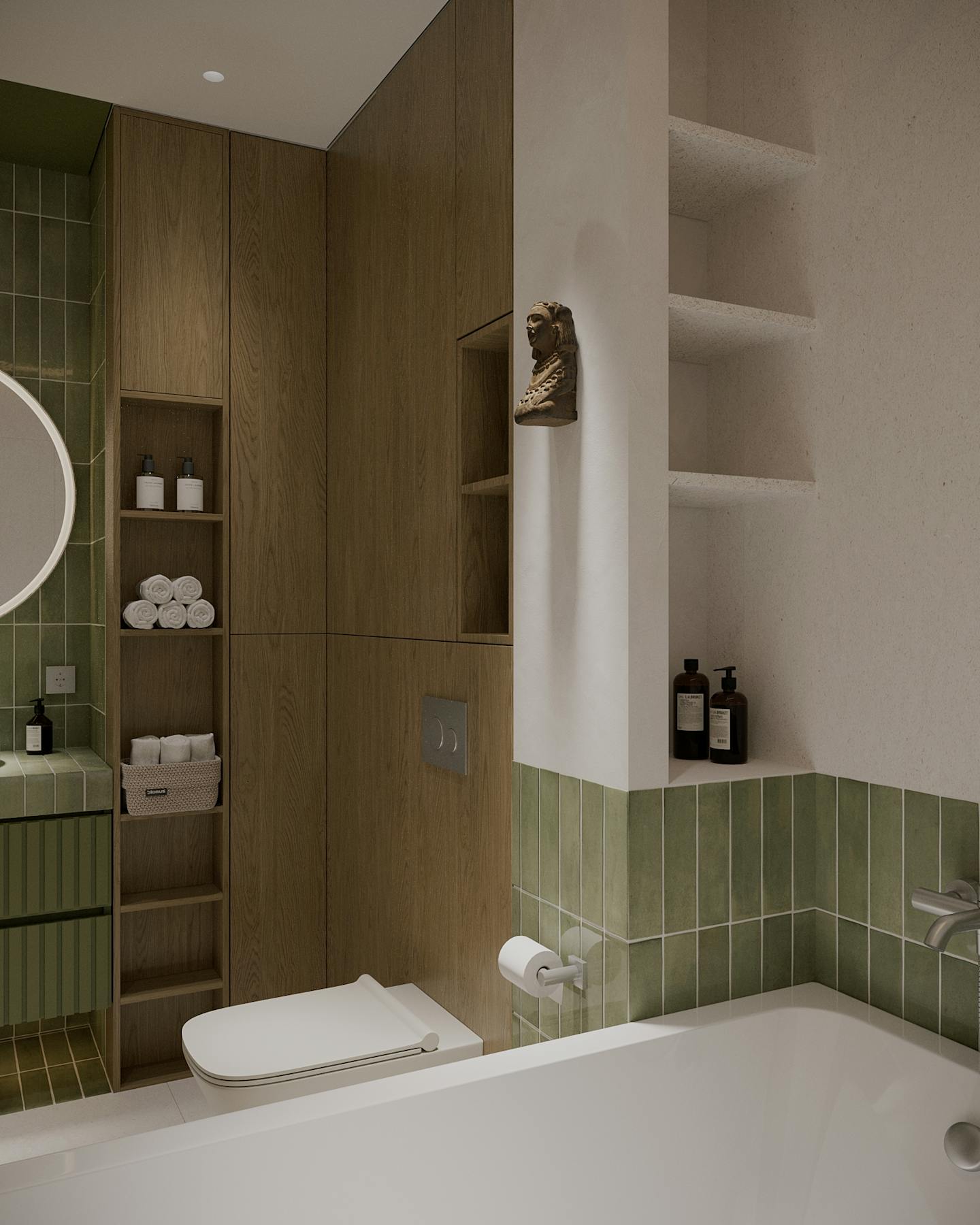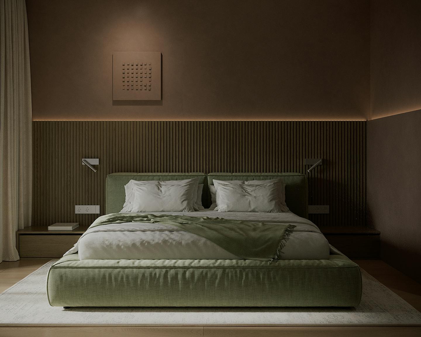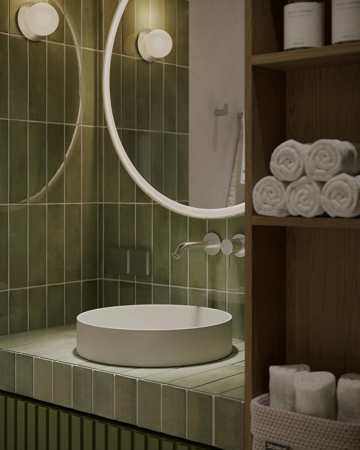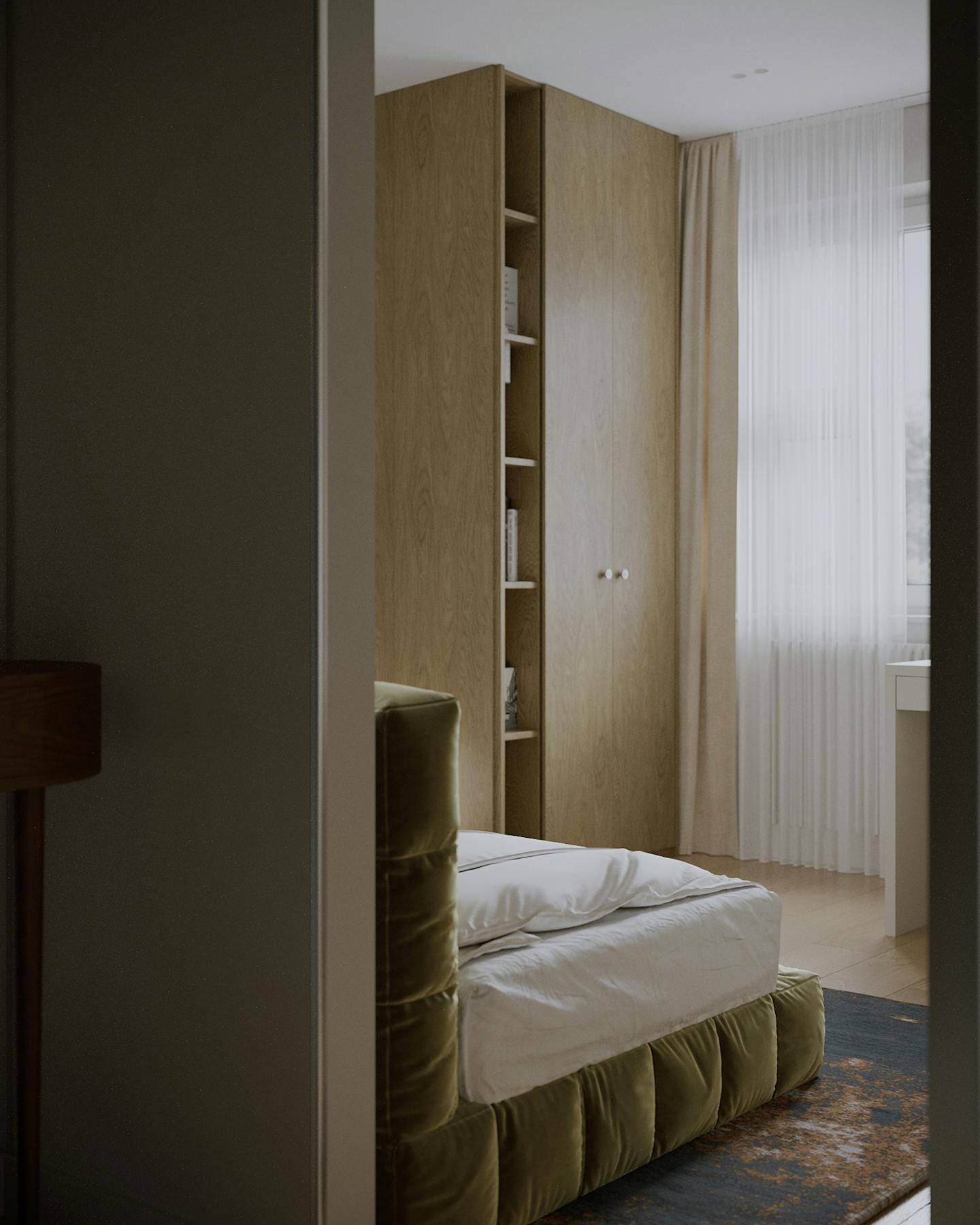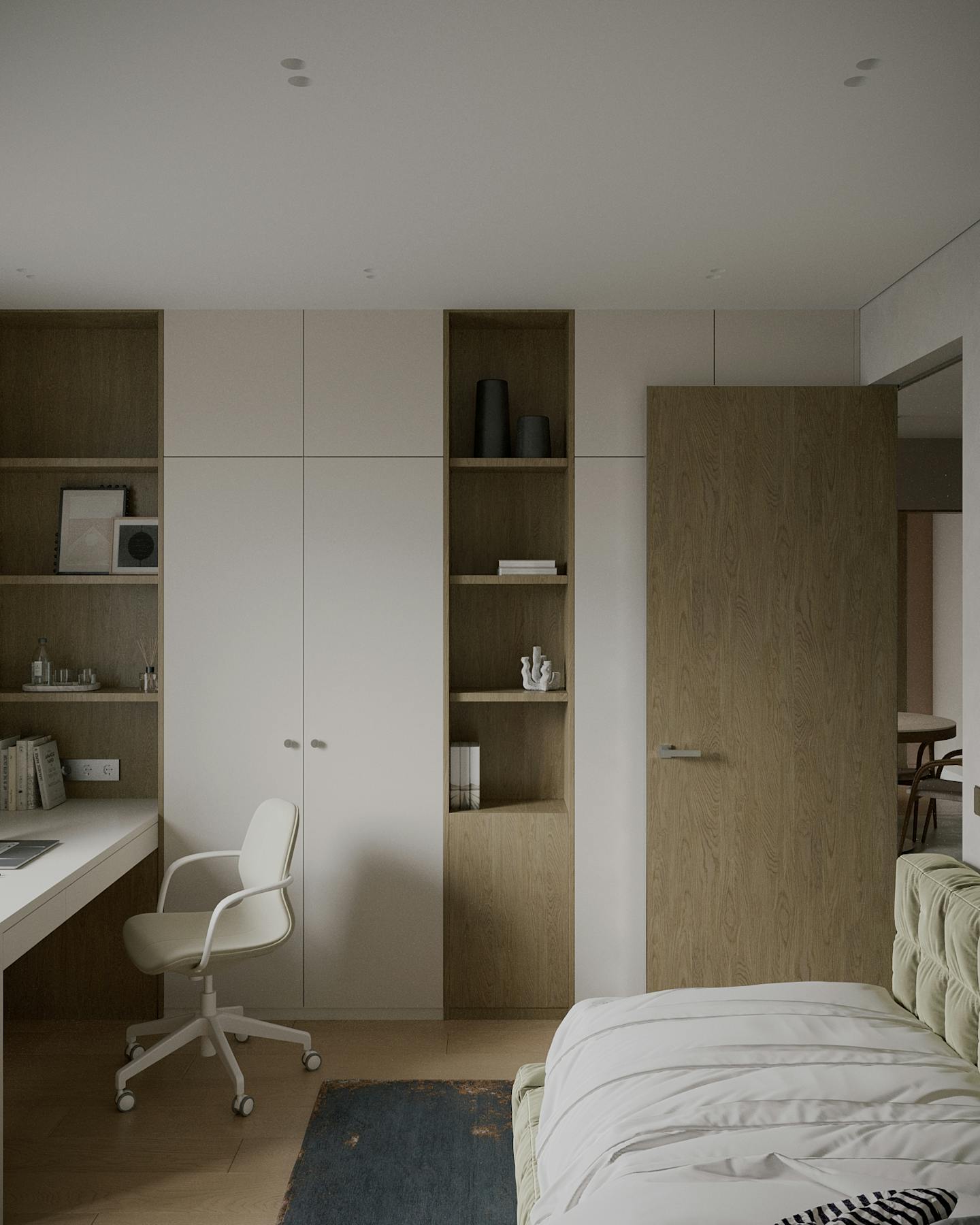 Оливковый цвет в сочетании с минималистичным подходом создает пространство, где каждый элемент находится на своем месте.