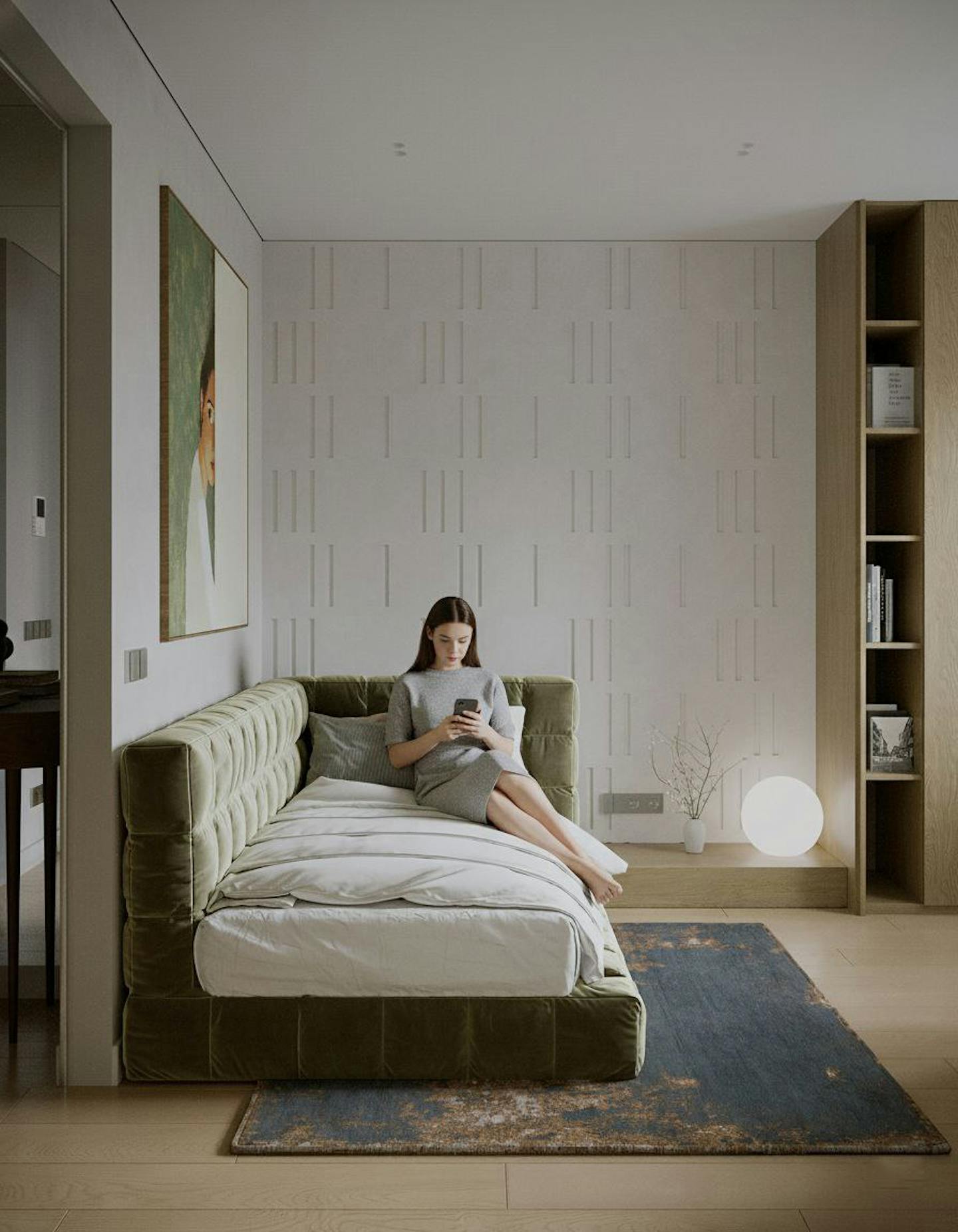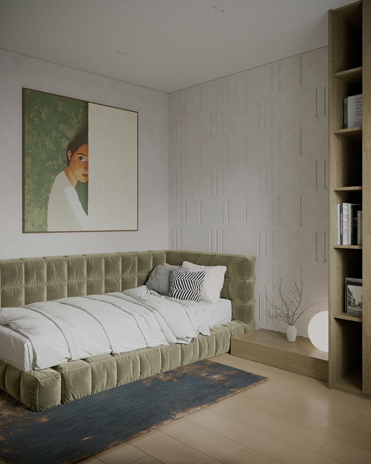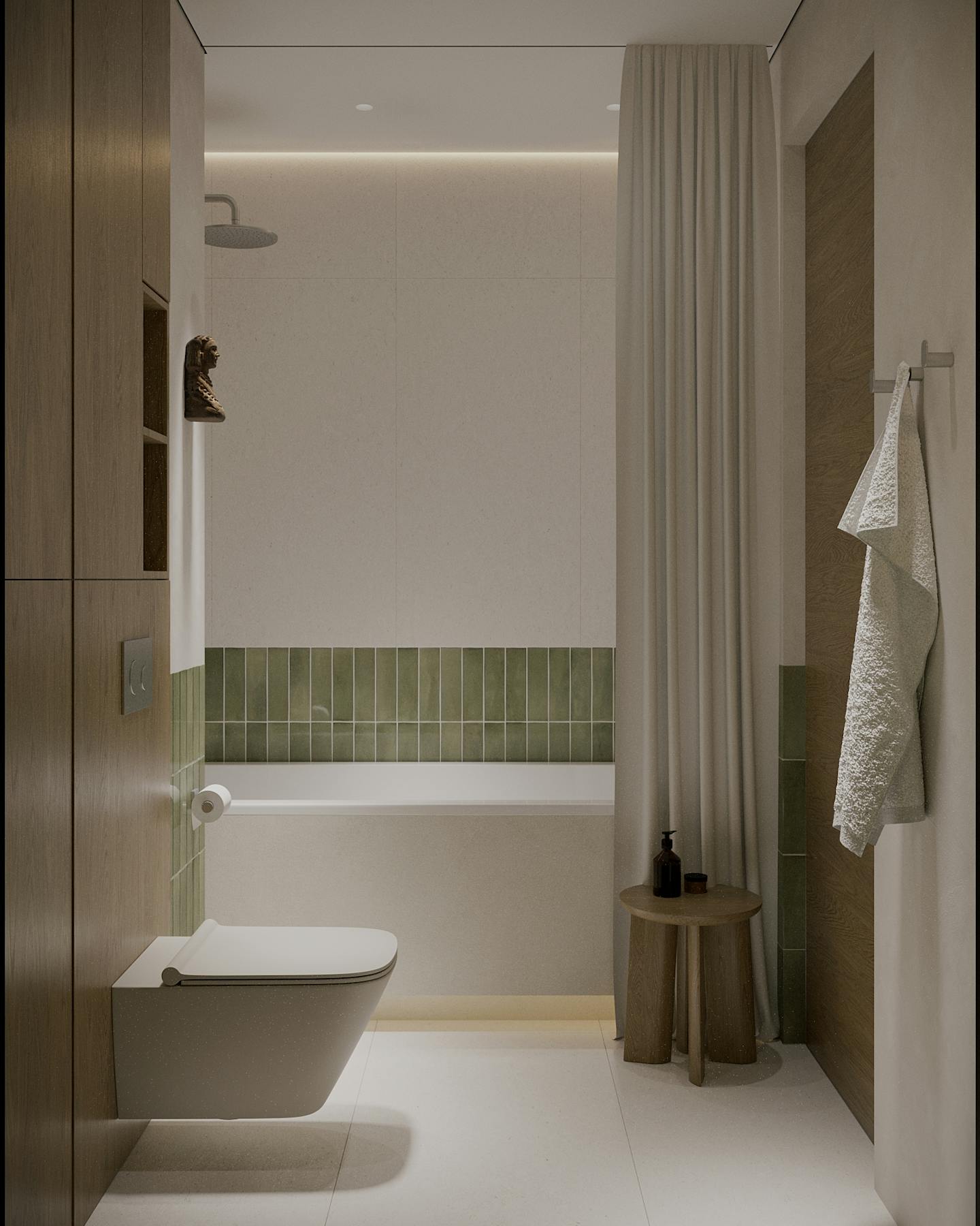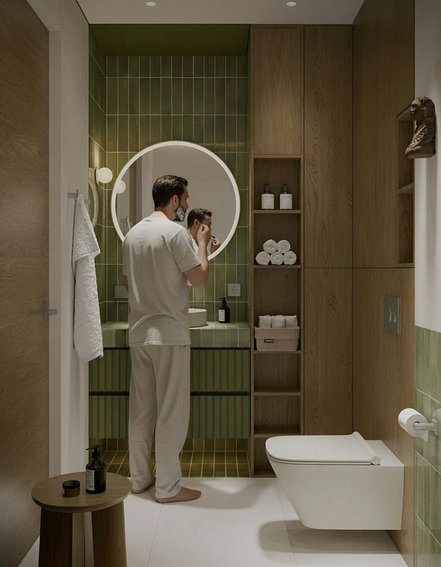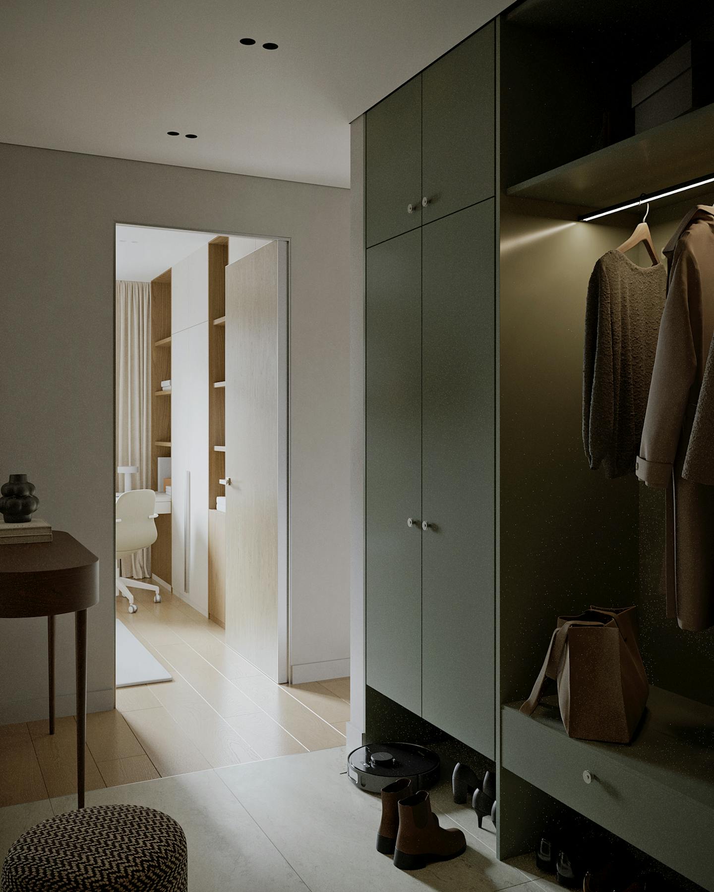Оливковый цвет в сочетании с минималистичным подходом создает пространство, где каждый элемент находится на своем месте.