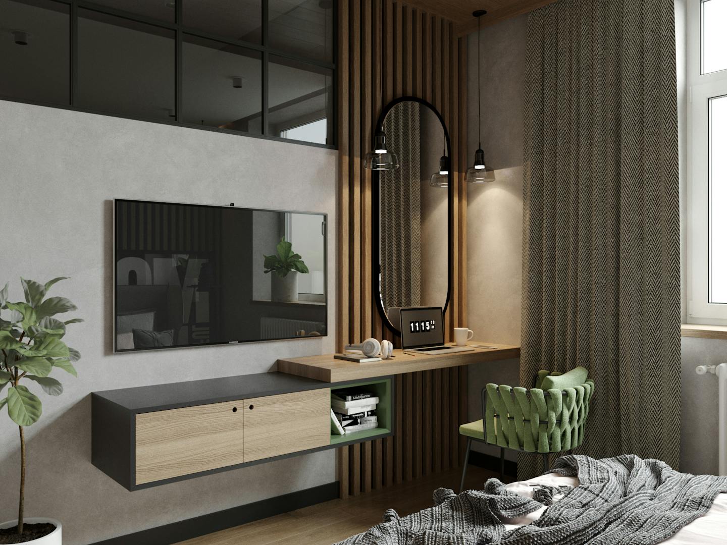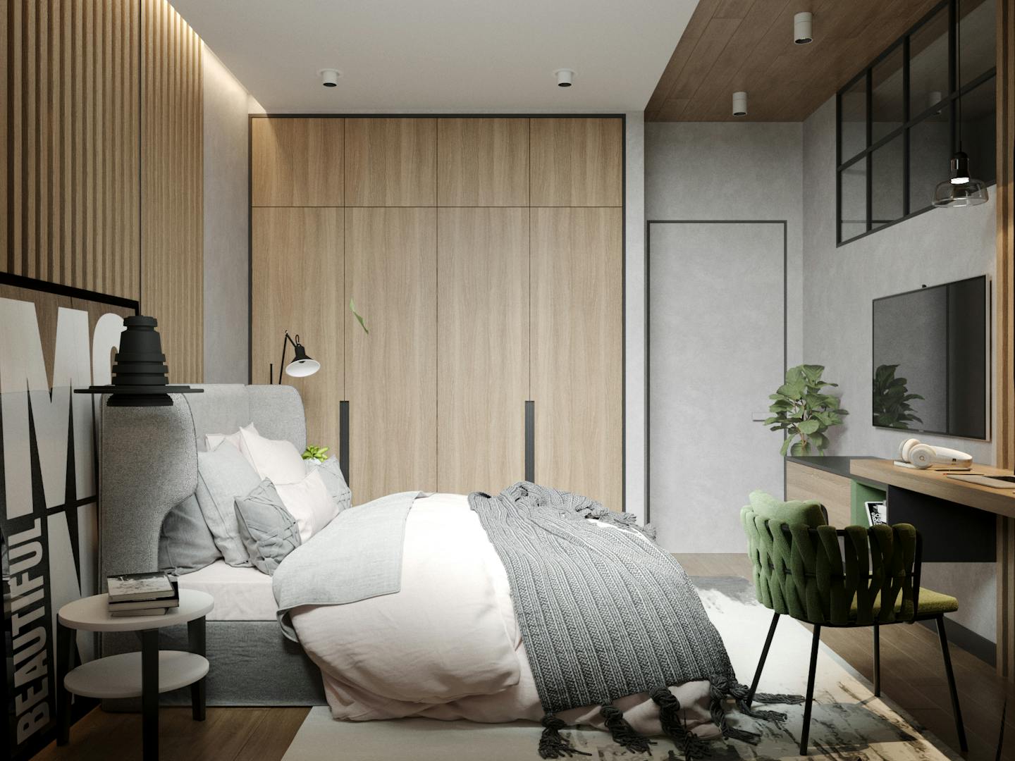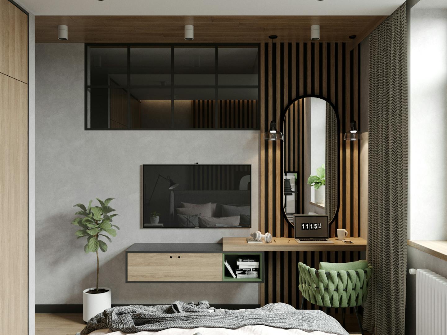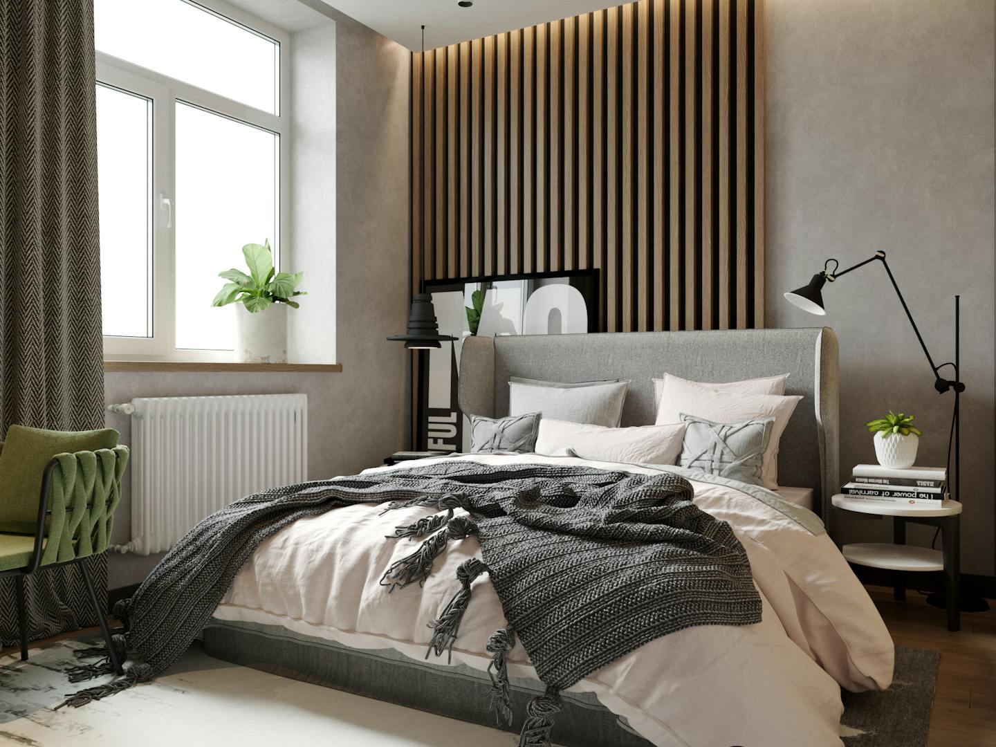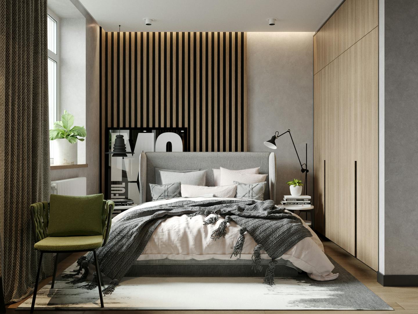 Спальня оформлена в спокойных кремовых оттенках с яркими акцентами. Деревянные реечные панели, серые плотные шторы и в сочетании с зеленым текстилем создают теплую умиротворяющую атмосферу.