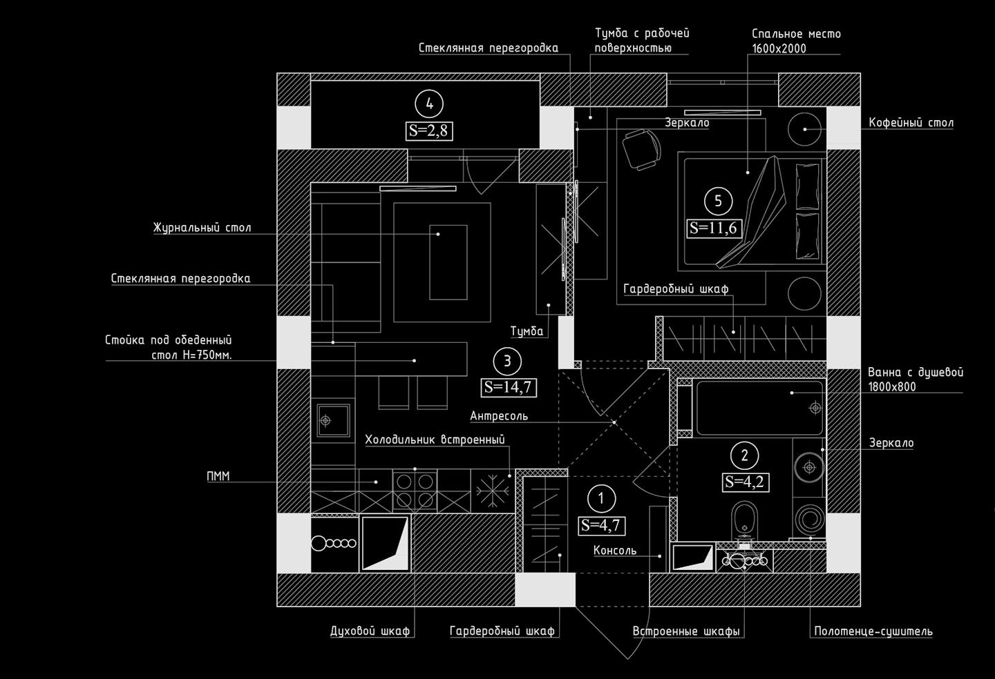 Хозяйка квартиры хотела внедрить элементы лофта, поэтому мы решили оставить две стены в гостиной необлицоваными и добавили стеклянные перегородки. Кухню-гостиную визуально делит пополам отделка стены. Особый уют гостиной придает текстиль акцентных цветов.