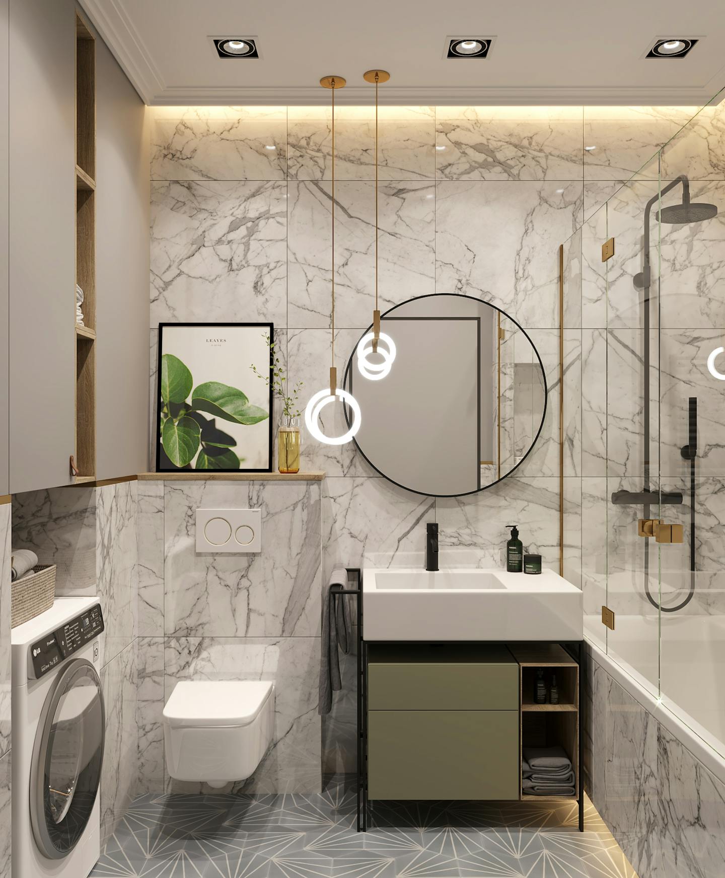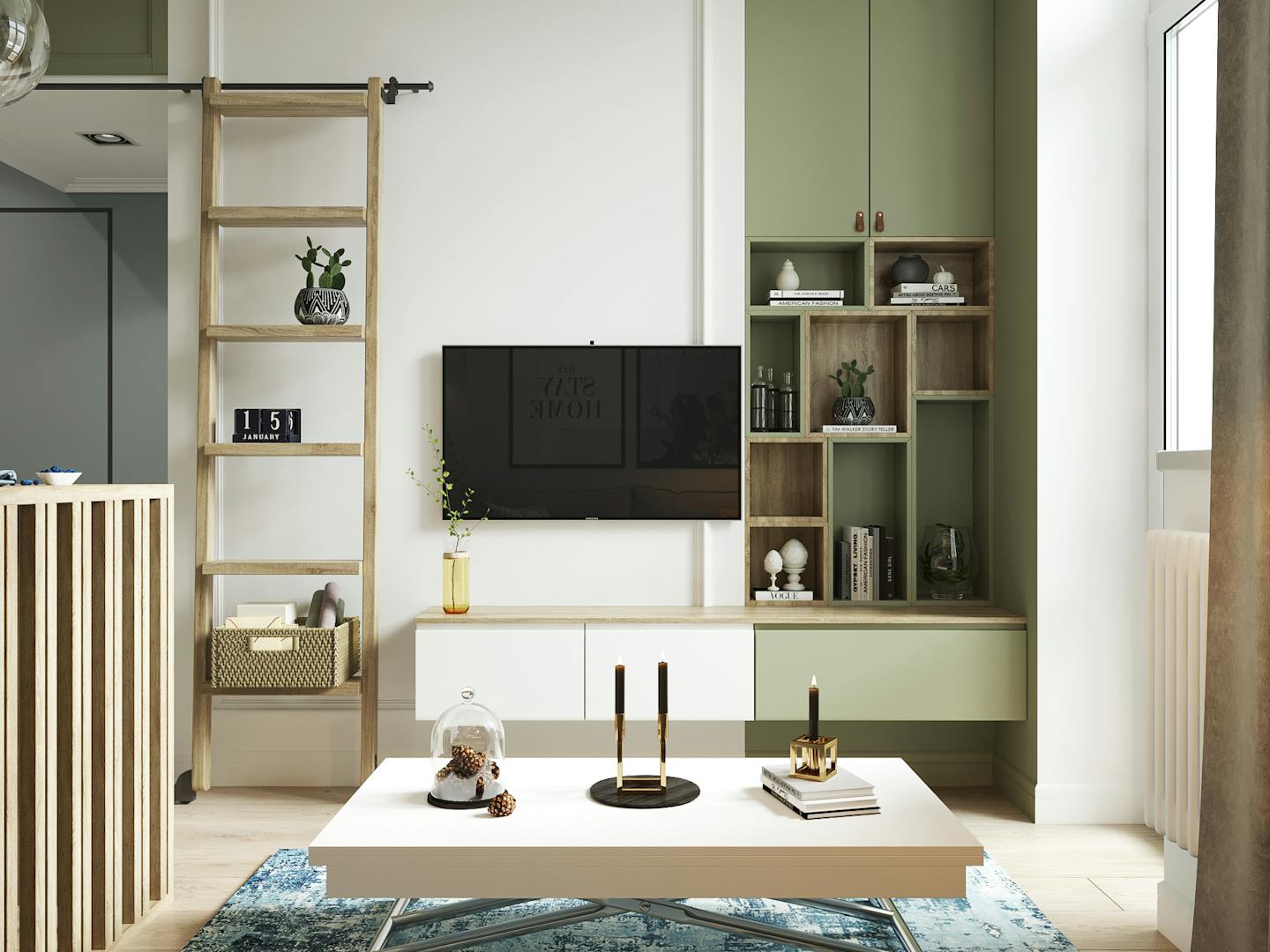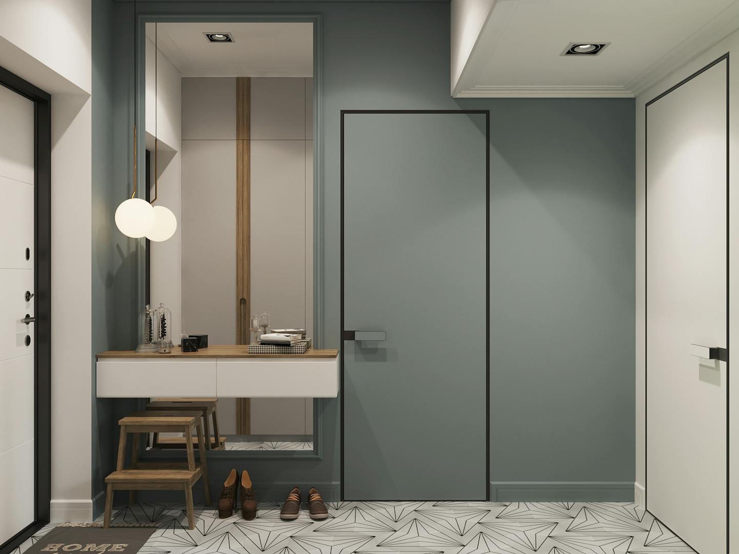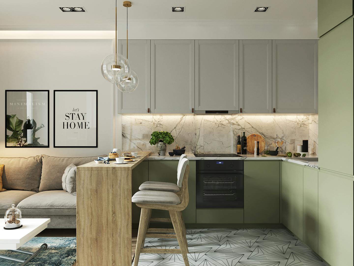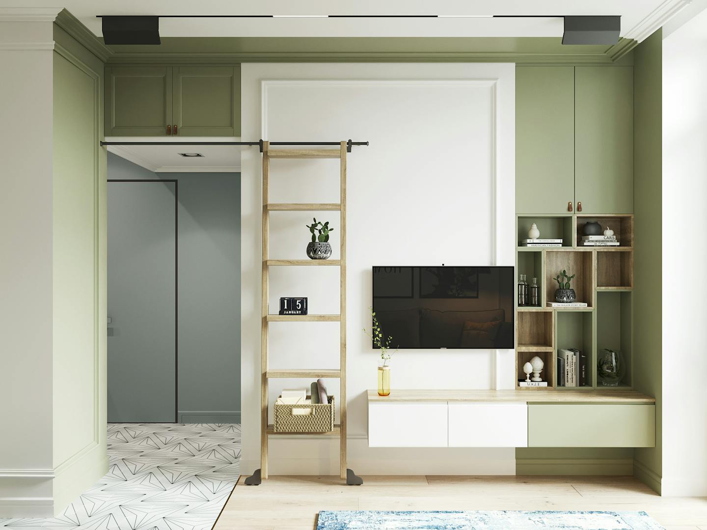 Визитная карточка интерьера — сочетание натурального дерева и пастельных оттенков холодной гаммы: голубого и фисташкового. В помещениях есть споты и крутые трековые светильники в стенах и потолке.