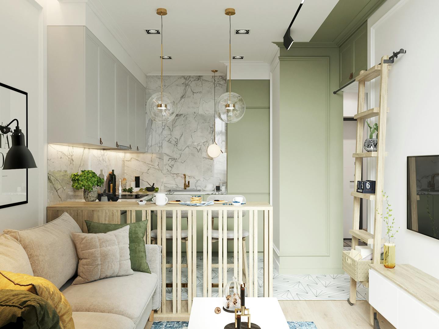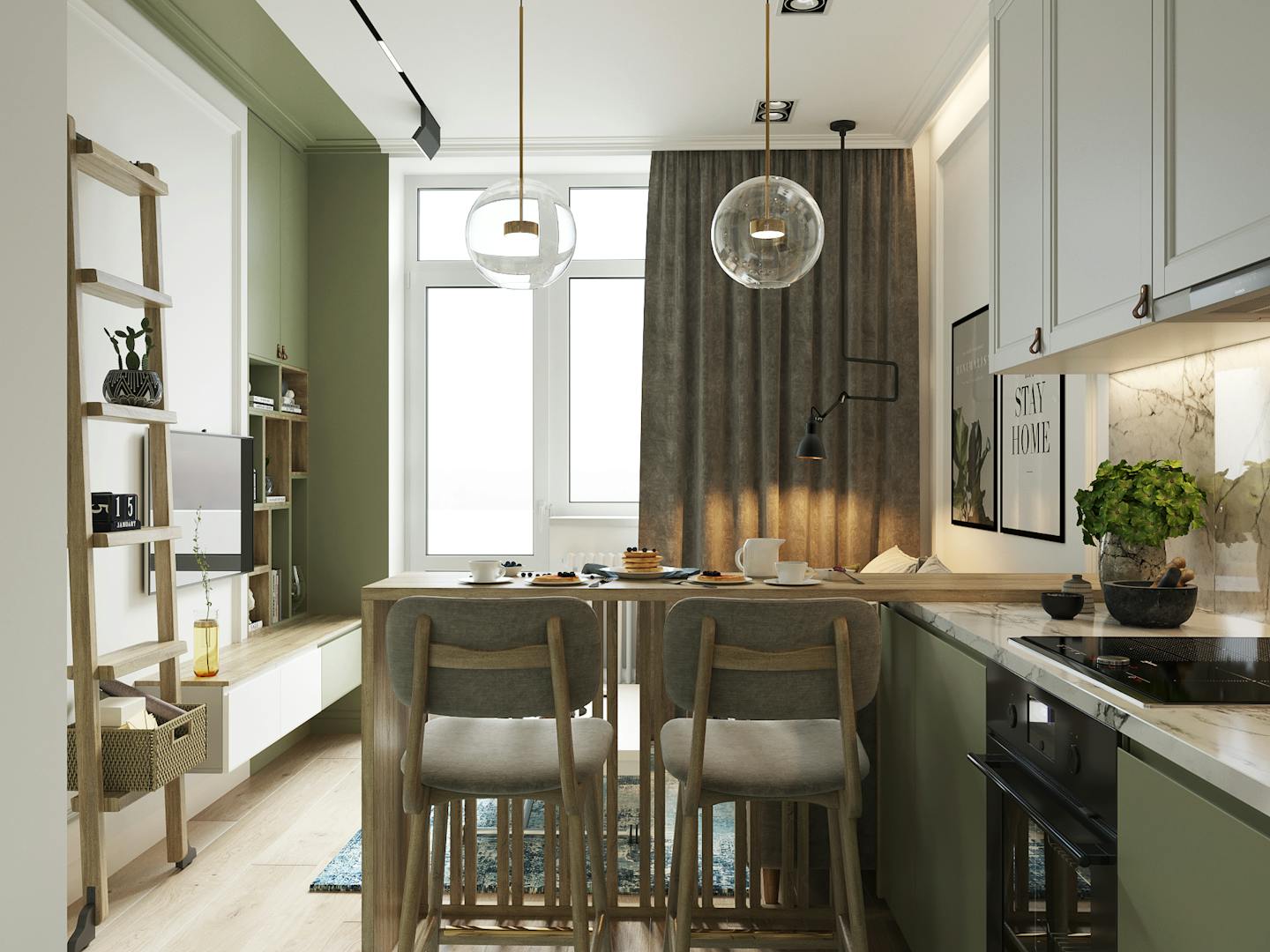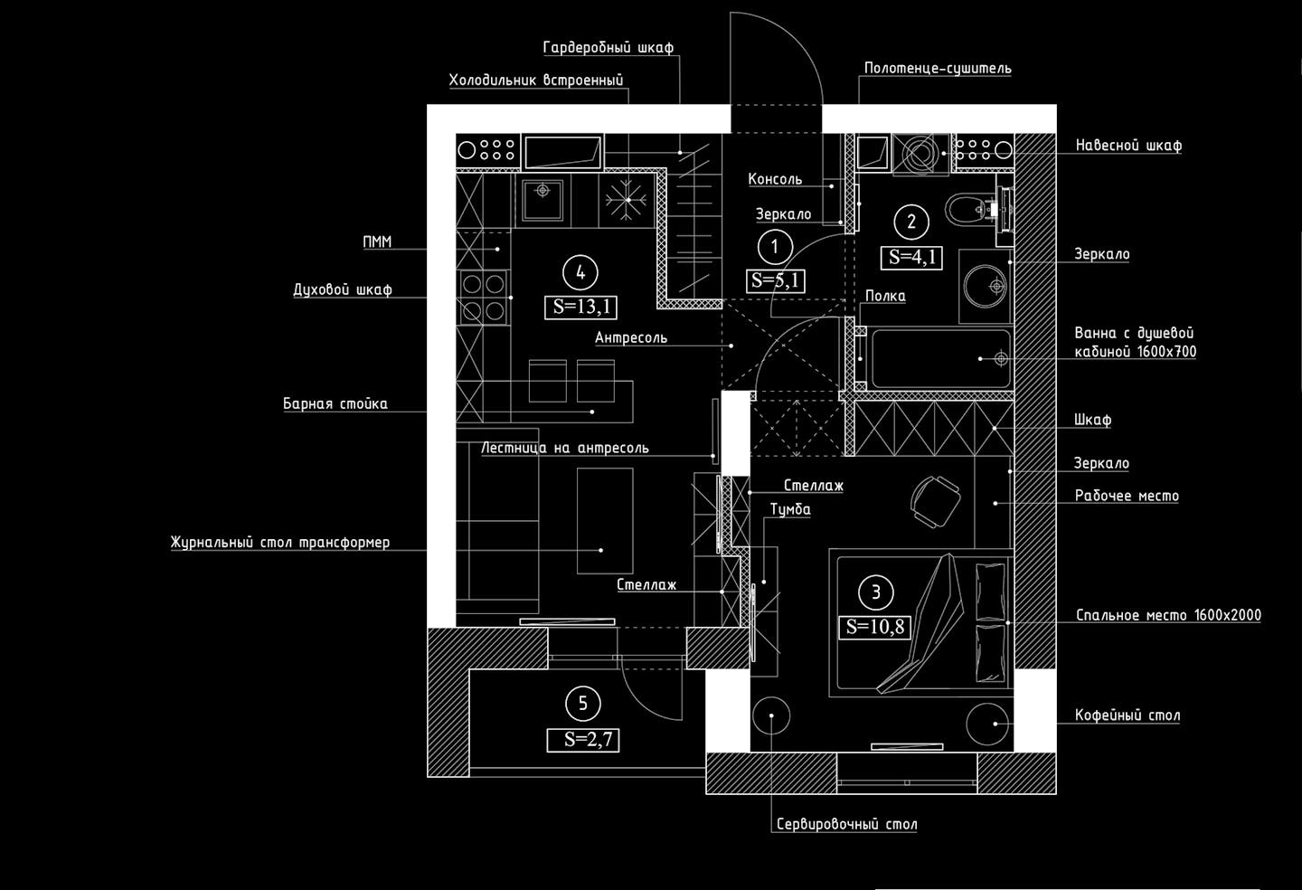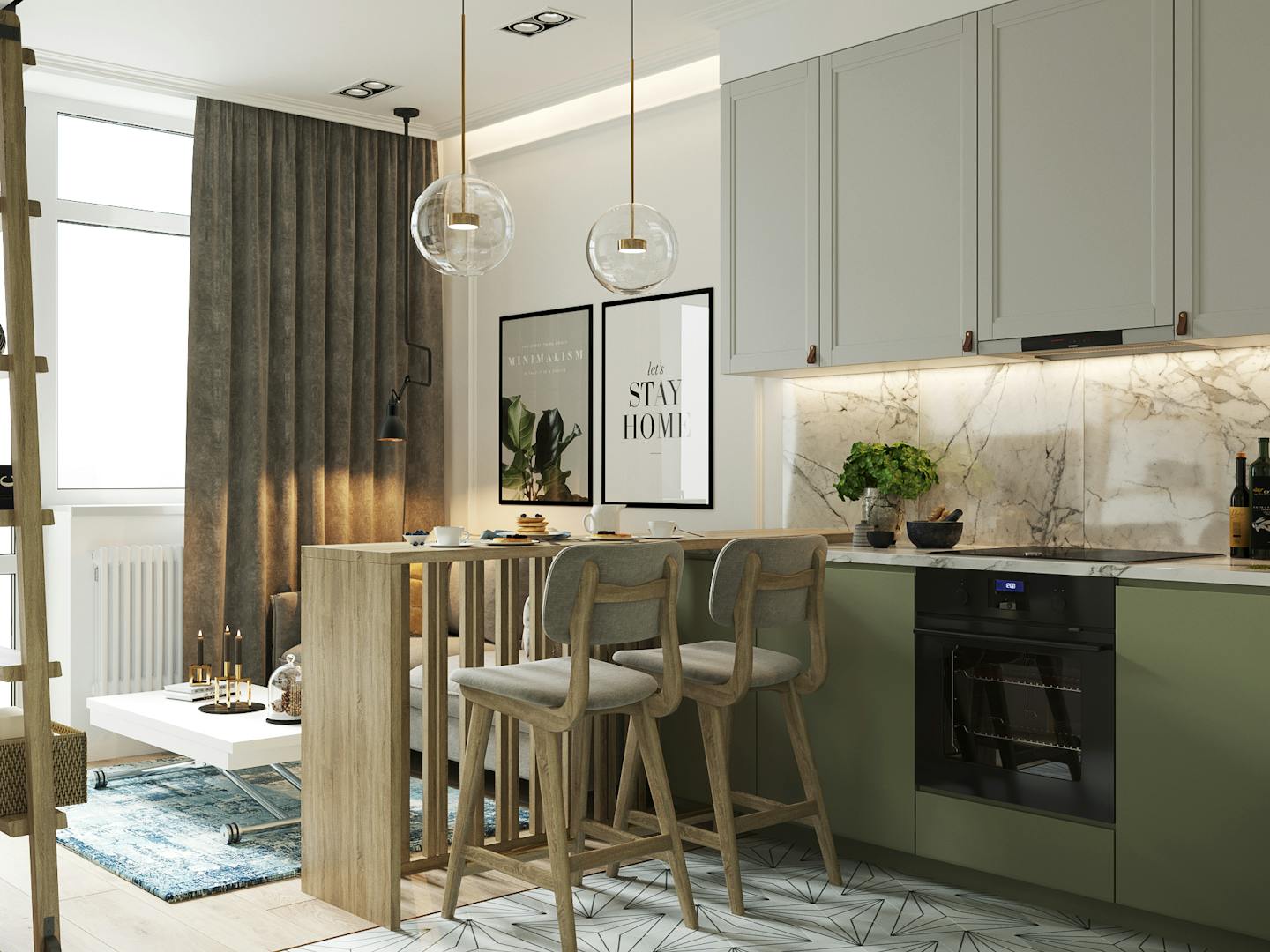 Перед нами стояла задача создать на относительно небольшой площади максимально функциональное и уютное пространство. К примеру, для экономии места мы добавили антресоли, а за рабочей зоной установили зеркало для визуального расширения пространства. Нам удалось разместить большую и функциональную кухню, удобную мягкую группу, небольшую, но уютную спальню, место для работы, а также предусмотреть достаточное количество мест для хранения.