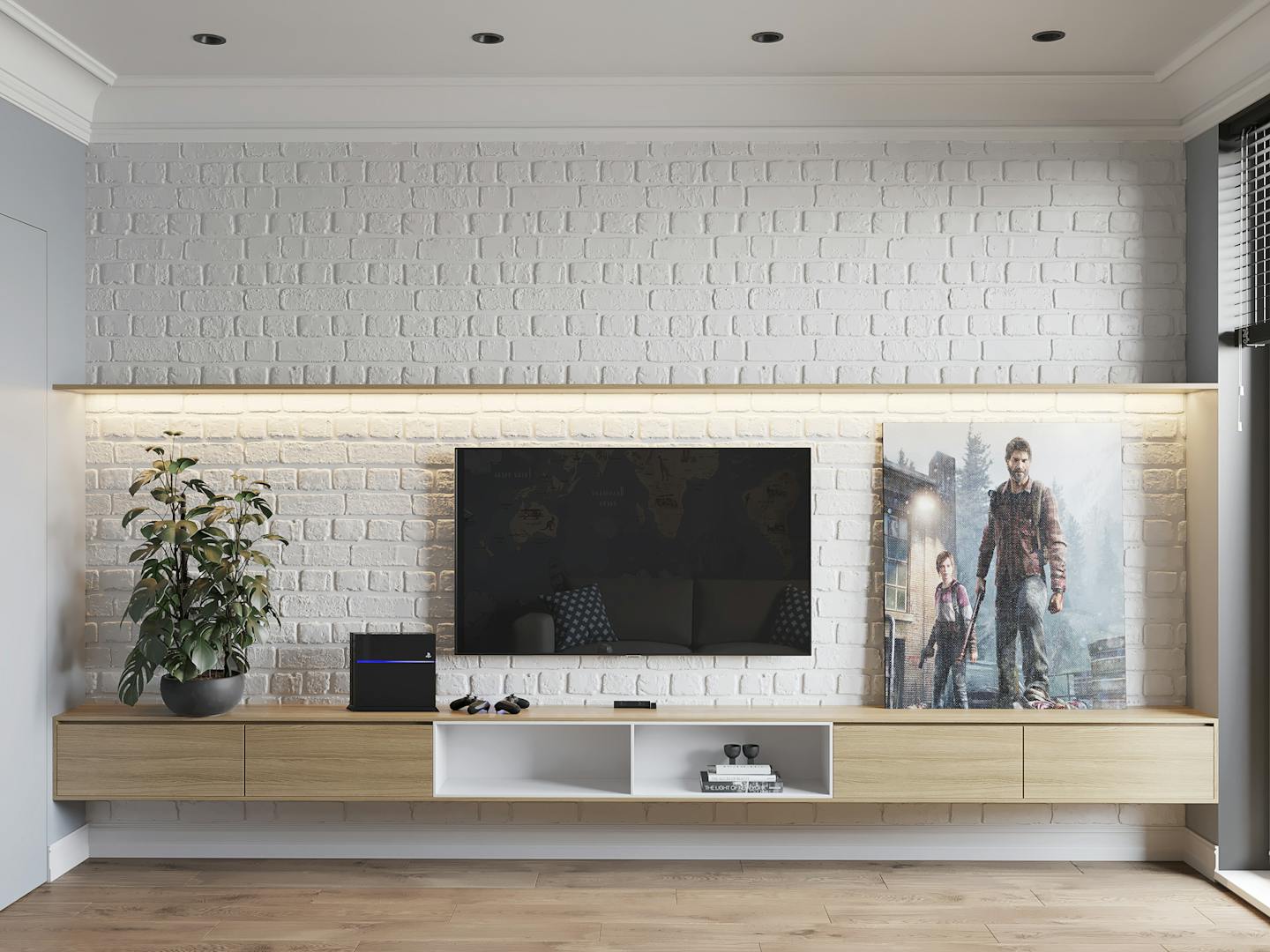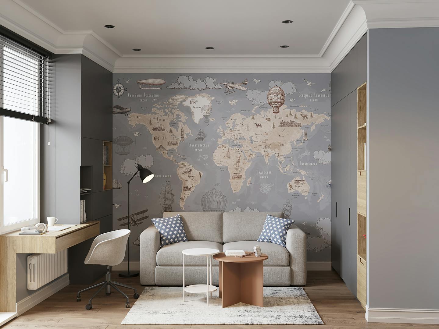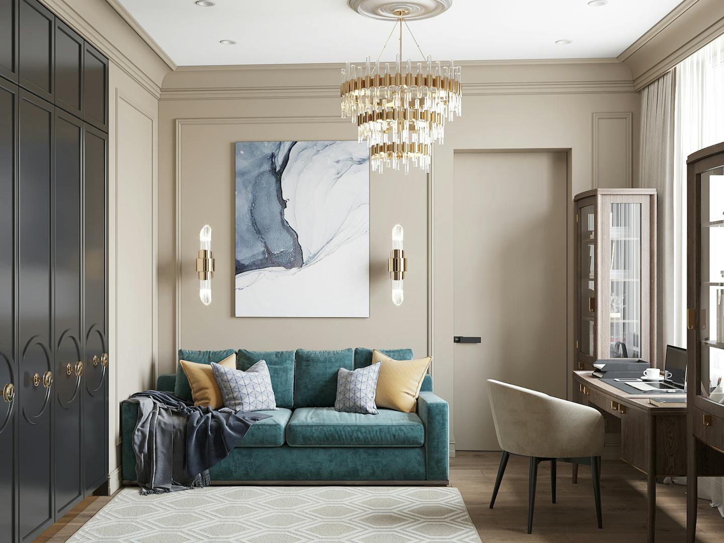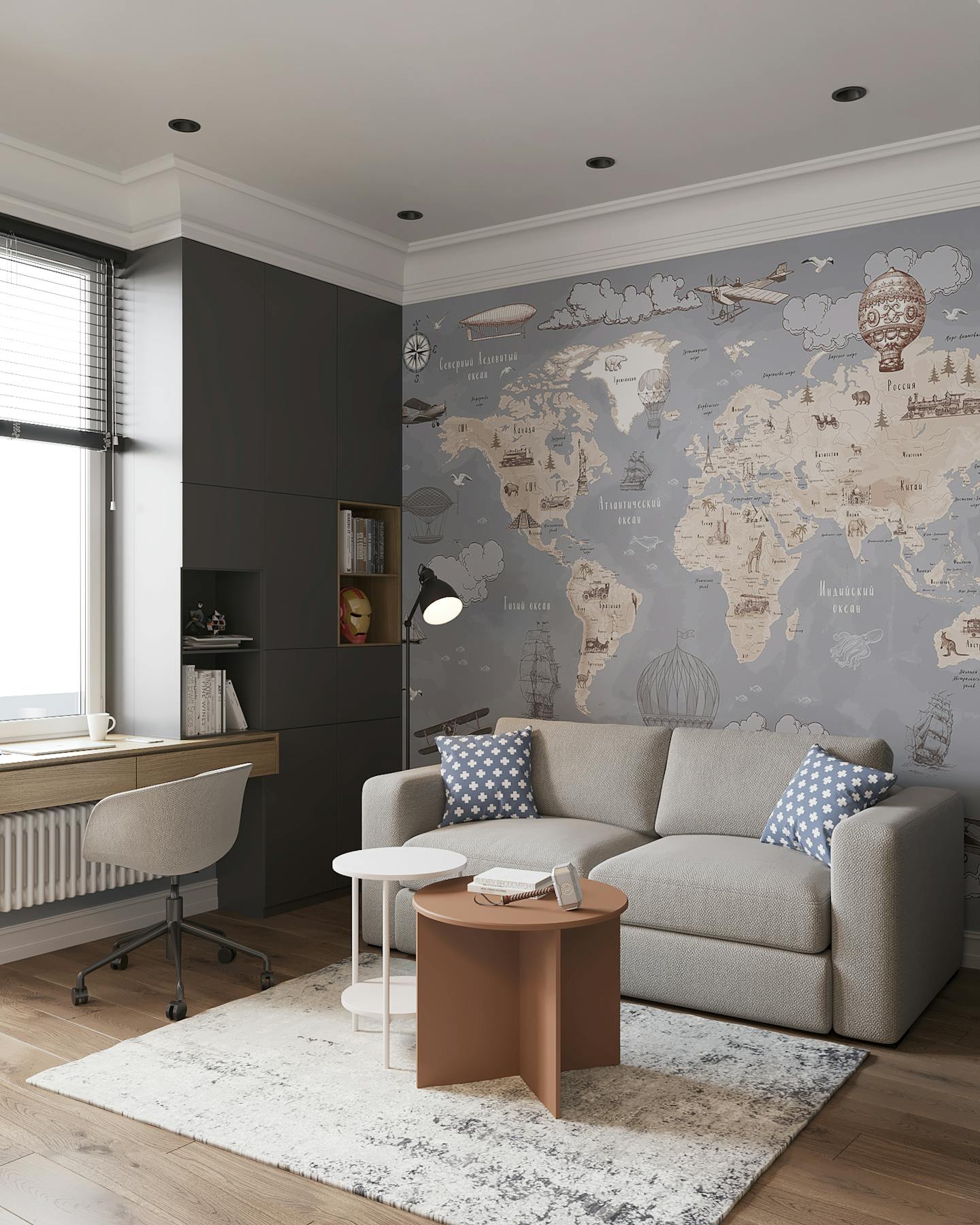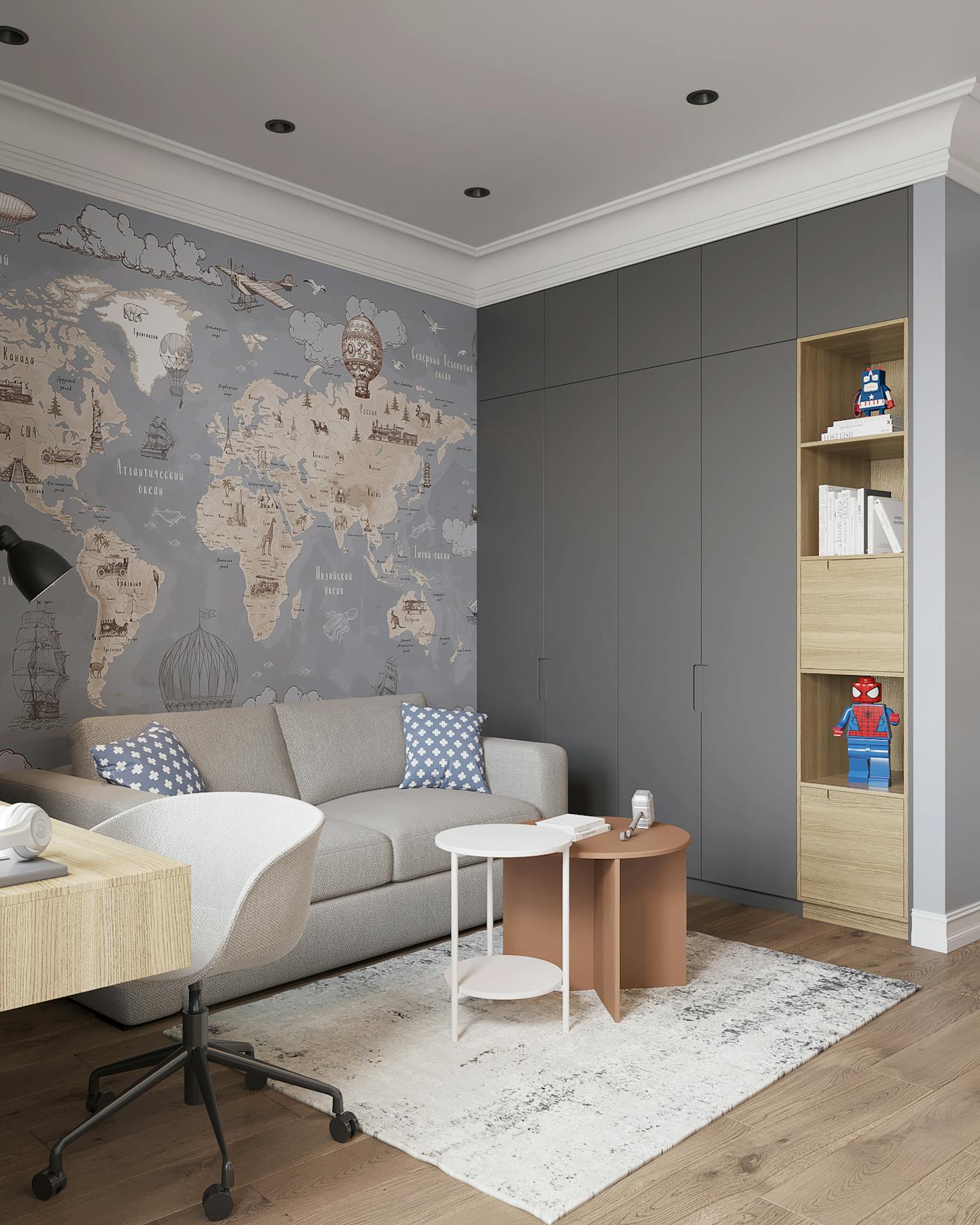 Кабинет получился строгим, но бирюзовый диван отлично разбавляет серьезную атмосферу. При желании, кабинет можно использовать как комнату отдыха. На контрасте с кабинетом выглядит детская для мальчика — там решили использовать в зоне за ТВ клинкерный кирпич, а на противоположной разместили фотообои. Решили расположить диван вместо кровати в пользу шкафов и экономии места — все-таки в детстве часто приходят в гости друзья.