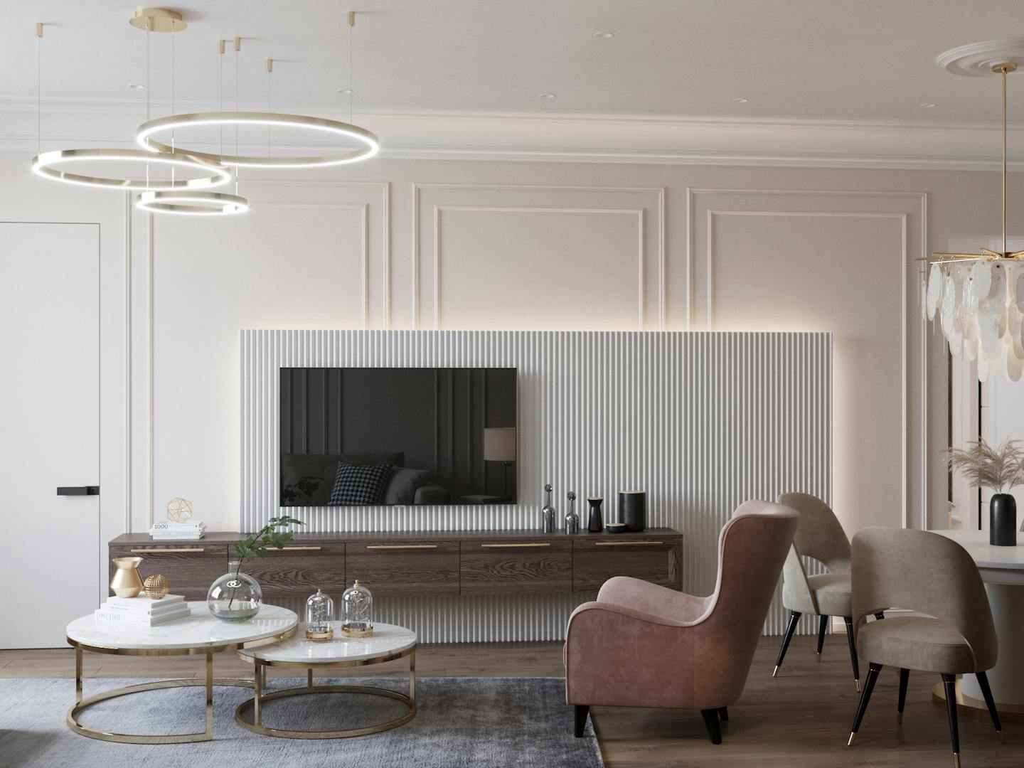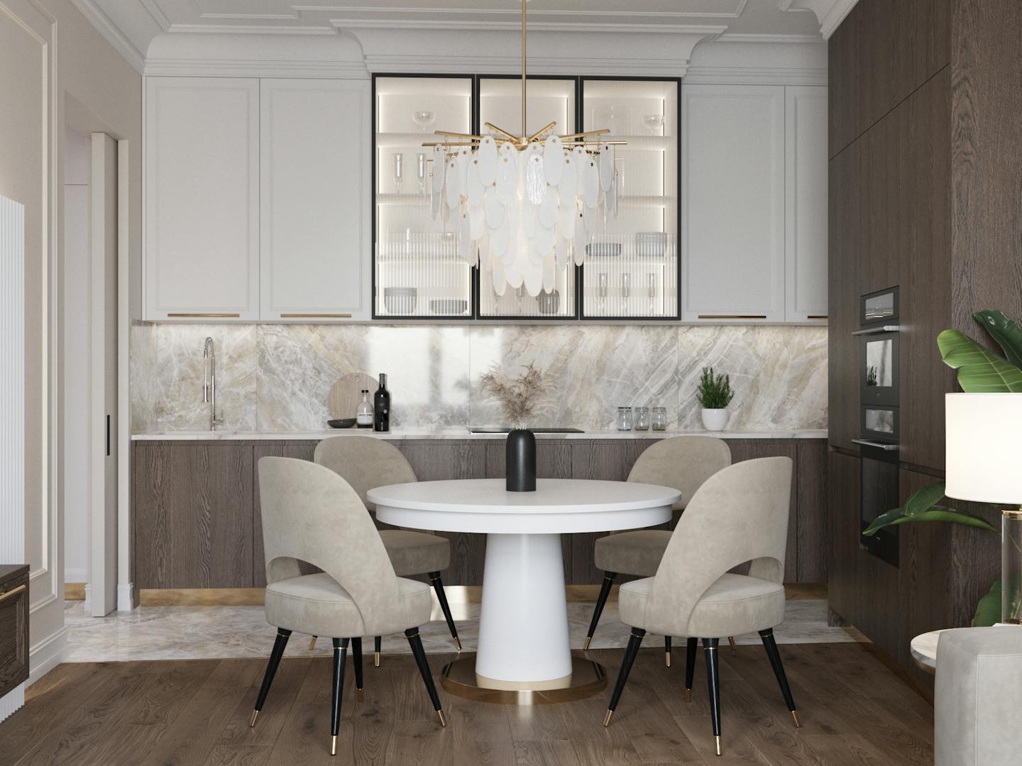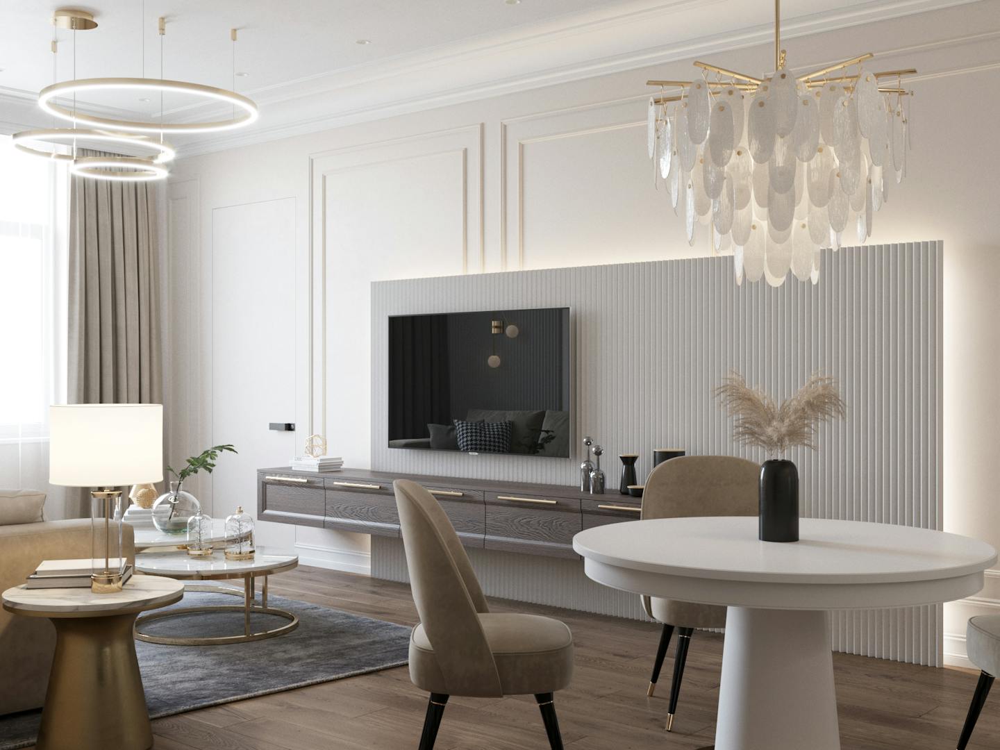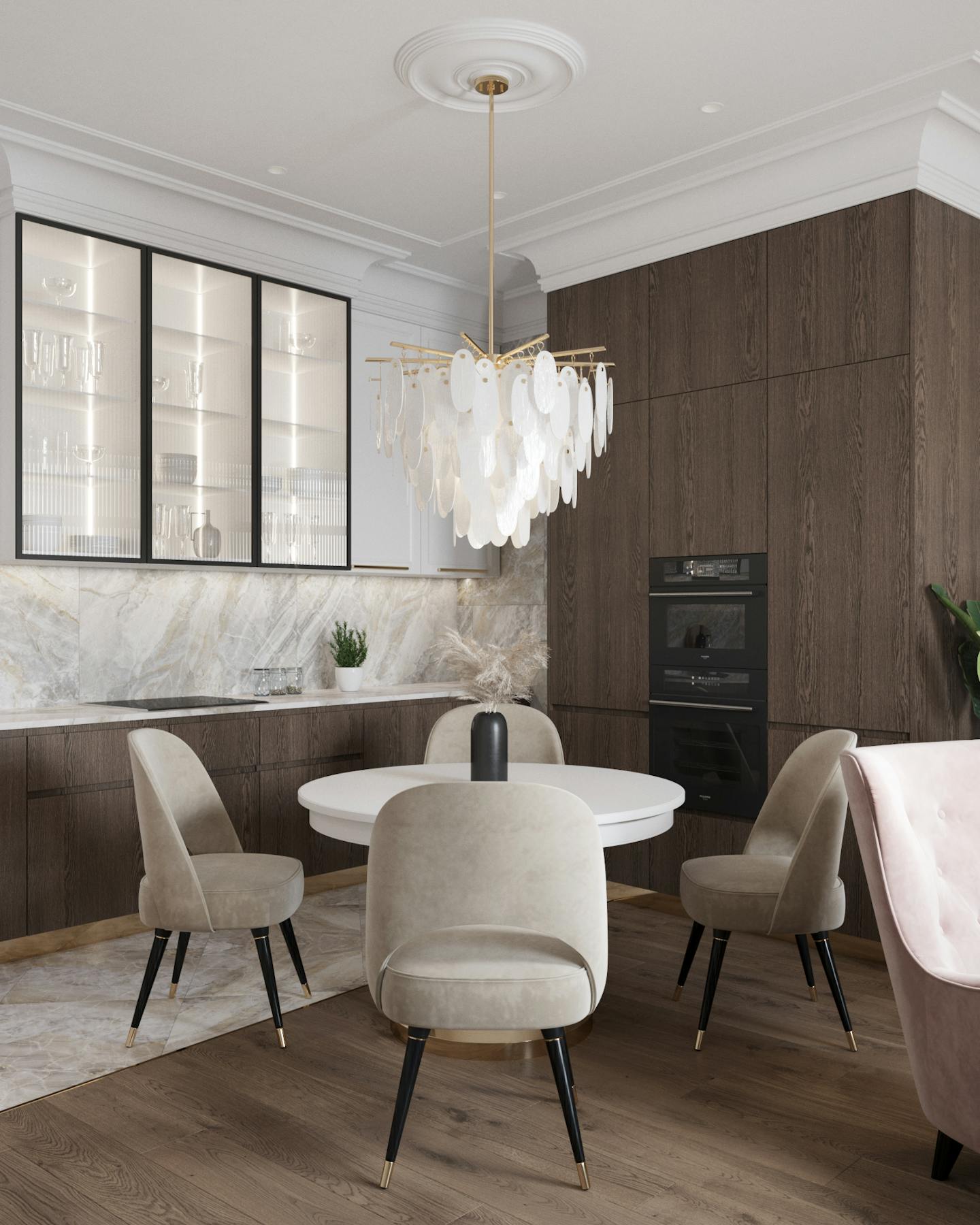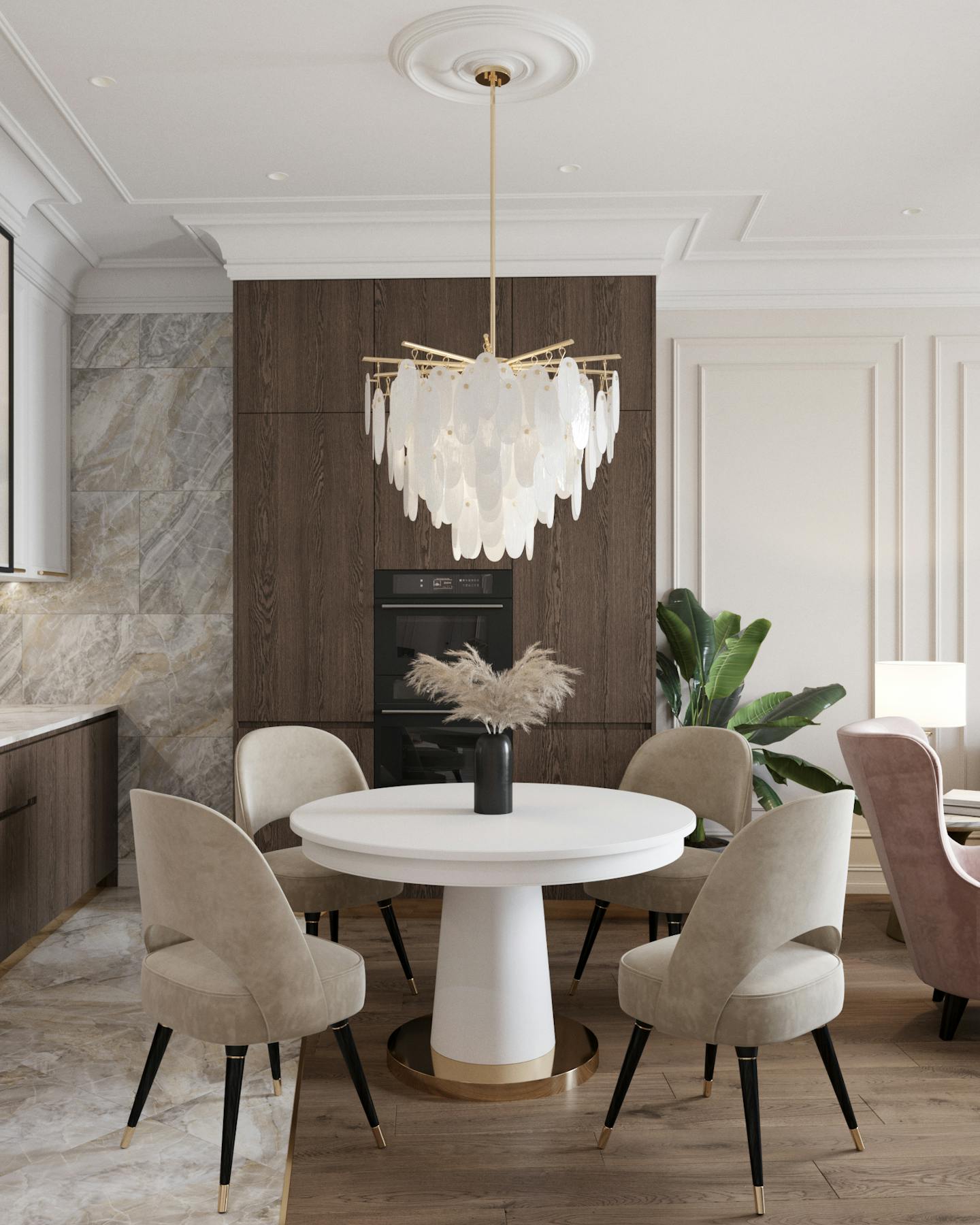 Главной «изюминкой» стал искусственный свет, в частности, — люстры, которые стилем объединяют все помещения в единое пространство.