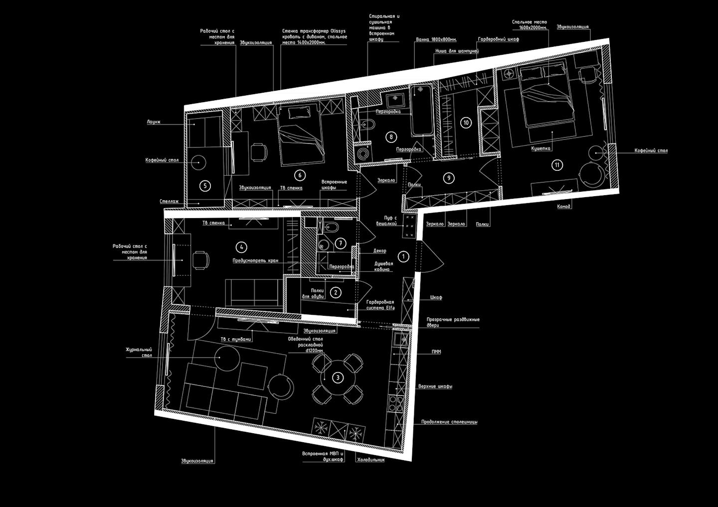 У квартиры в данном проекте интересная планировка — очень мало прямых углов. Разумеется, это обстоятельство создало ряд сложностей — к примеру, корпусная мебель практически вся делалась исключительно на заказ, а на кухне шкаф с техникой был расположен отдельно от основной мебели. Текстиль и шторы тоже активно использовались в создании визуально правильного помещения.