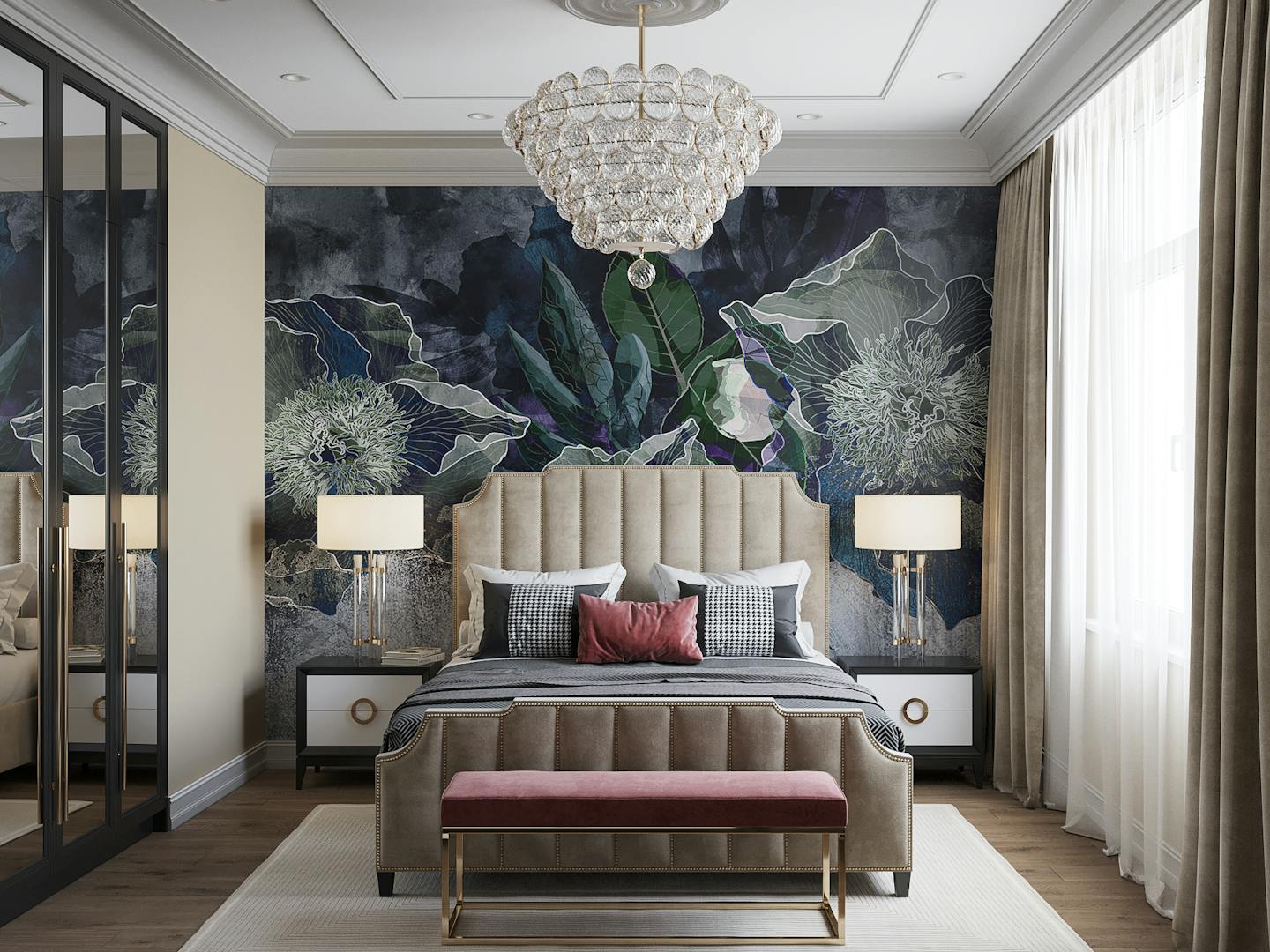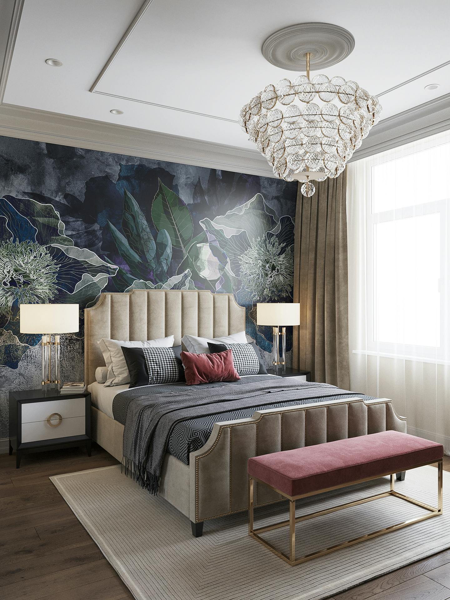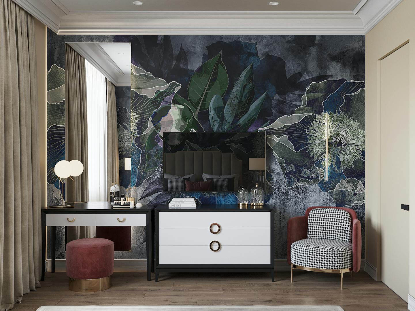 Хозяйка квартиры очень хотела в спальне использовать акцентные цвета, и мы решили остановить свой выбор на обоях с тропическим принтом. Широкий плинтус и молдинги хорошо сочетаются с прикроватными тумбочками и банкеткой с позолоченными элементами.