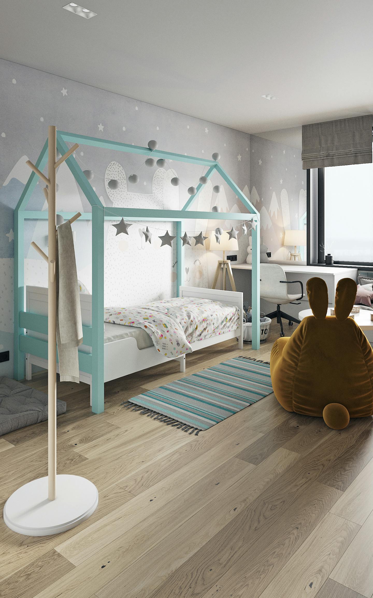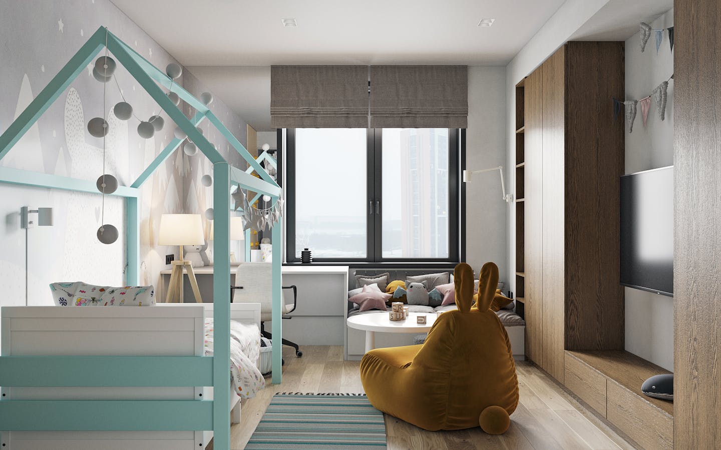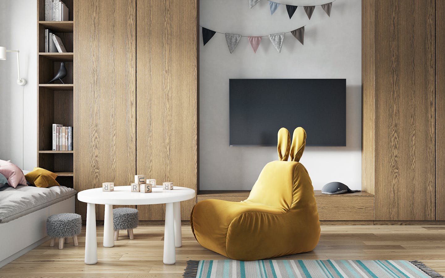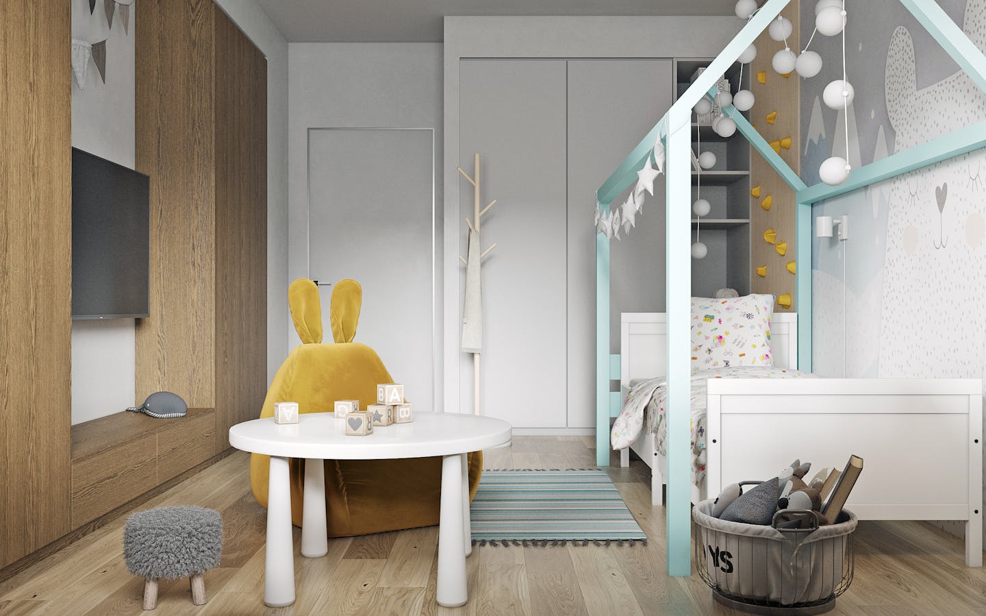 Минималистичный акцентный интерьер для семьи с ребенком.