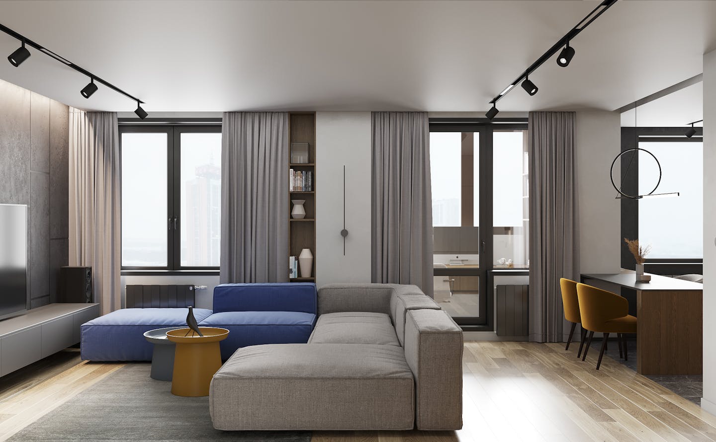 Интересная деталь интерьера — освещение. В кухне-гостиной — оригинальная люстра. В помещениях есть споты и качественные трековые светильники в стенах и потолке. Основной гамма интерьера — ахроматическая, но серую палитру удачно разбавляют акценты в виде синего дивана или горчичного журнального столика.