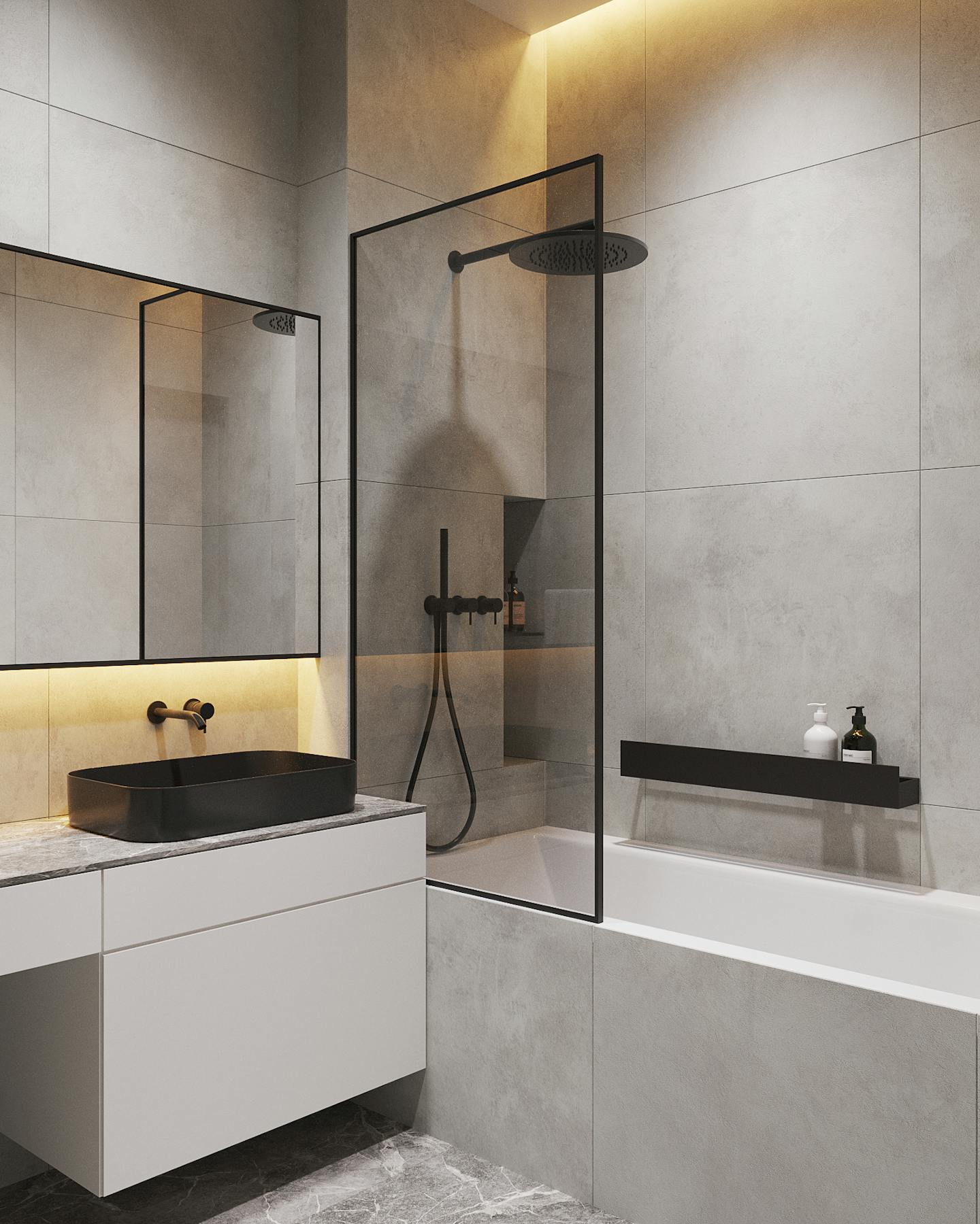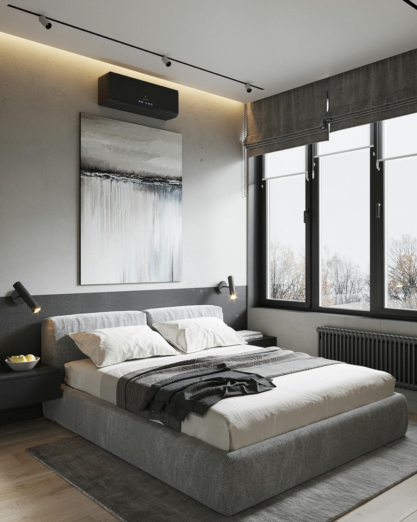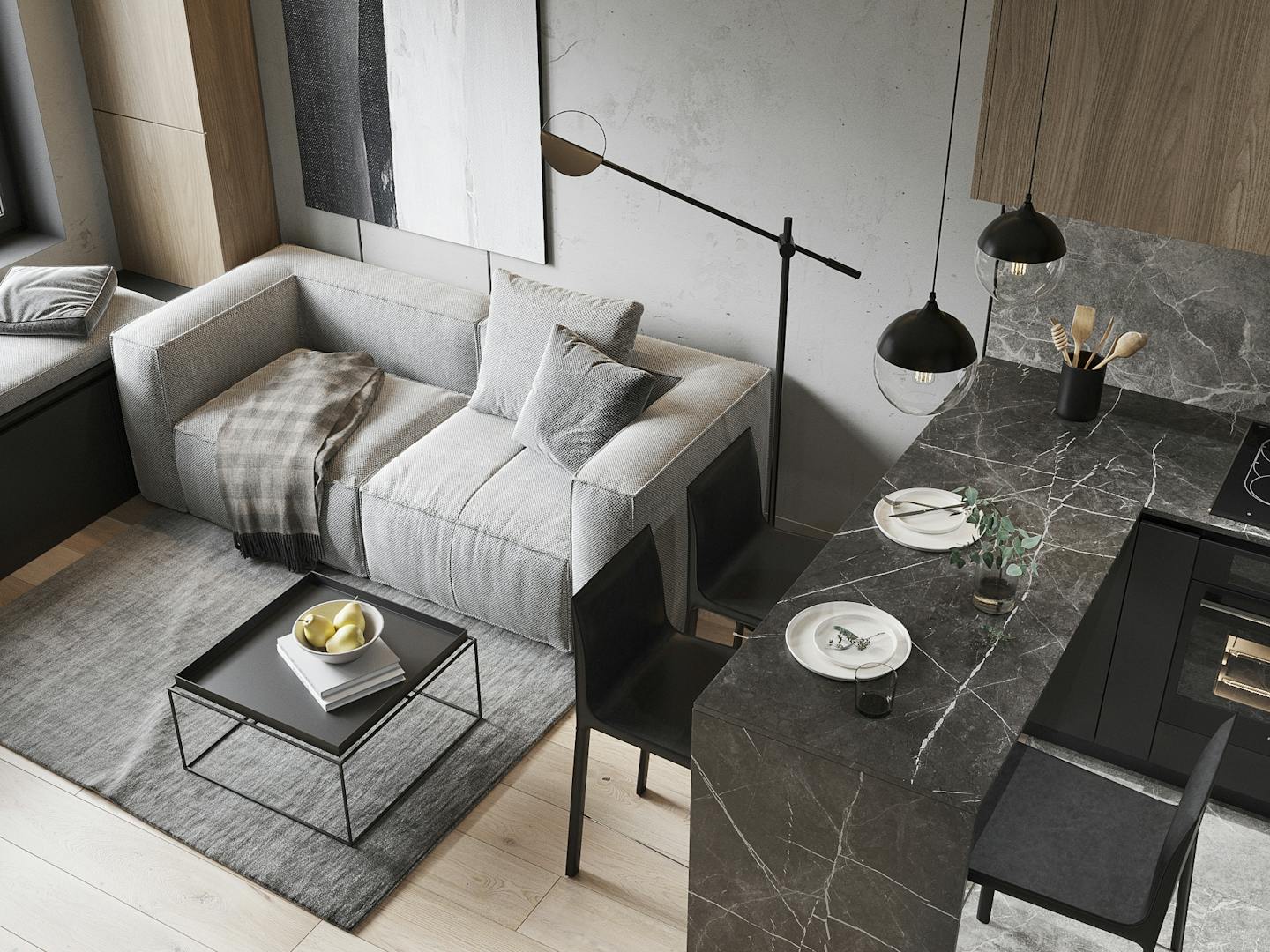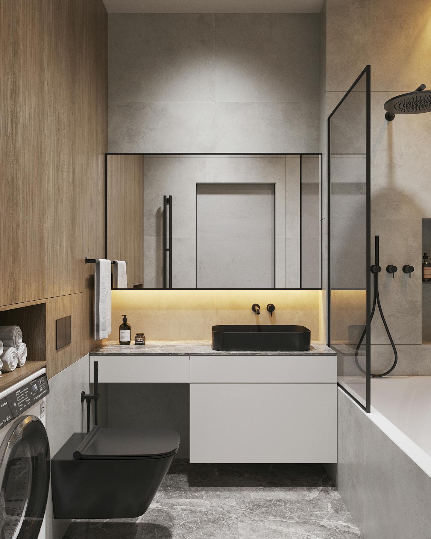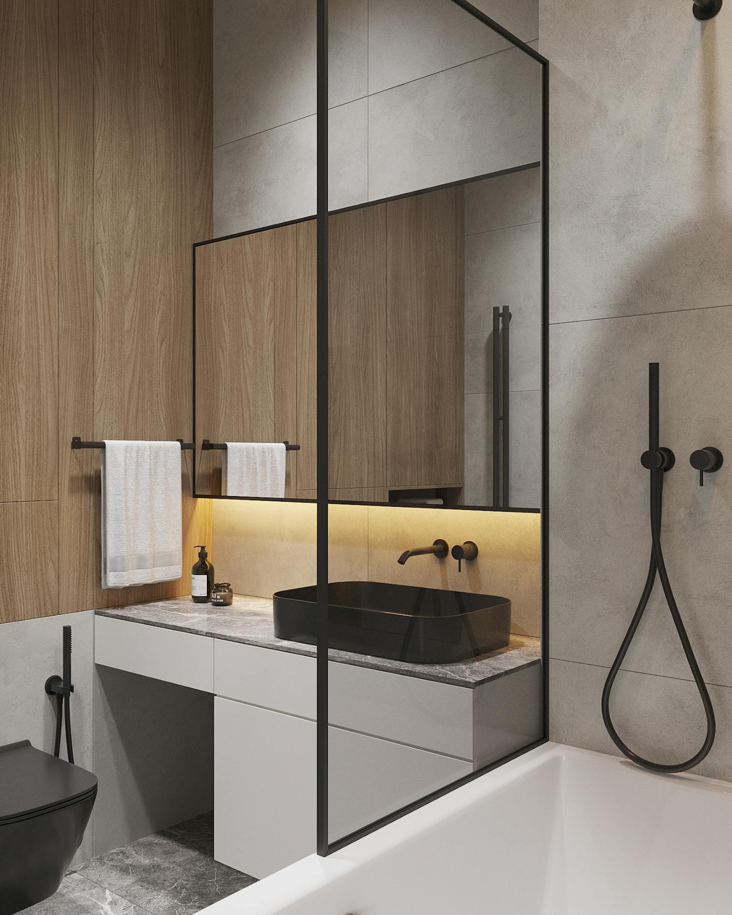 «Брутальность» интерьера разбавляют декоративные элементы и текстиль. Графичности придают черные акценты в виде светильников, аксессуаров и дверных ручек.