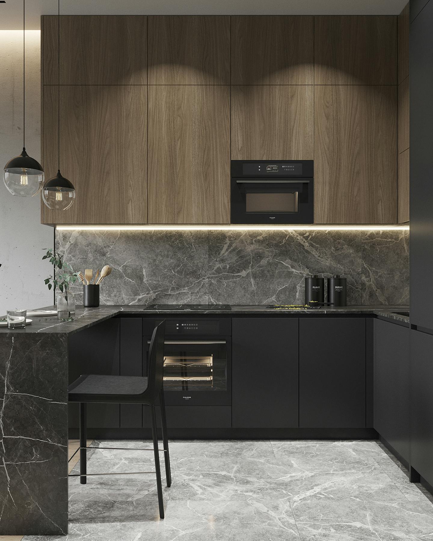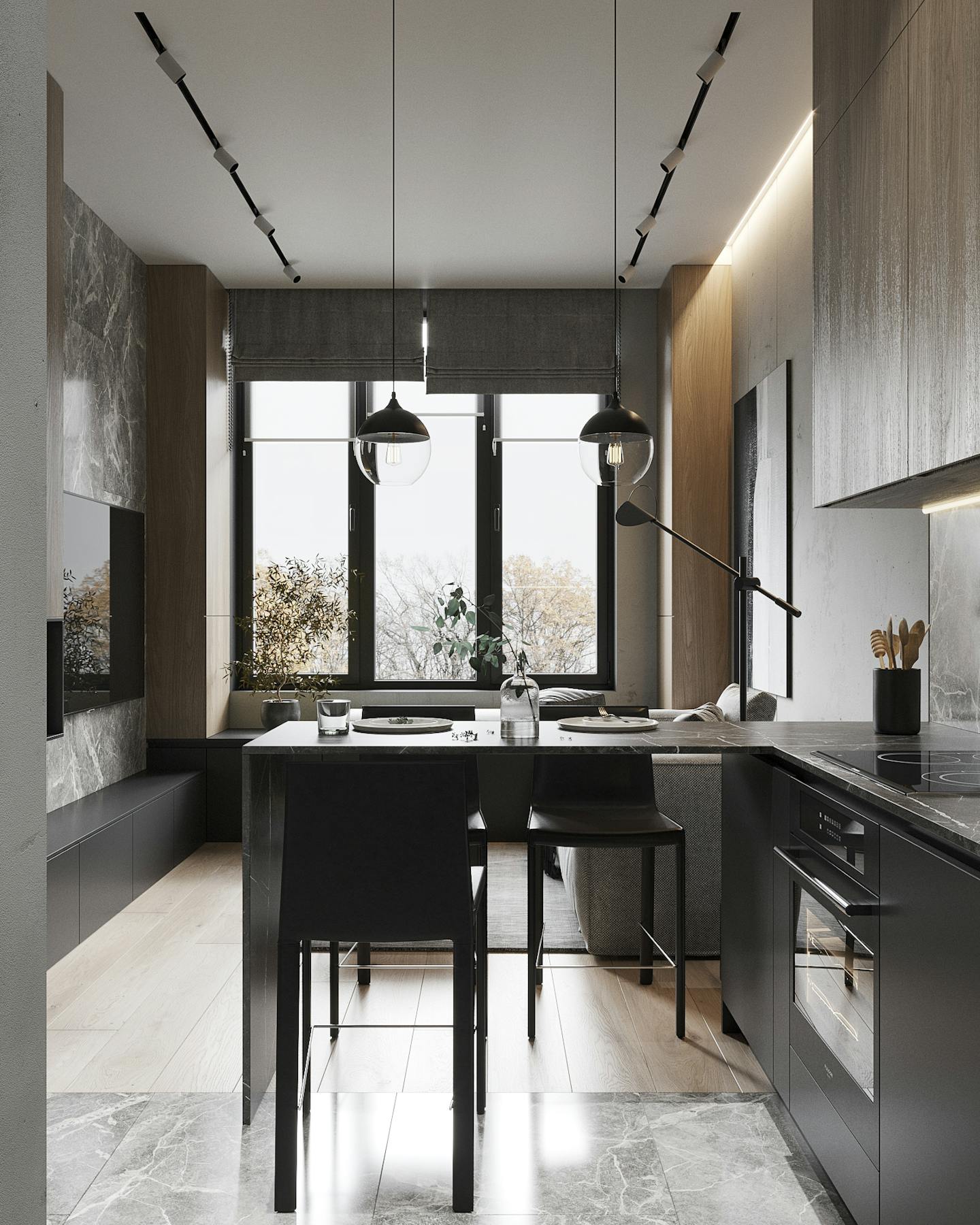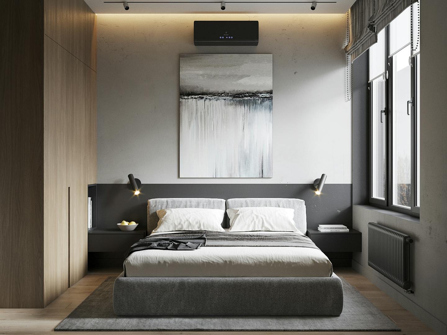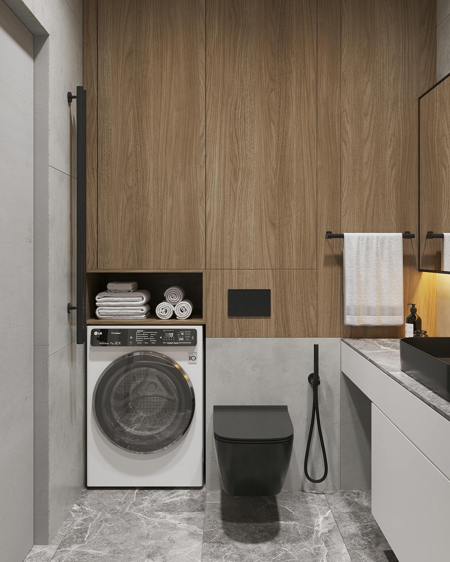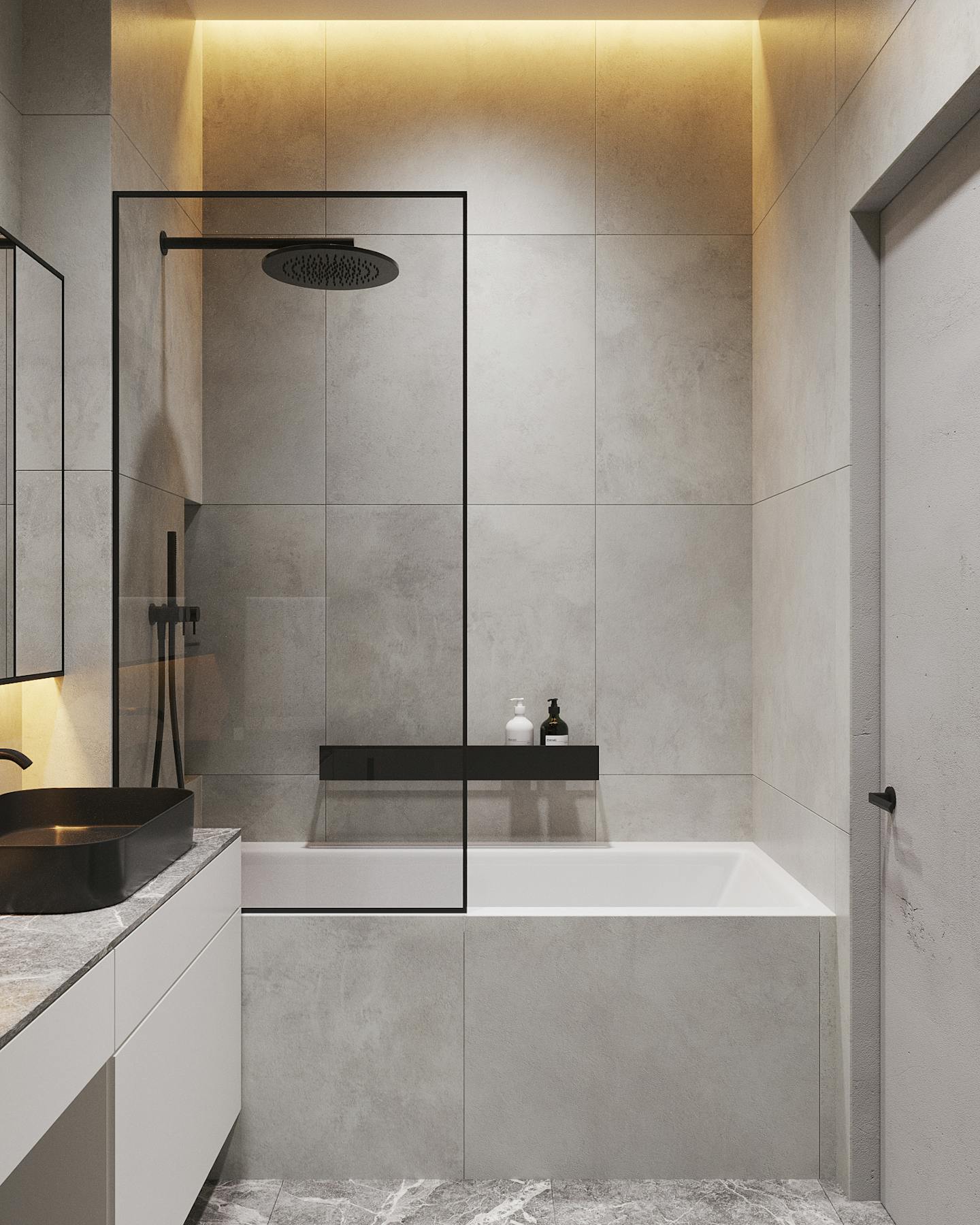 «Брутальность» интерьера разбавляют декоративные элементы и текстиль. Графичности придают черные акценты в виде светильников, аксессуаров и дверных ручек.