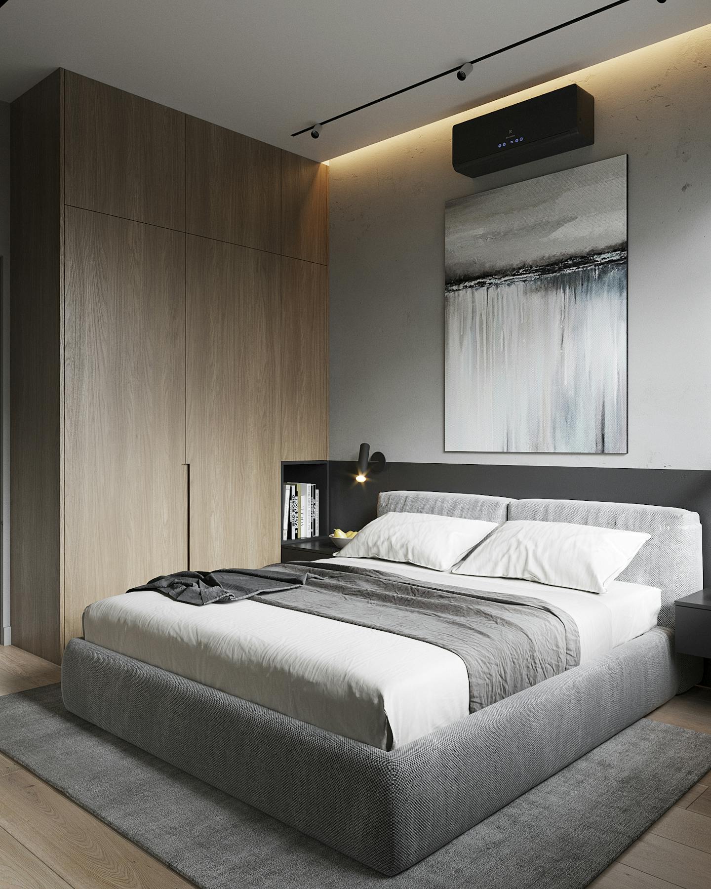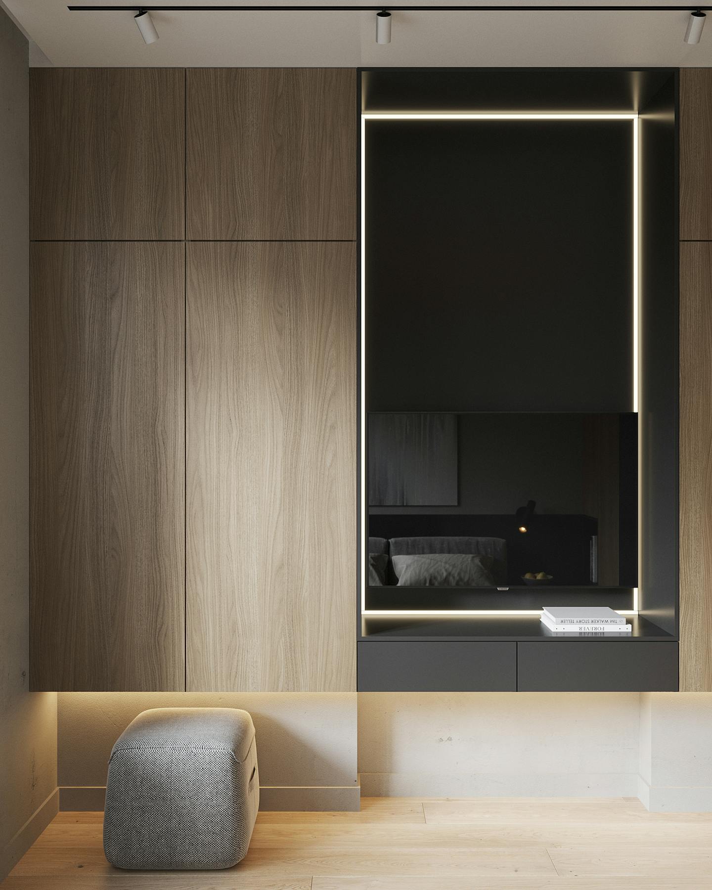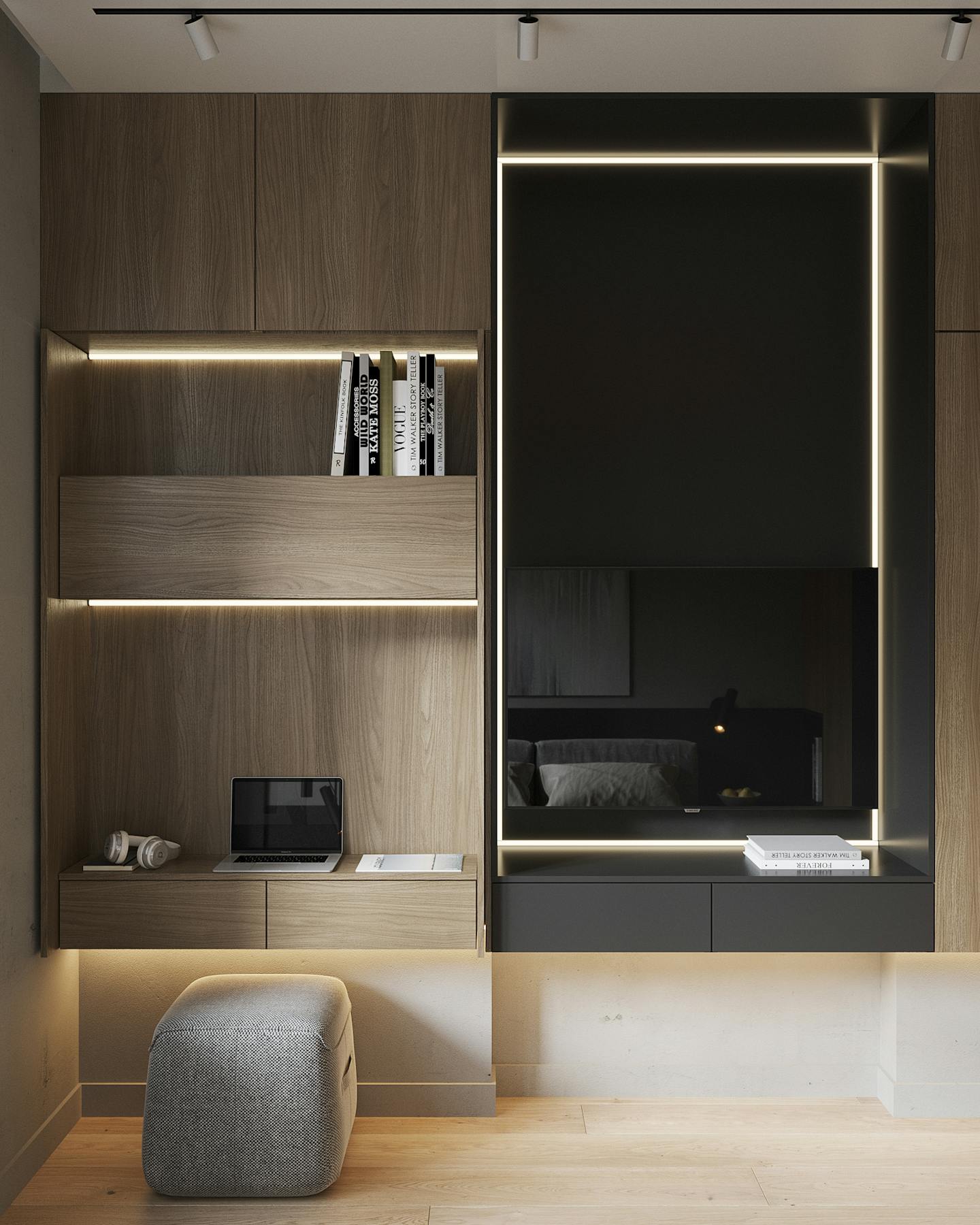 В спальне, чтобы не разбивать монолитность гарнитура, рабочее место сделали скрытым от глаз за дверцами шкафа. Все места для хранения по максимуму спрятаны и изолированы.