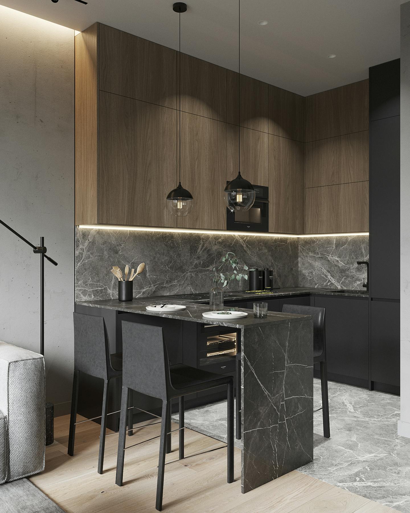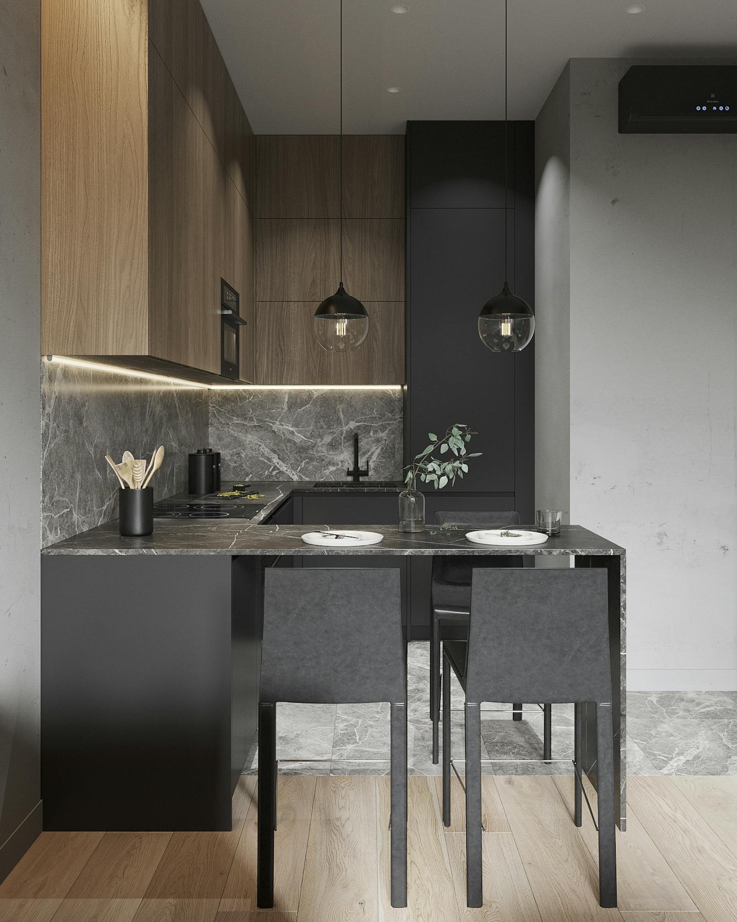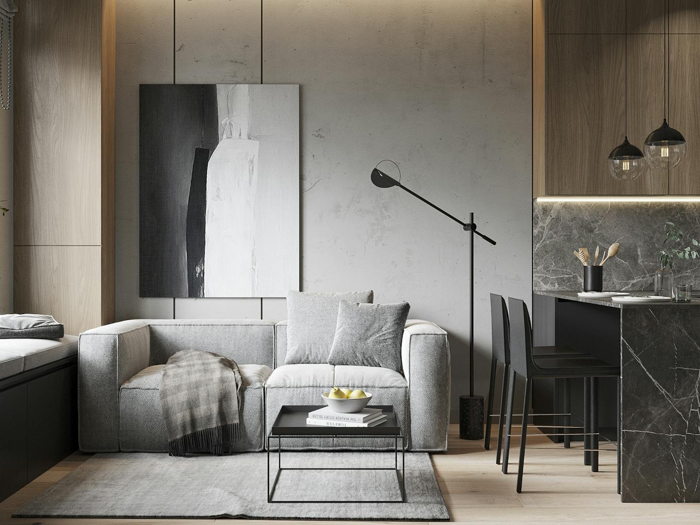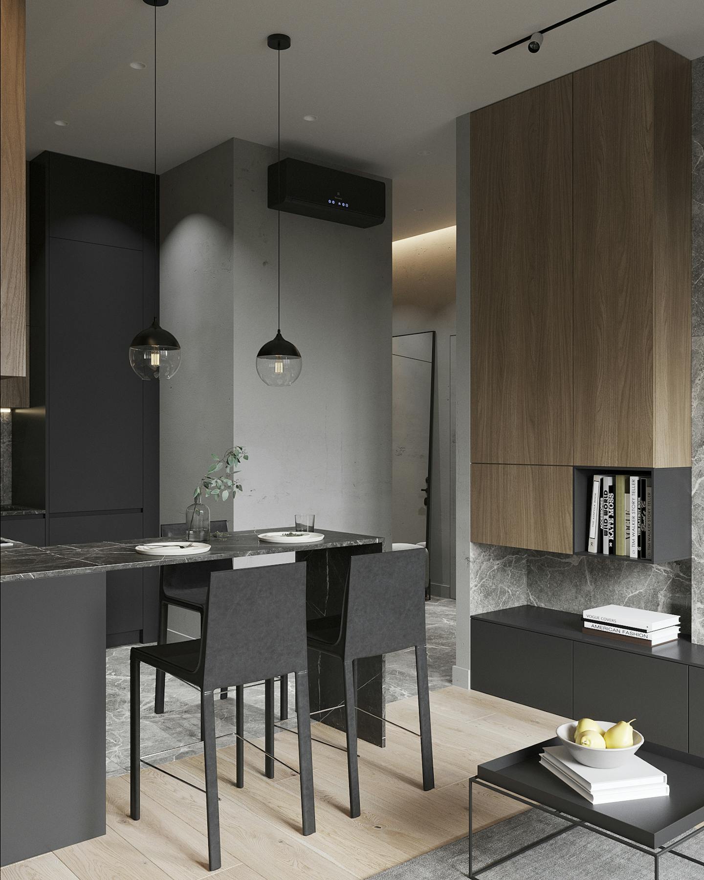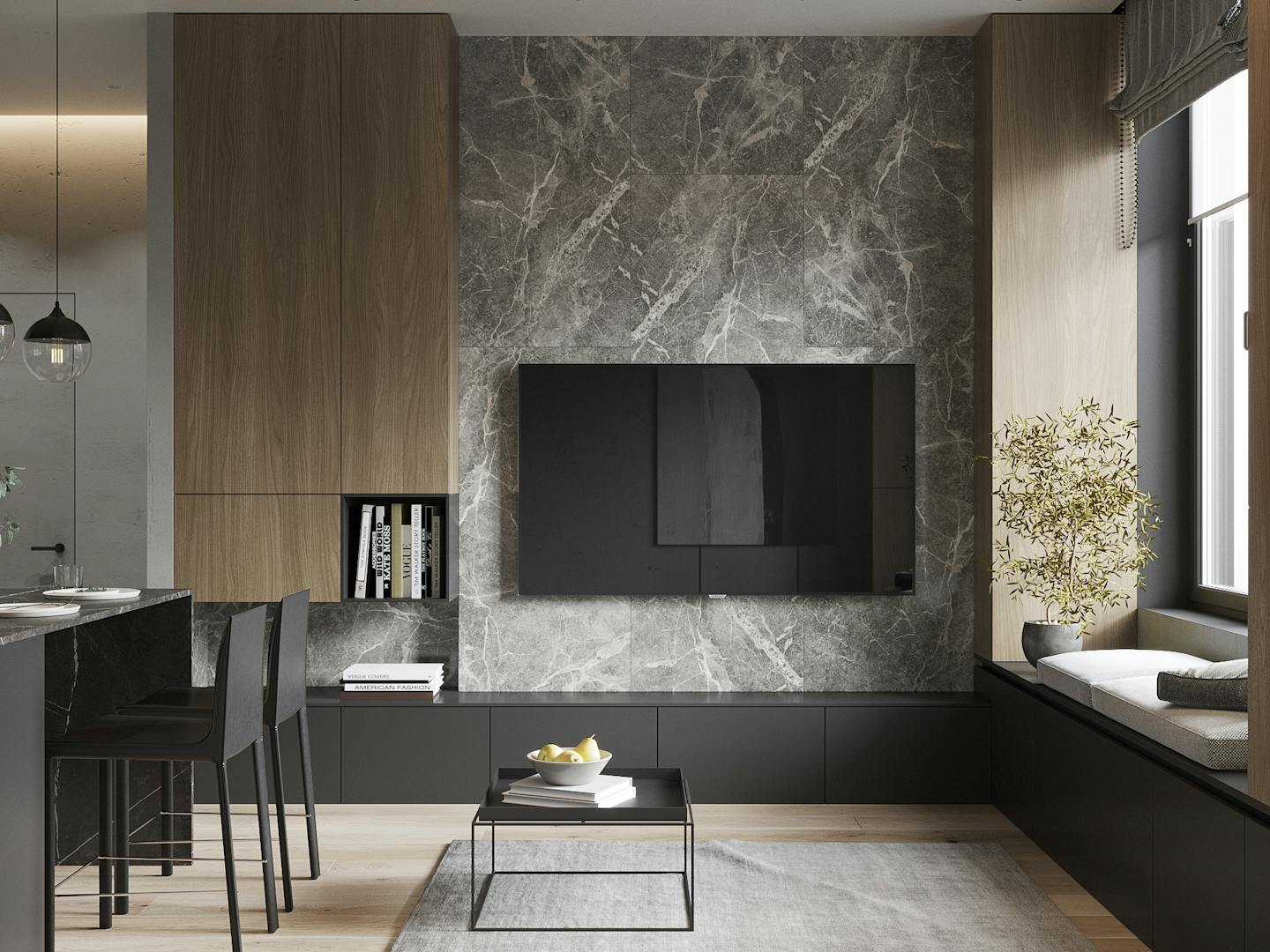 Основные материалы интерьера — бетон и дерево. Кухня получилась небольшой, но в ней есть вся необходимая для жизни техника и барная стойка, которую можно при желании использовать как рабочую поверхность. Фартук, барная стойка и зона за ТВ выполнены из итальянского керамогранита. Небольшой диван компенсирует широкий подоконник, который можно использовать в качестве дополнительного места для отдыха. По желанию заказчика предусмотрели сплит систему.