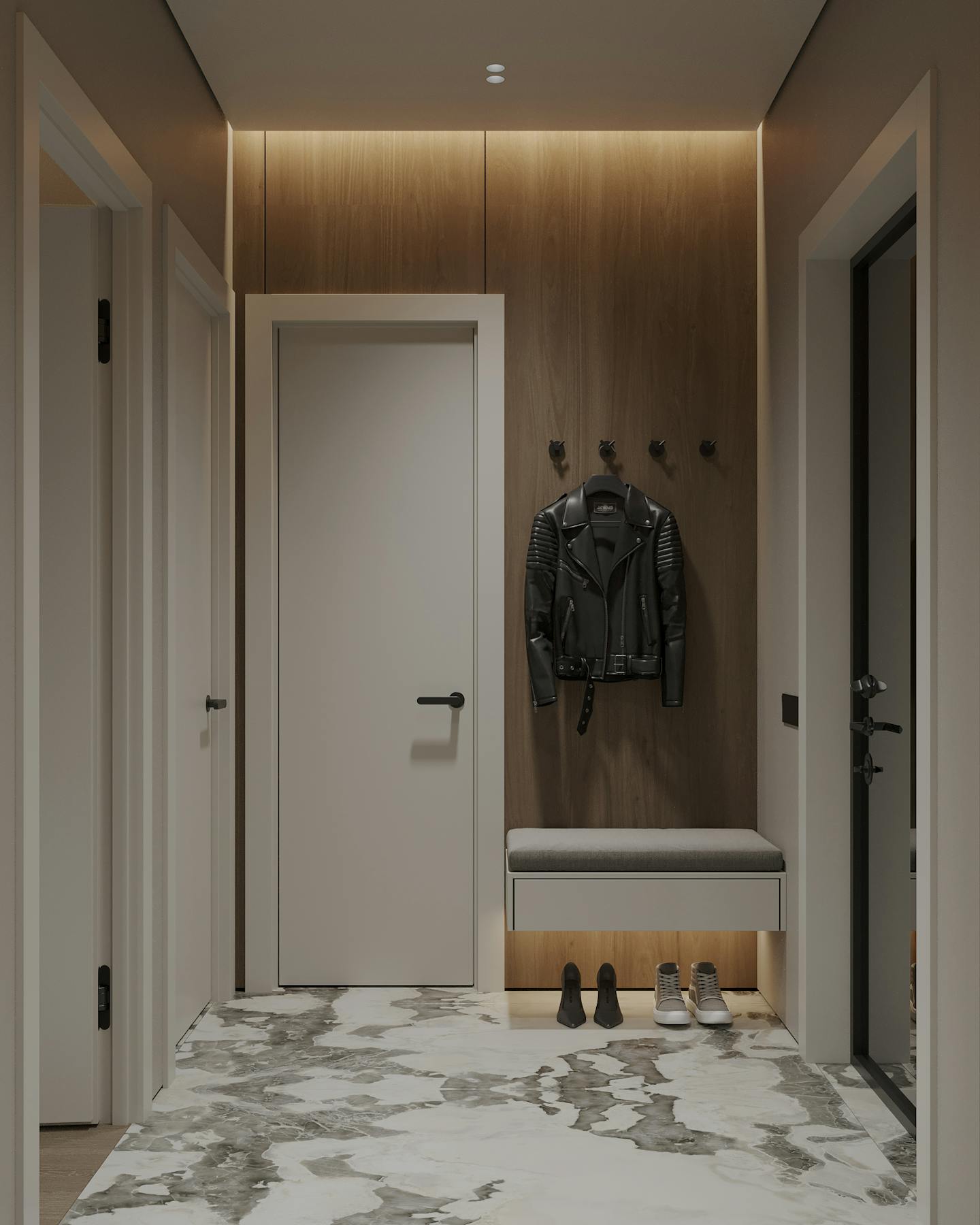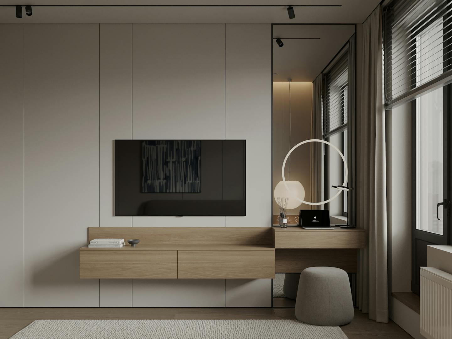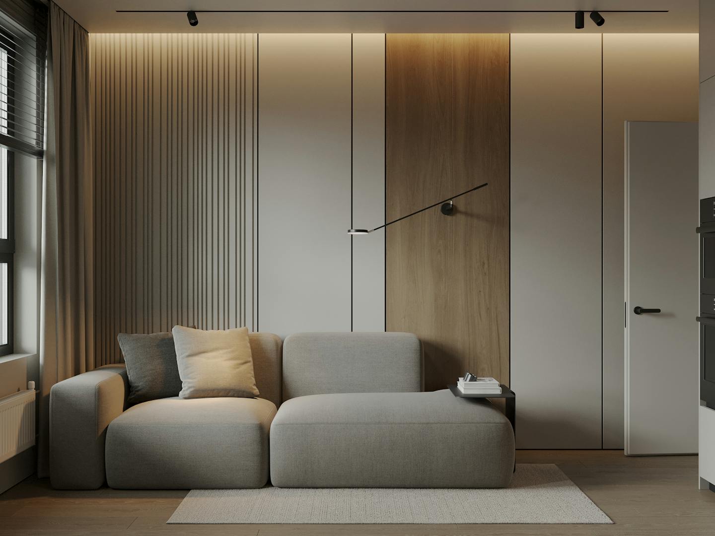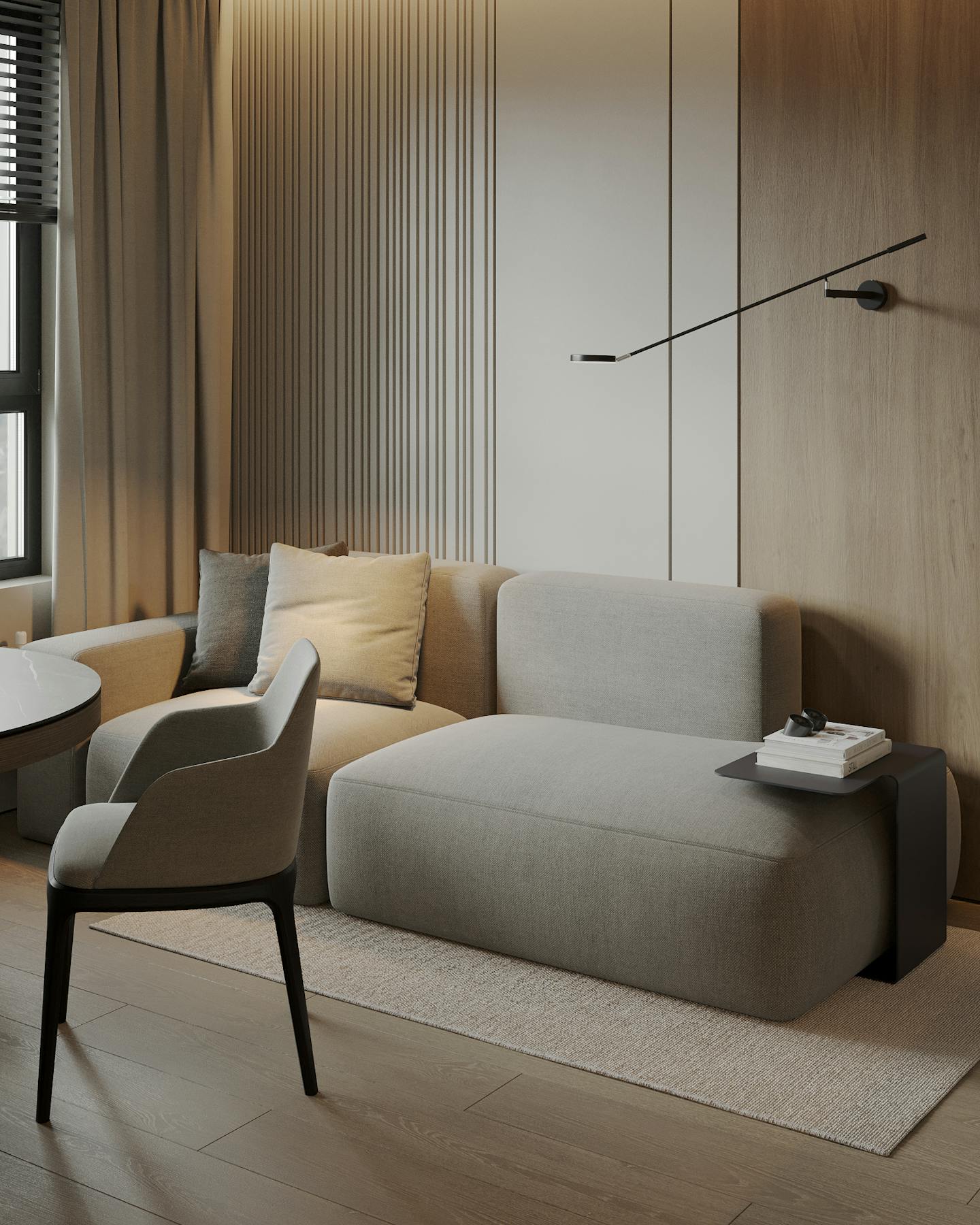 Основная идея проекта — создание интерьера в современном стиле с использованием нейтральных светлых оттенков. Для придания теплоты и уюта используются элементы из дерева и теплая подсветка.