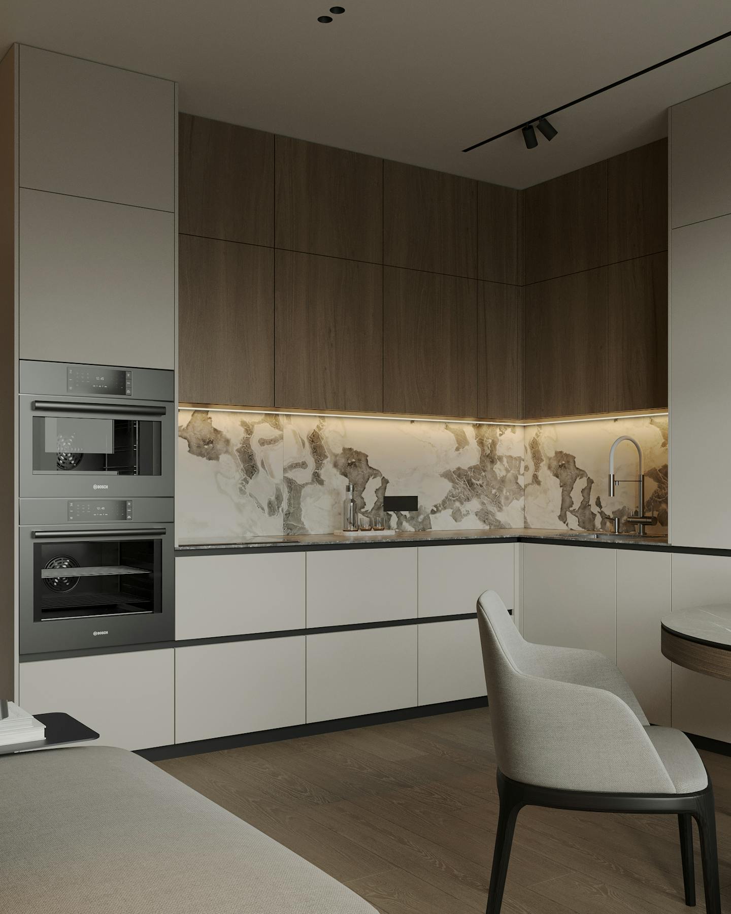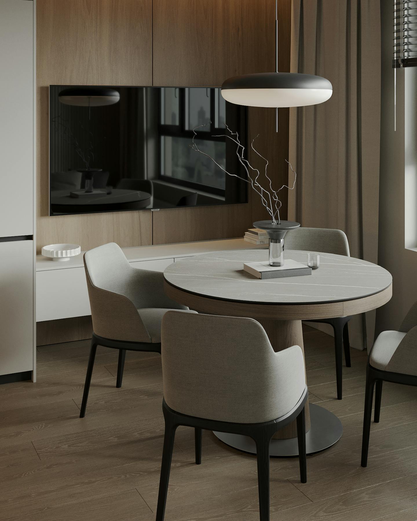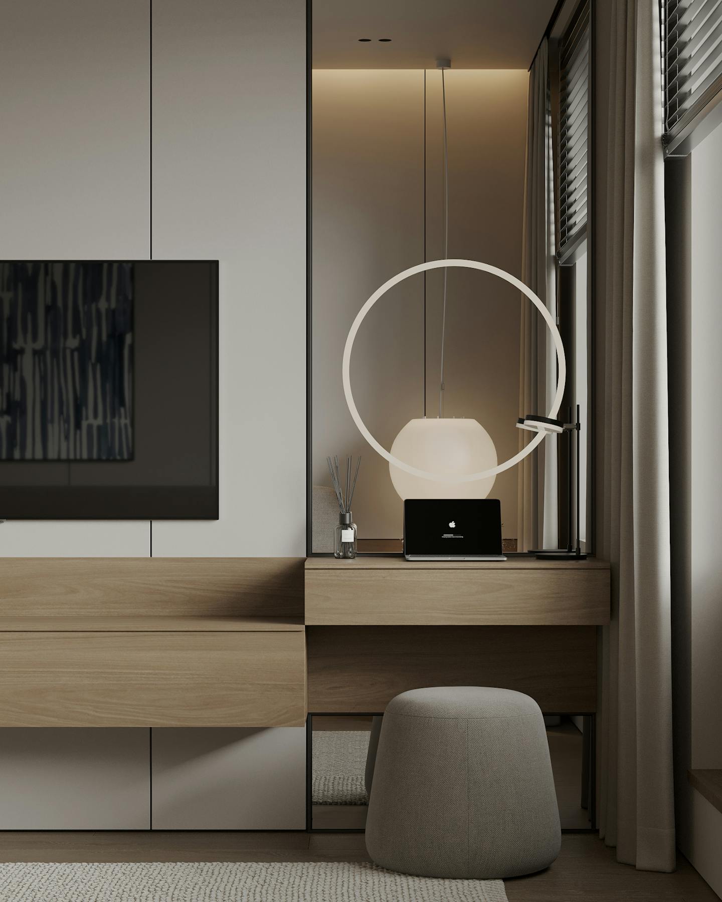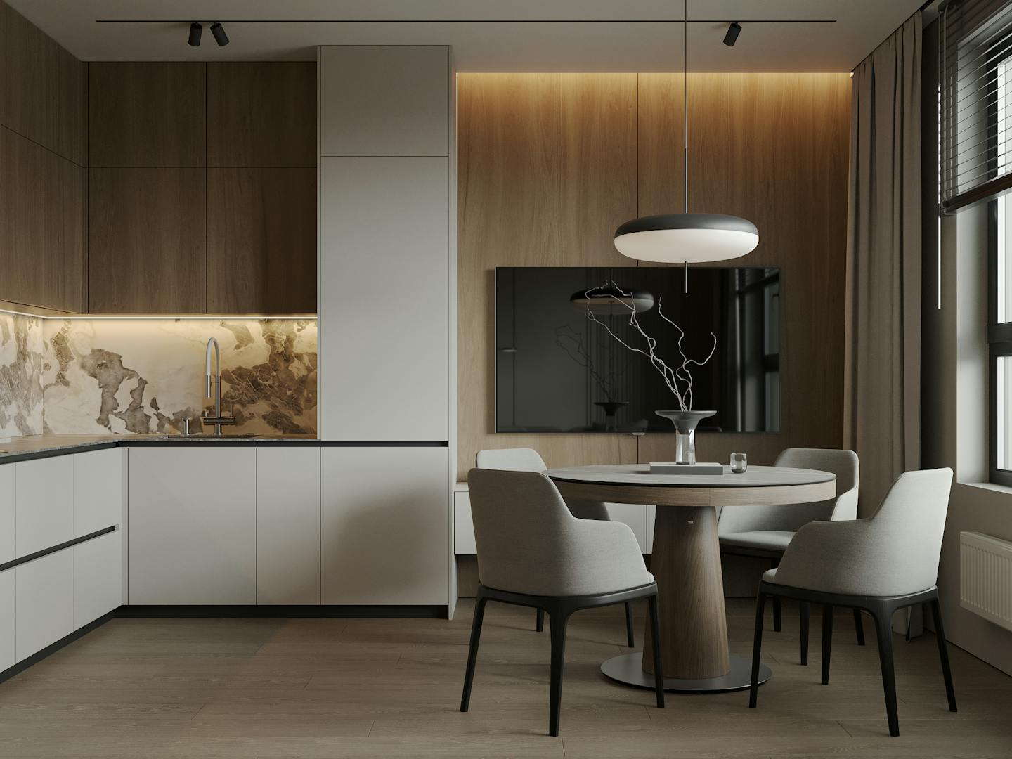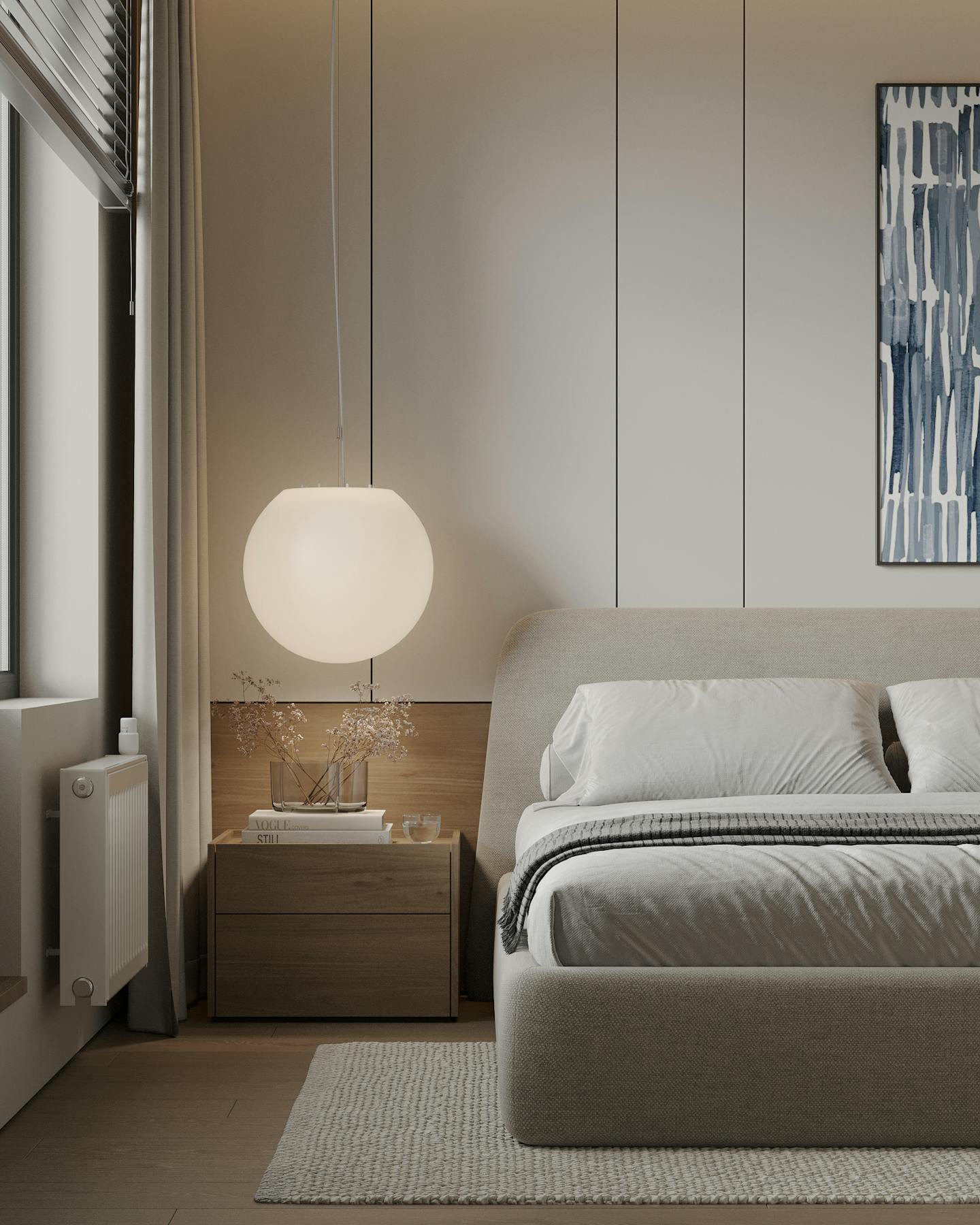 Основная идея проекта — создание интерьера в современном стиле с использованием нейтральных светлых оттенков. Для придания теплоты и уюта используются элементы из дерева и теплая подсветка.