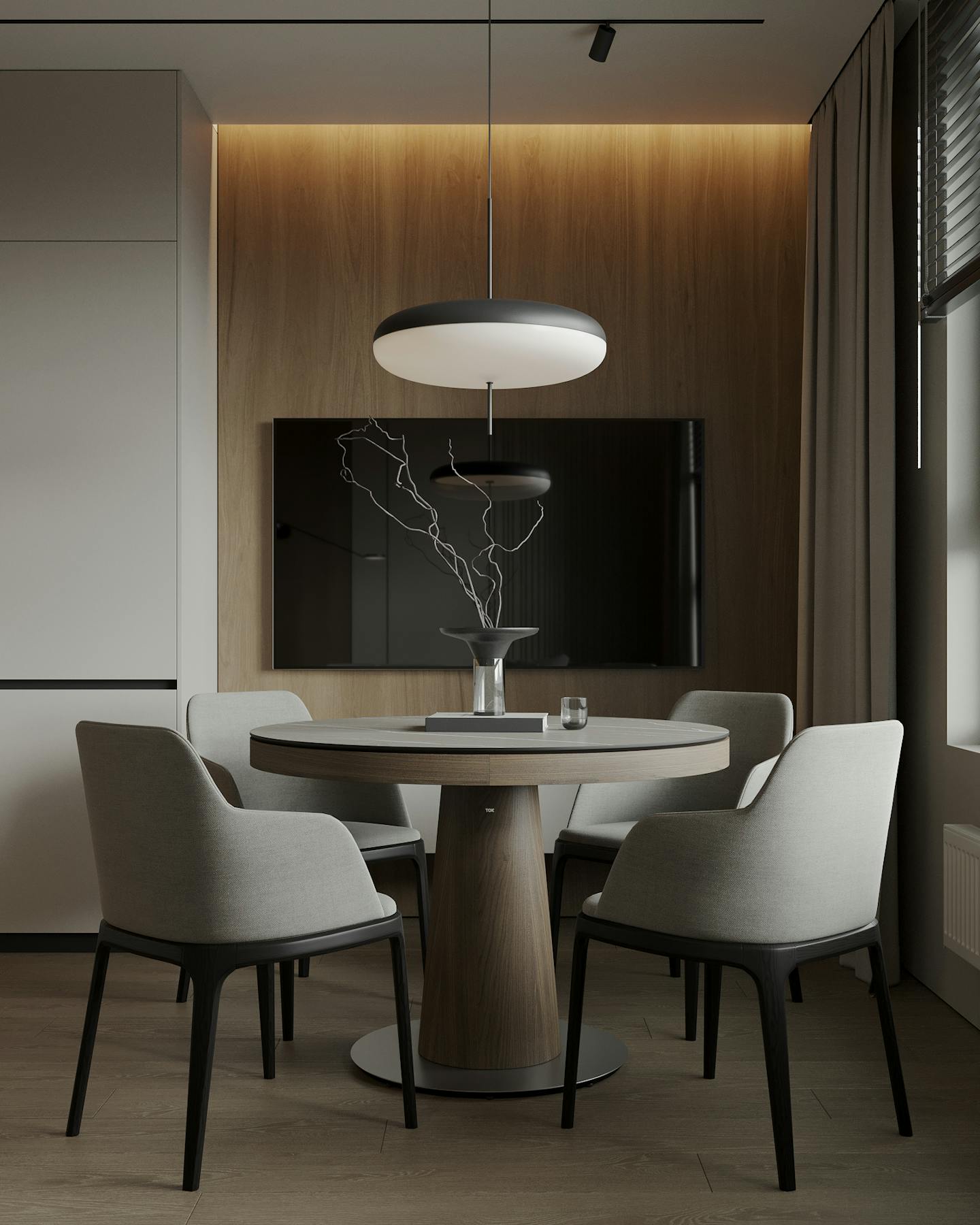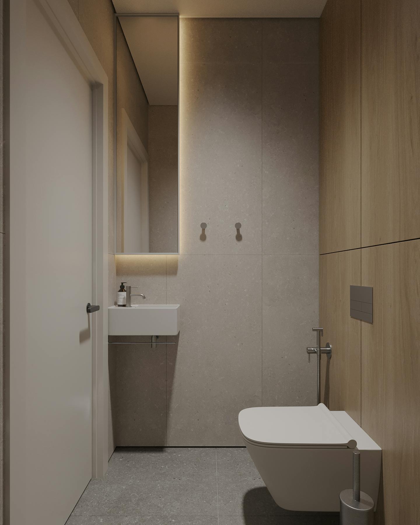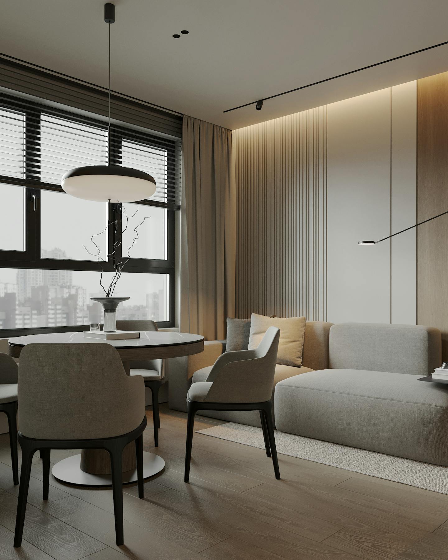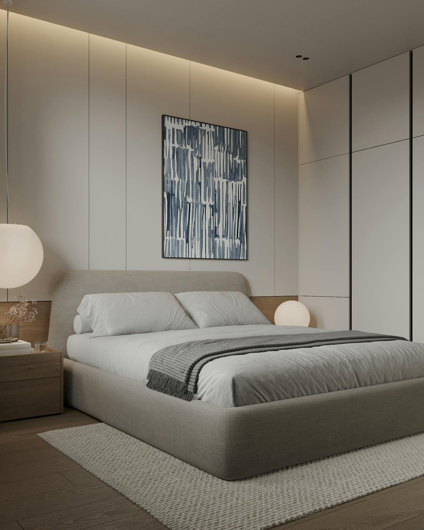 Основная идея проекта — создание интерьера в современном стиле с использованием нейтральных светлых оттенков. Для придания теплоты и уюта используются элементы из дерева и теплая подсветка.