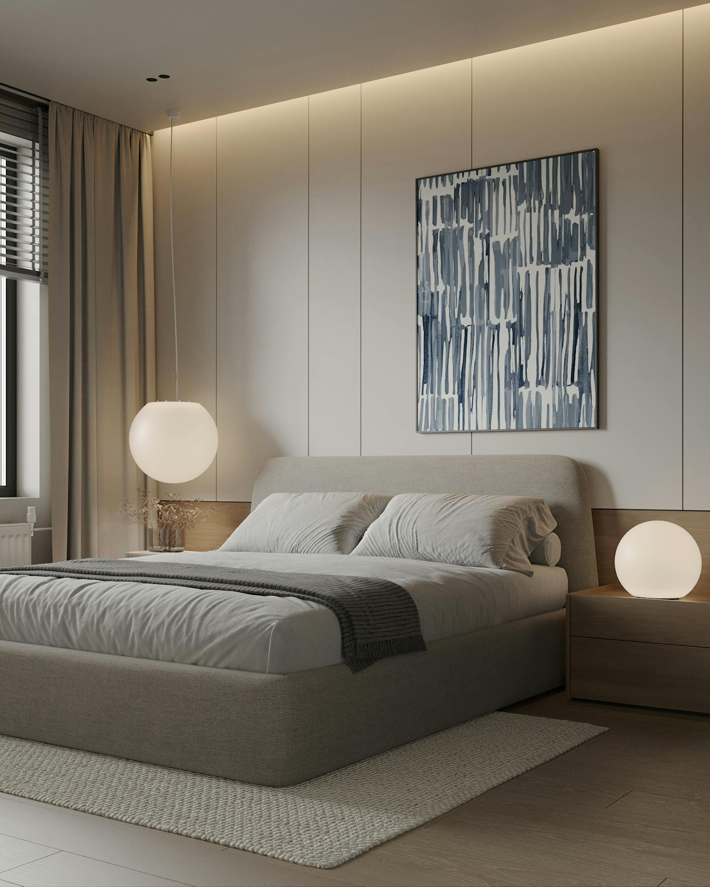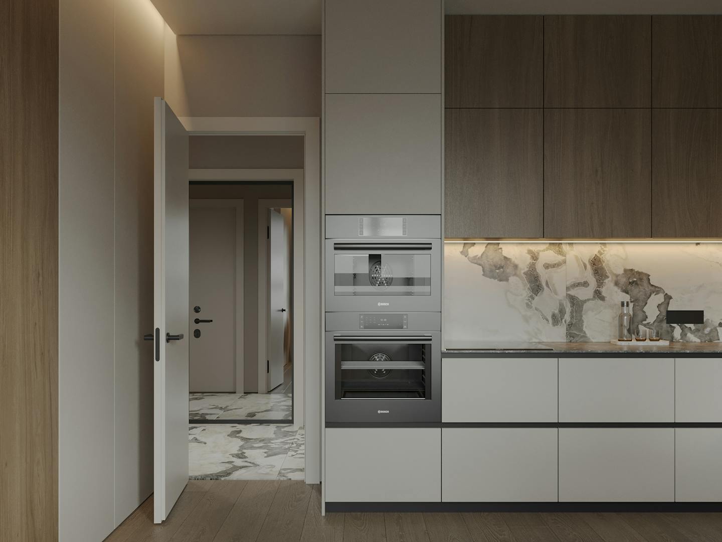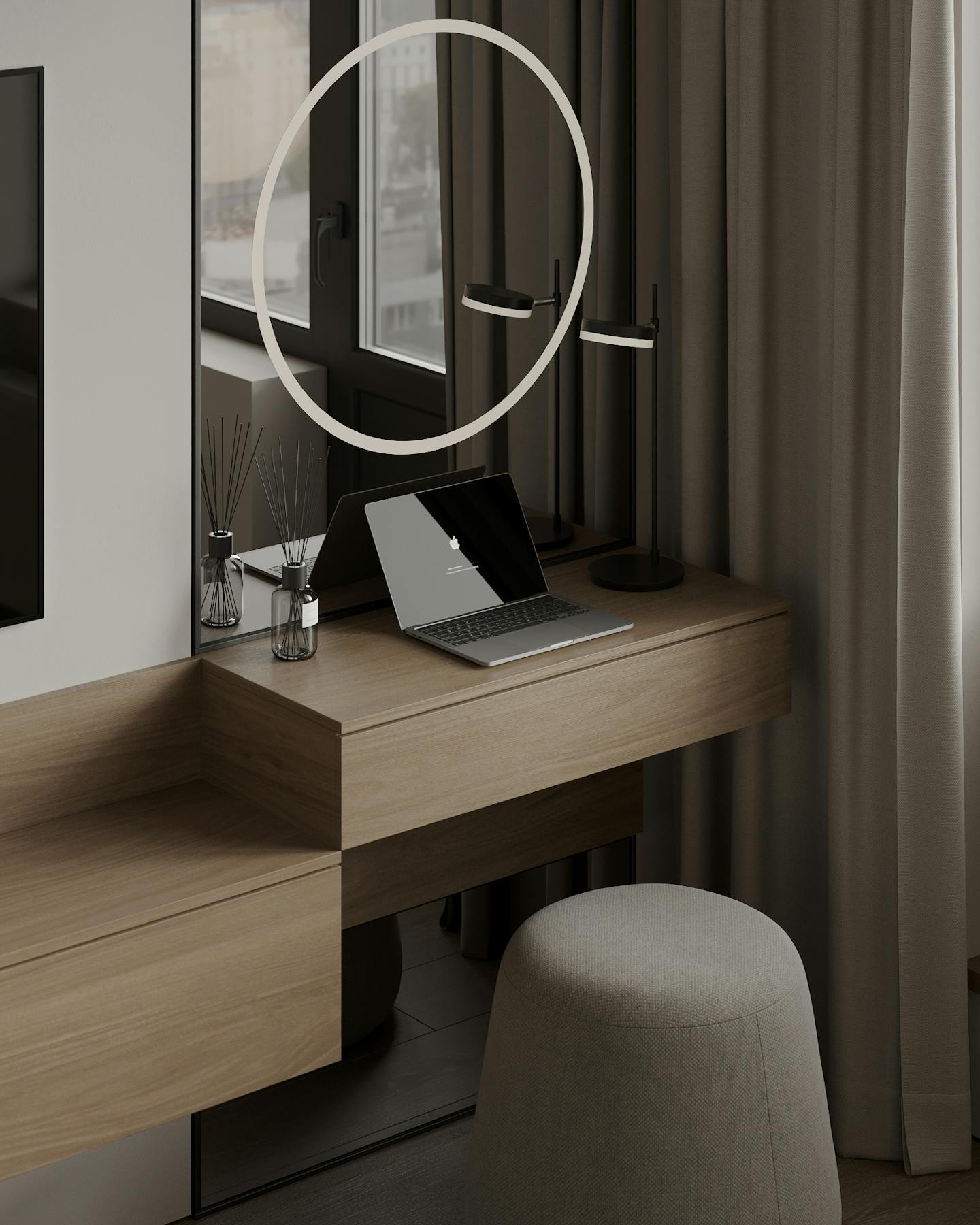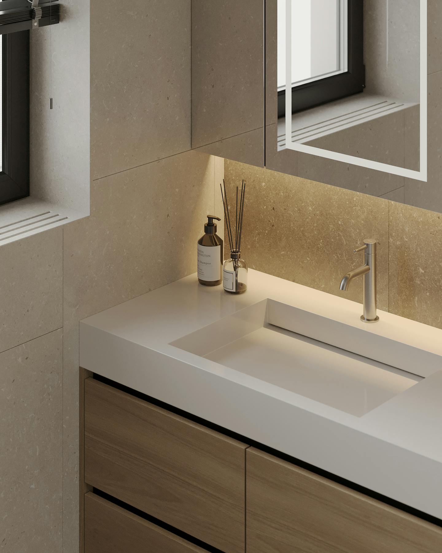 Основная идея проекта — создание интерьера в современном стиле с использованием нейтральных светлых оттенков. Для придания теплоты и уюта используются элементы из дерева и теплая подсветка.
