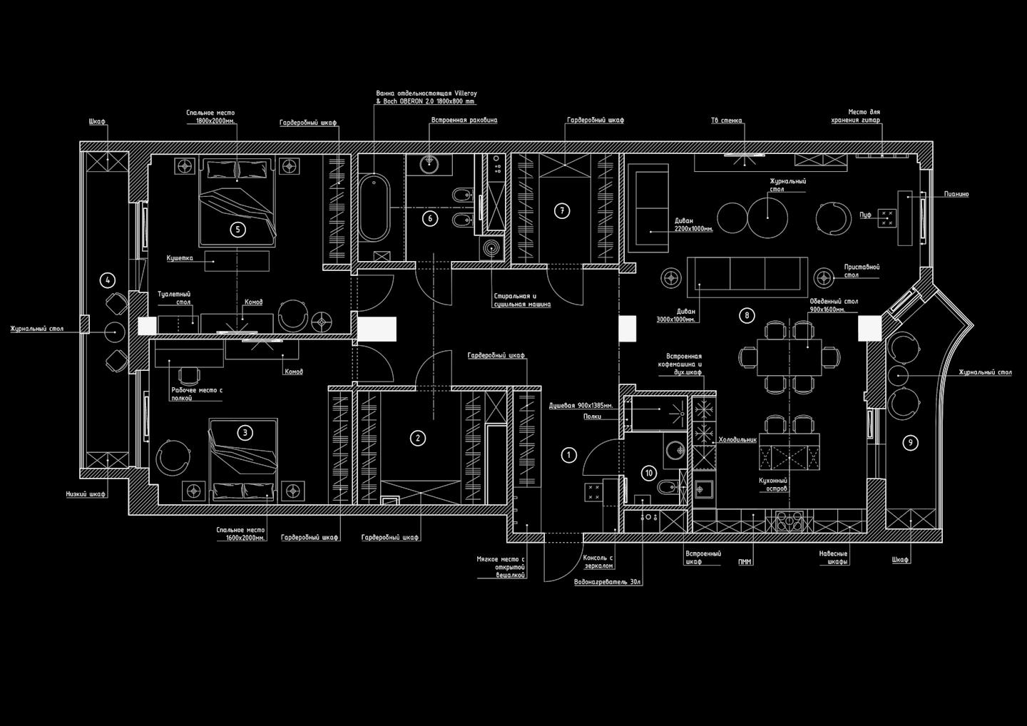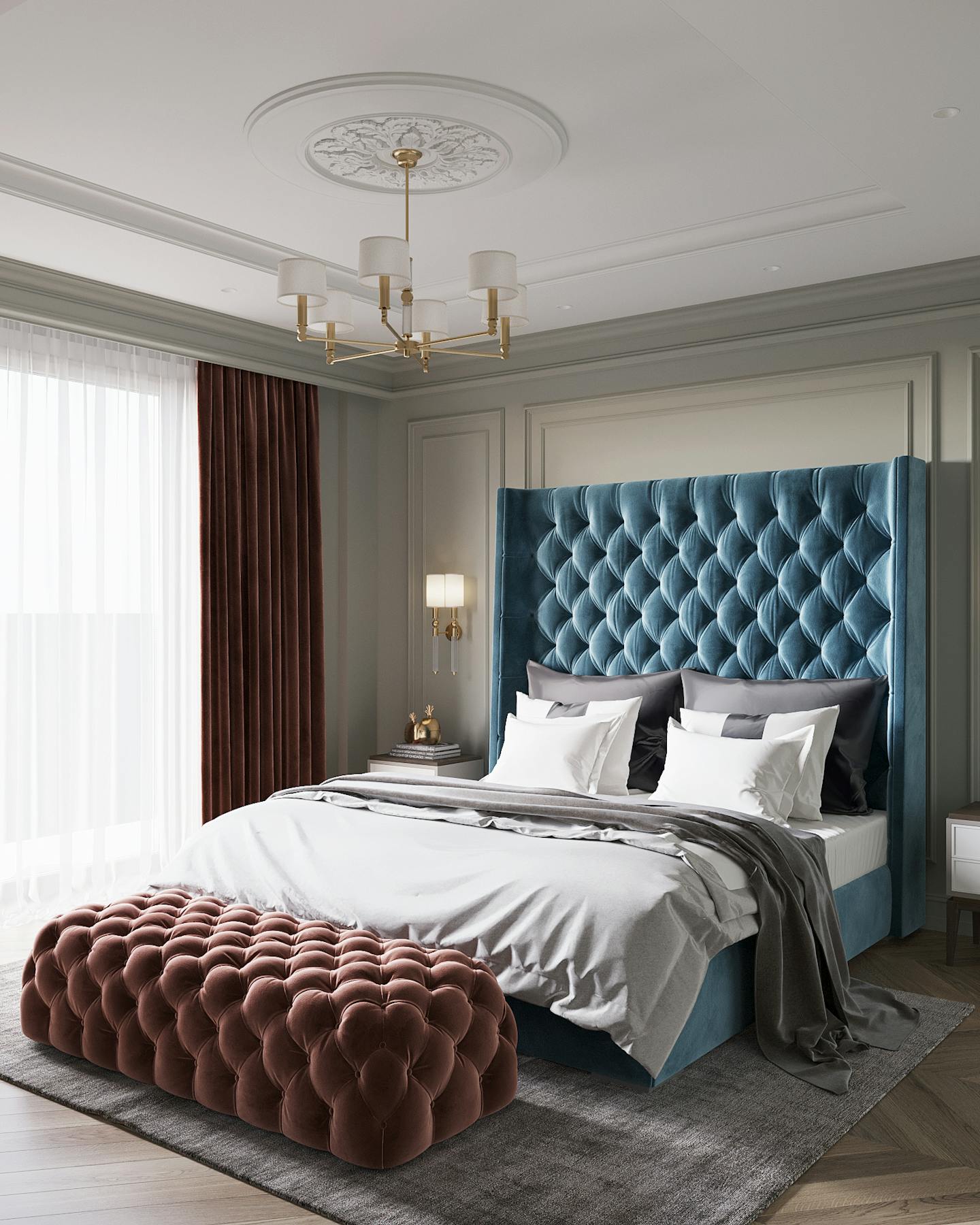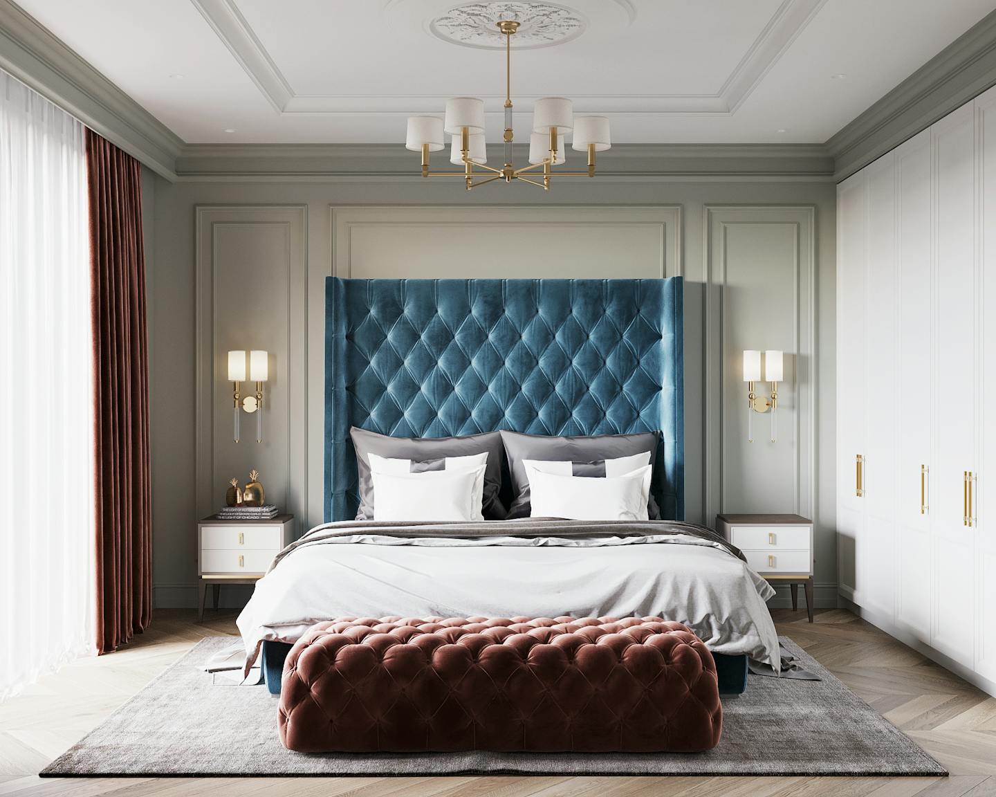 Привлекает к себе внимание и меблировка комнат: классические формы, большие размеры, каретная стяжка, богатая фурнитура в виде золота подчеркивают вкус и статус заказчиков. Несравненным залогом удачного проекта стало количество и площадь окон, через которые попадает большое количество света в дневное время, а также использование современного освещения и зеркал. Это добавляет квартире и отдельным её комнатам визуально больше площади и свежести.