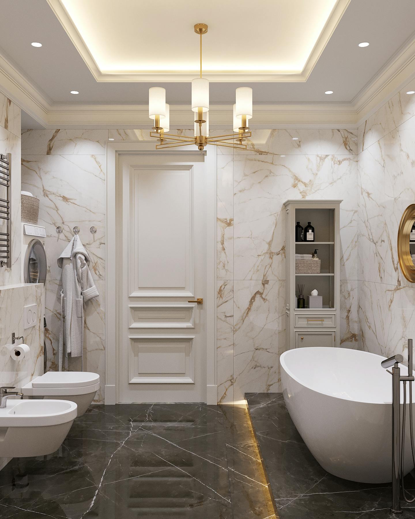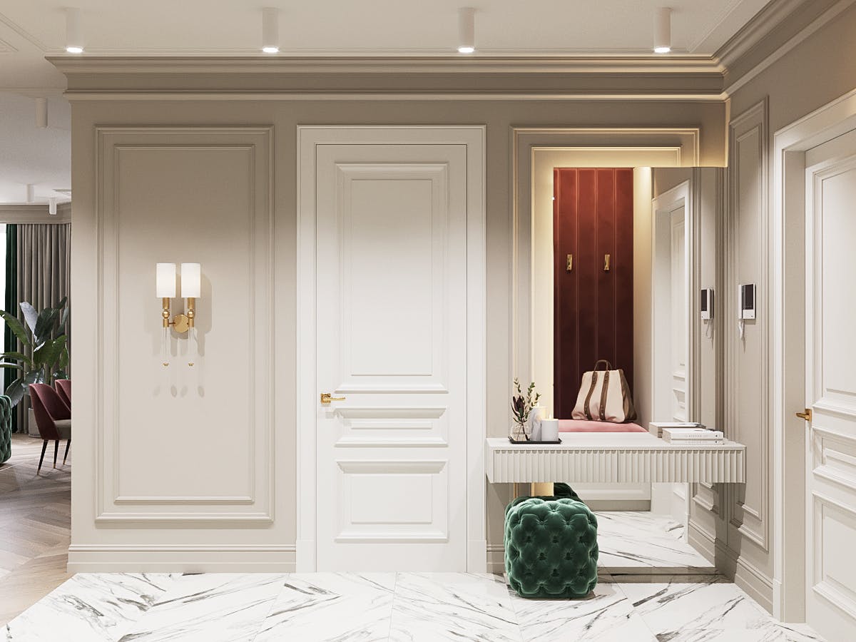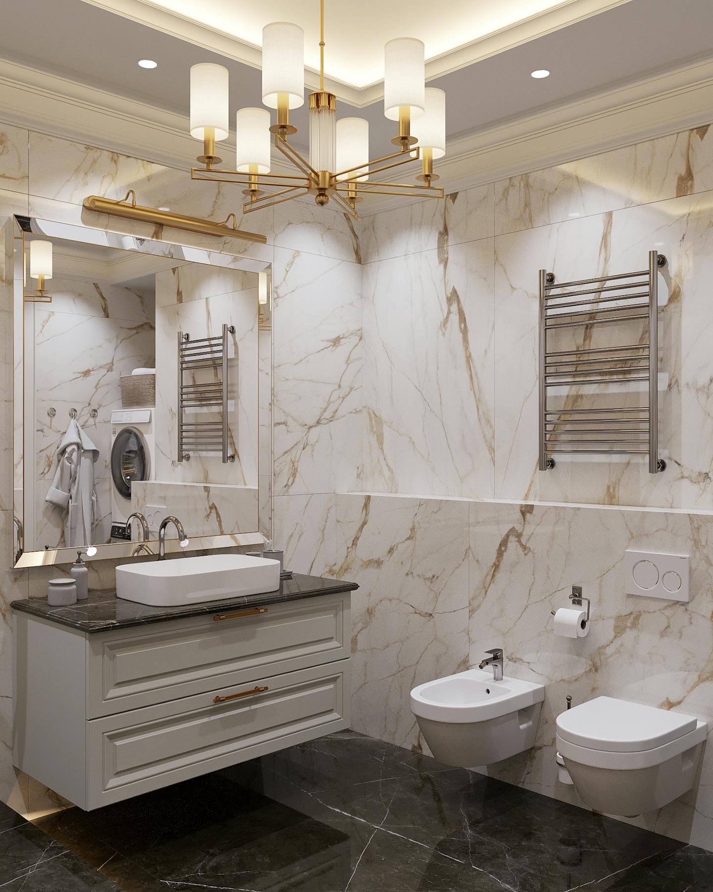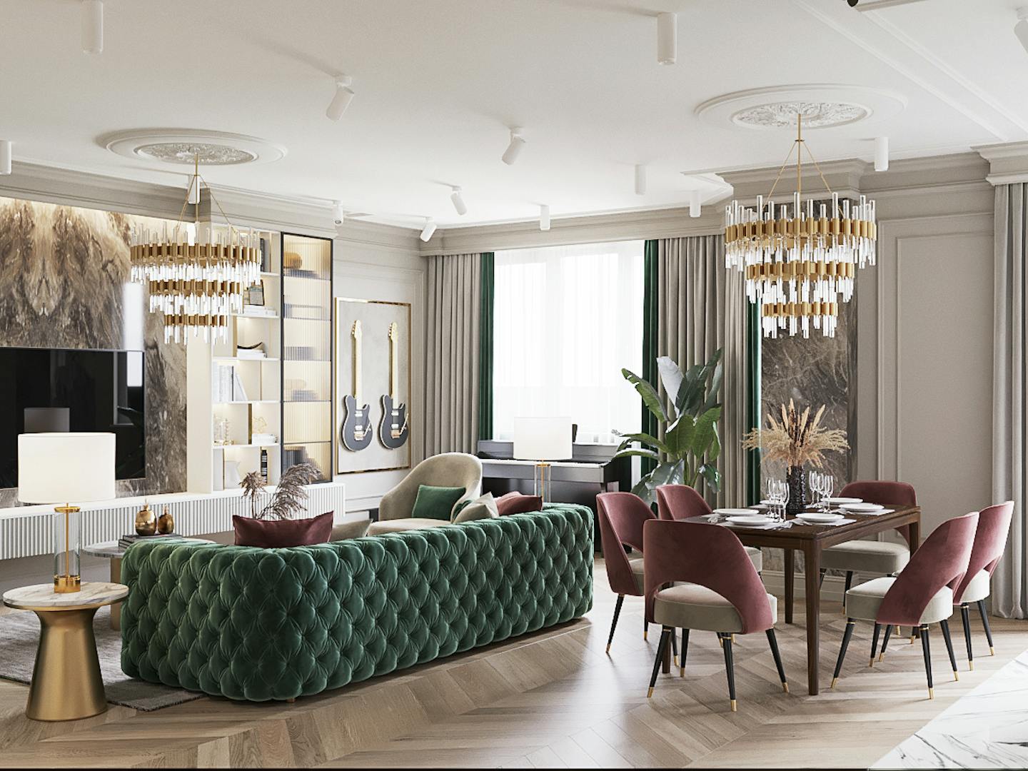Роскошь мрамора, большое количество мебели с дорогой обивкой, классического декора, золотой фурнитуры и светильников — всё это в проекте Рэд, большой просторной квартиры для пары с ребенком.