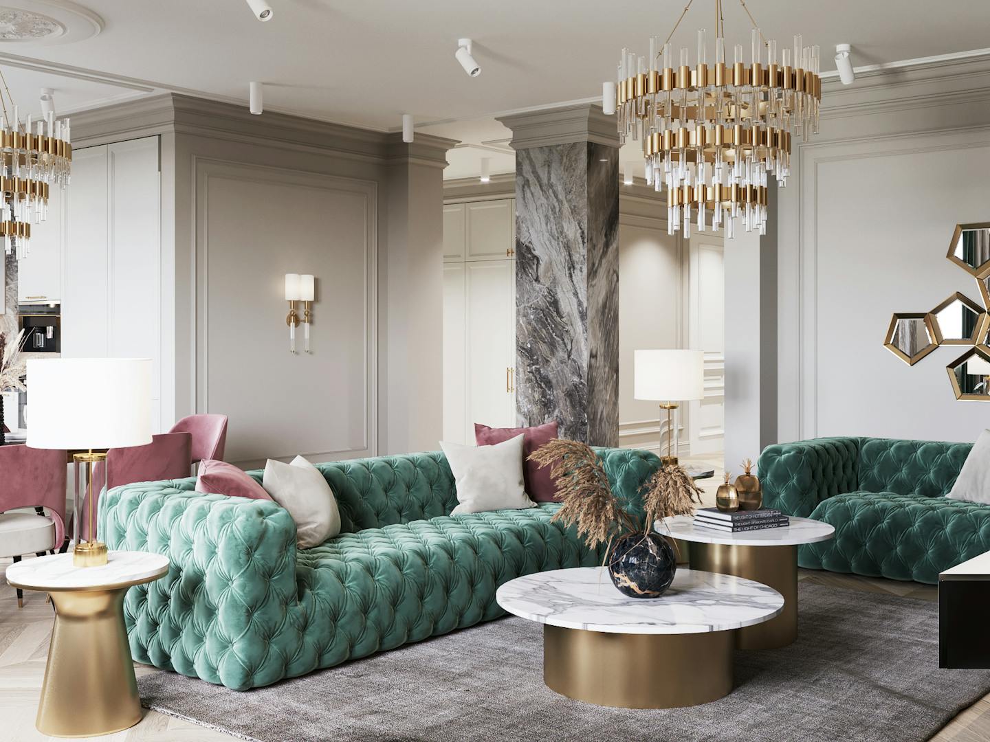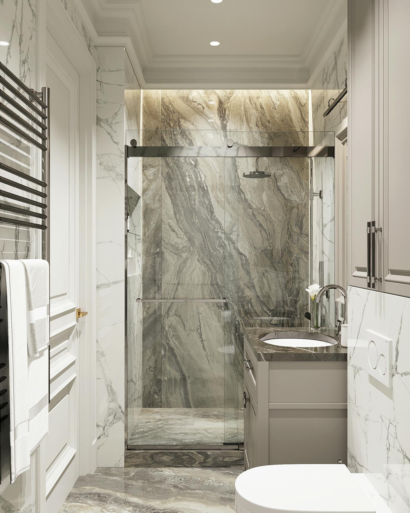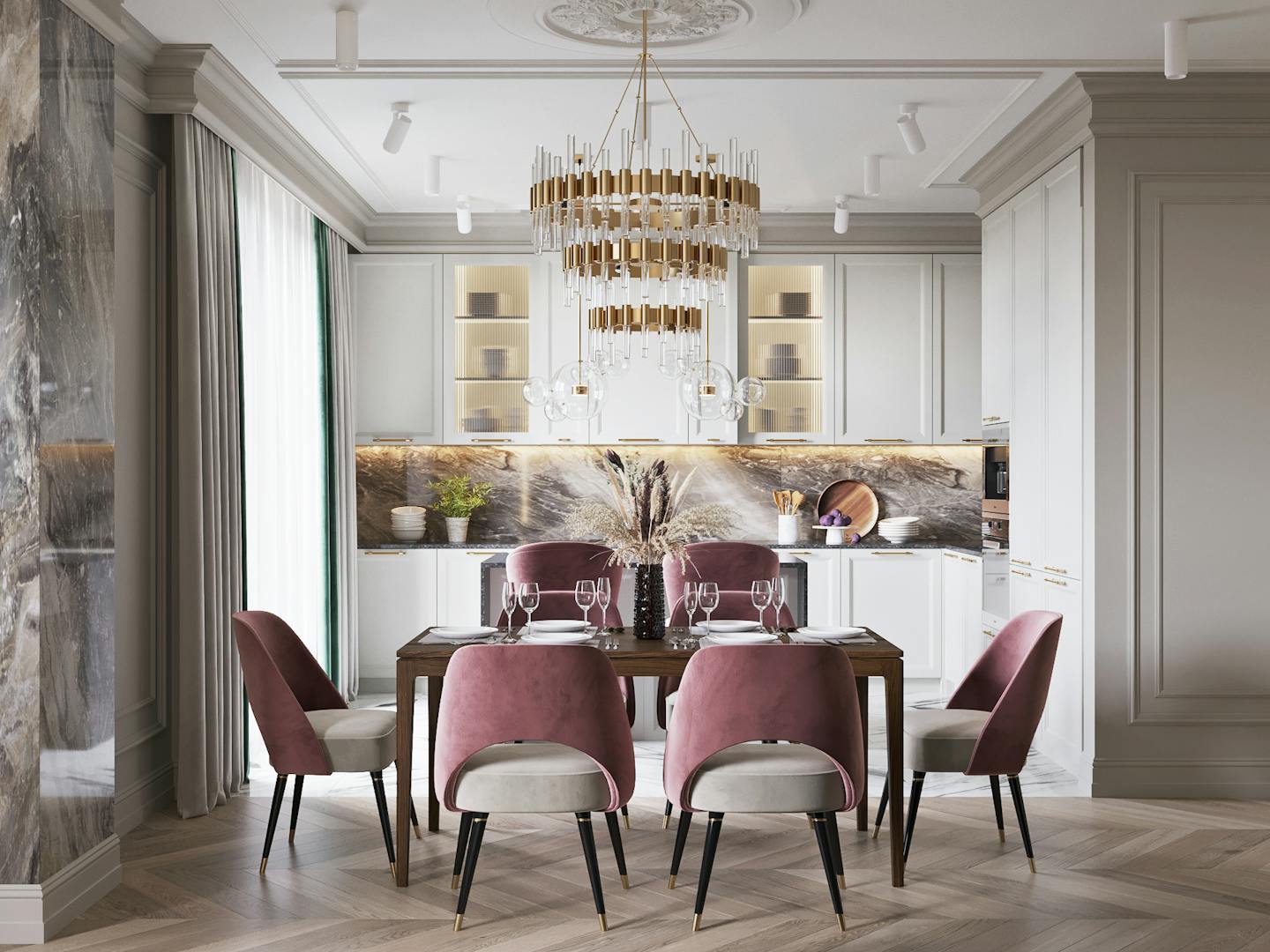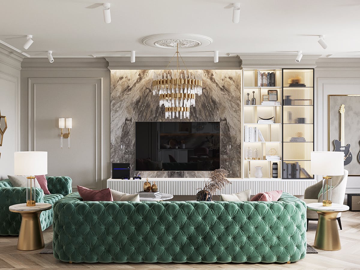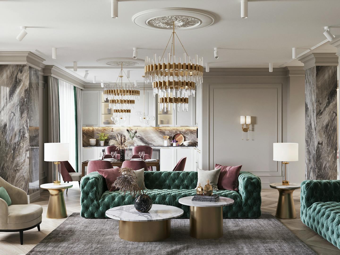 Роскошь мрамора, большое количество мебели с дорогой обивкой, классического декора, золотой фурнитуры и светильников — всё это в проекте Рэд, большой просторной квартиры для пары с ребенком.