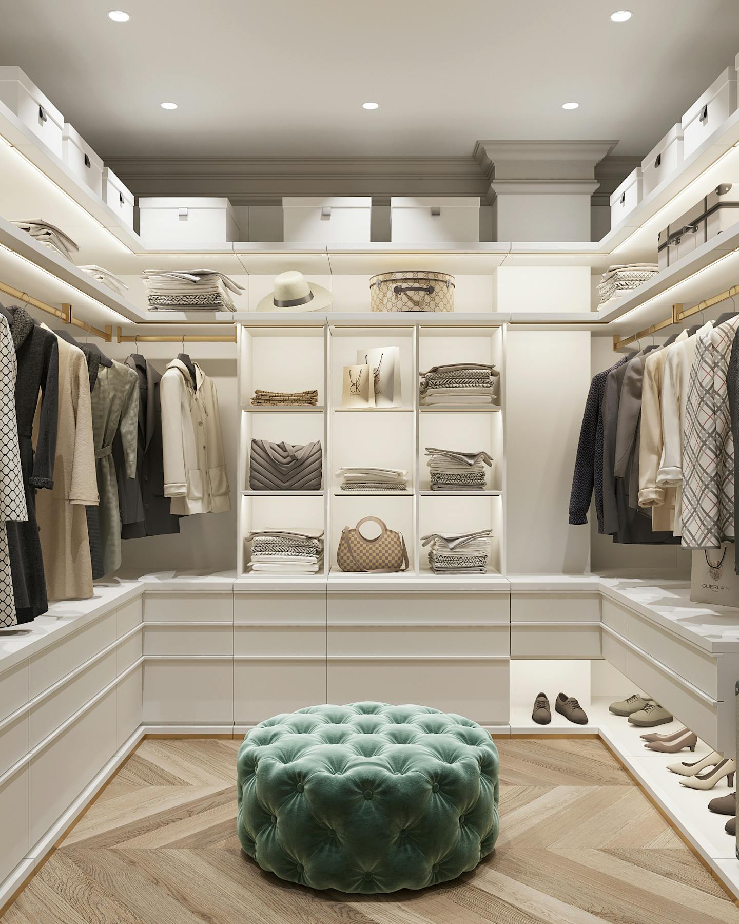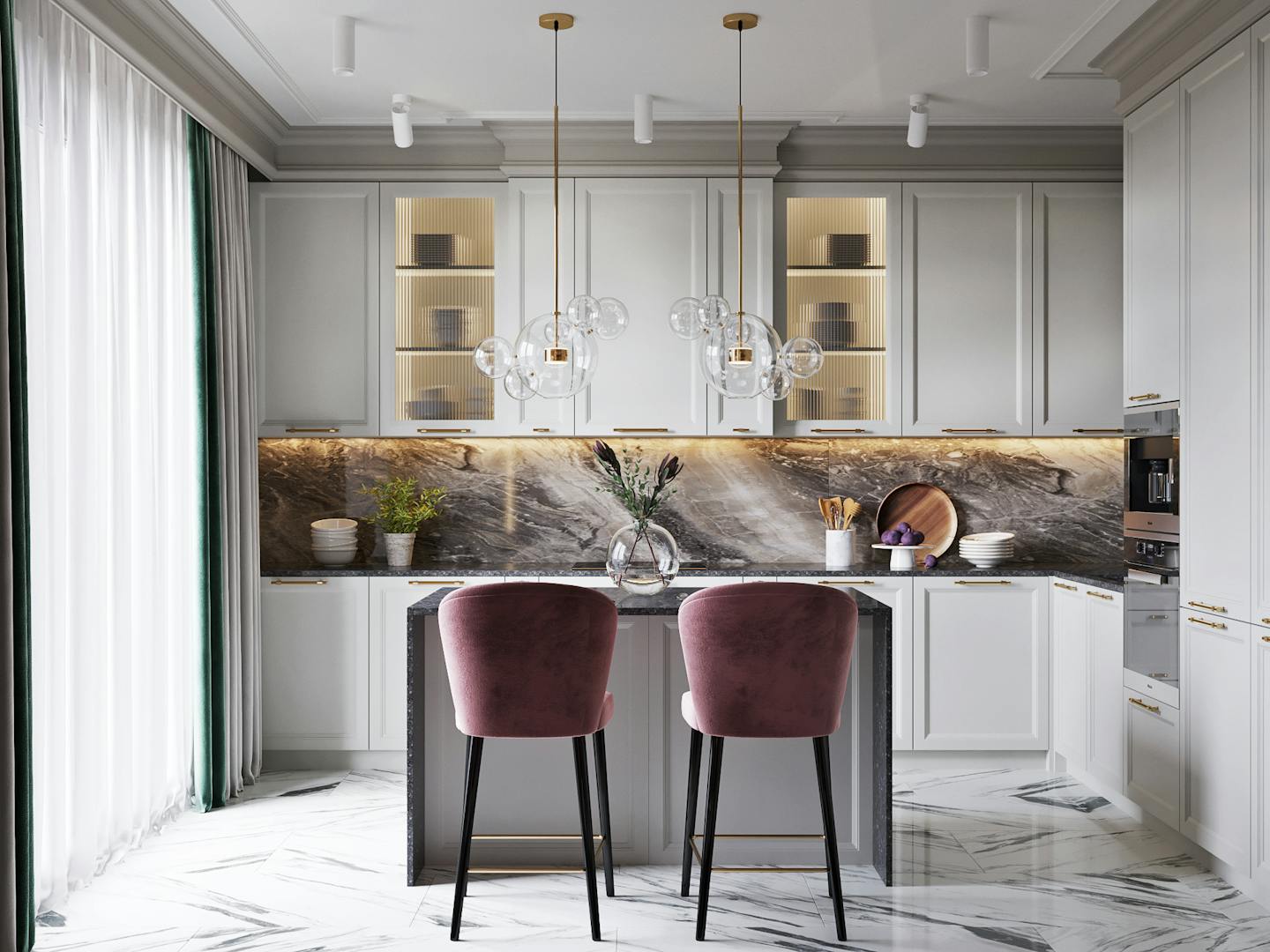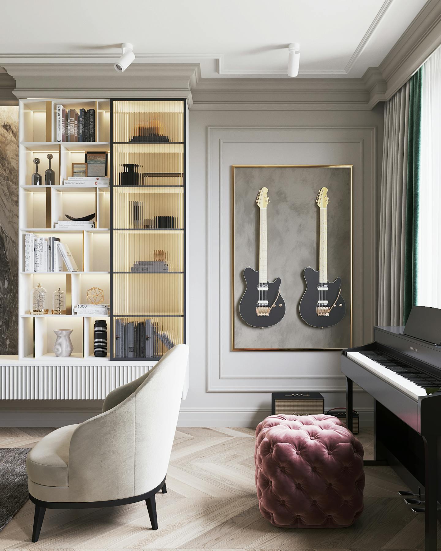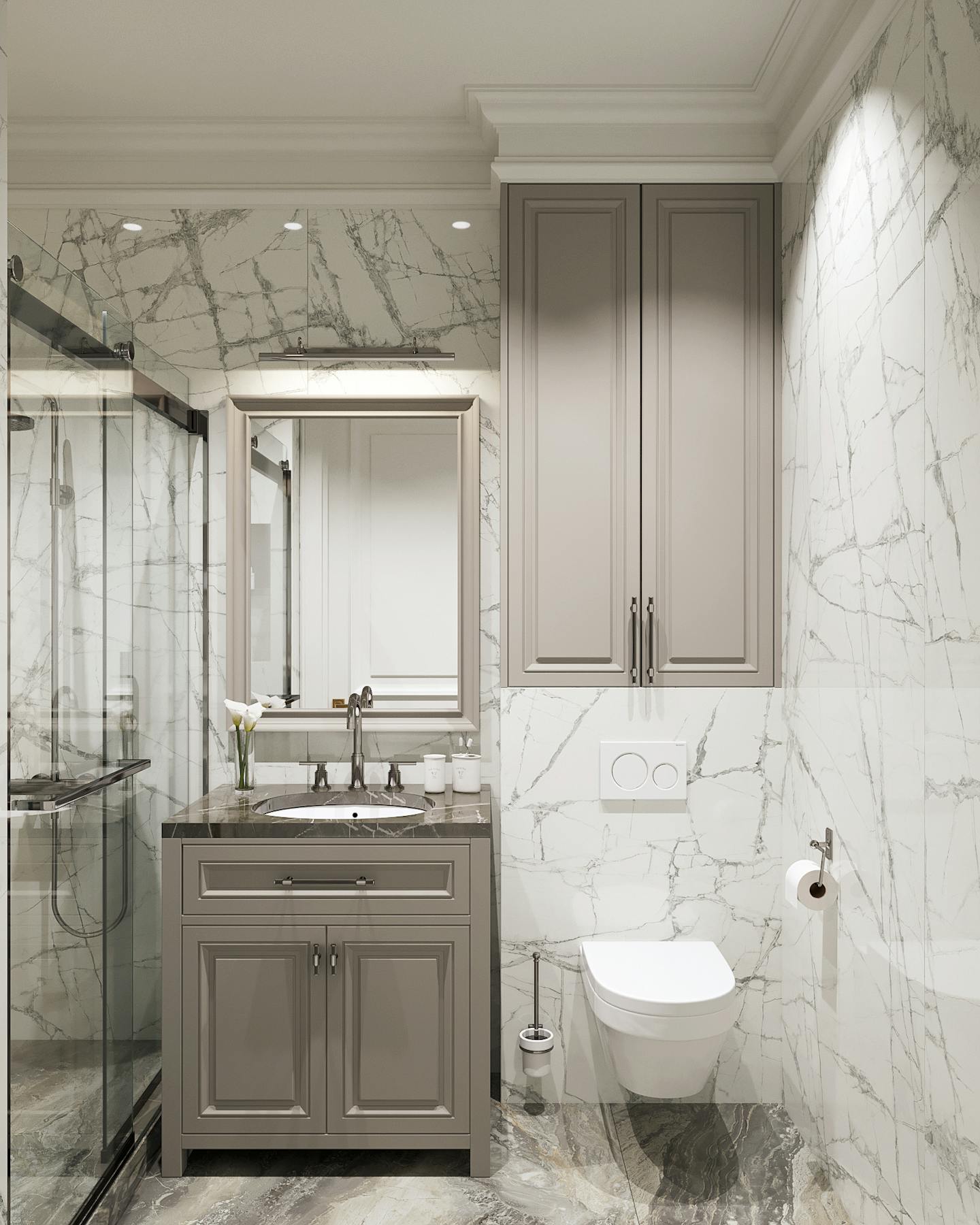 Роскошь мрамора, большое количество мебели с дорогой обивкой, классического декора, золотой фурнитуры и светильников — всё это в проекте Рэд, большой просторной квартиры для пары с ребенком.