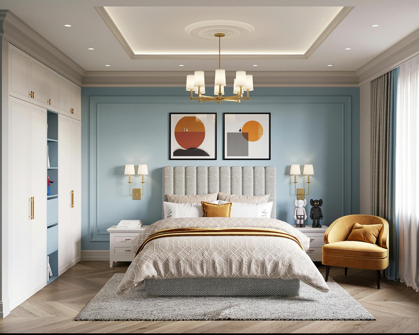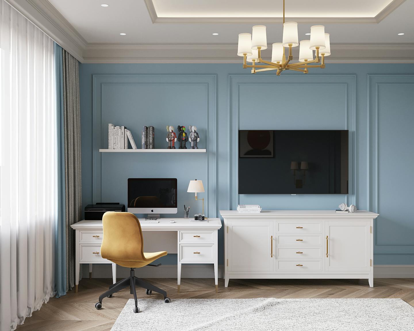 Детская выполнена в общей стилистике квартиры, за исключение лазурного оттенка, которым выделили стены. Дизайн комнаты спроектирован «на вырост» и будет актуален долгие годы.
