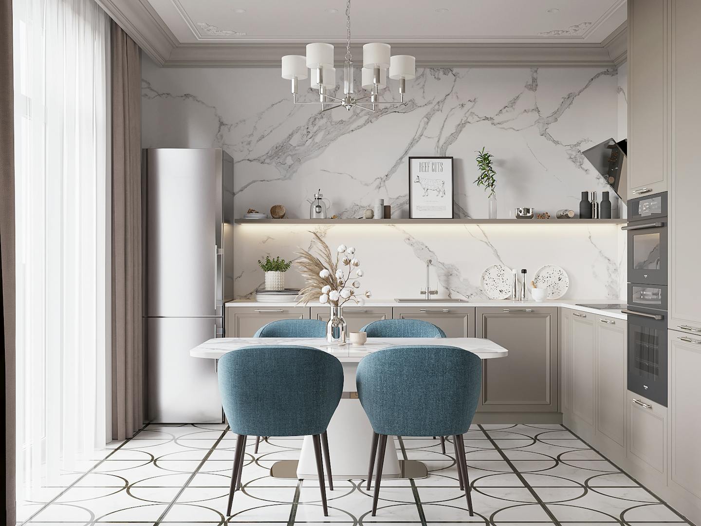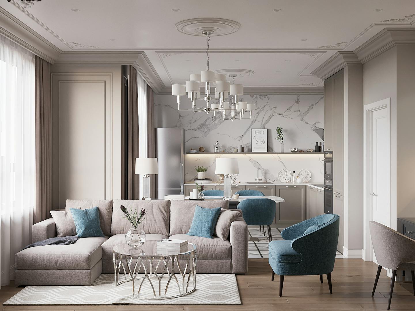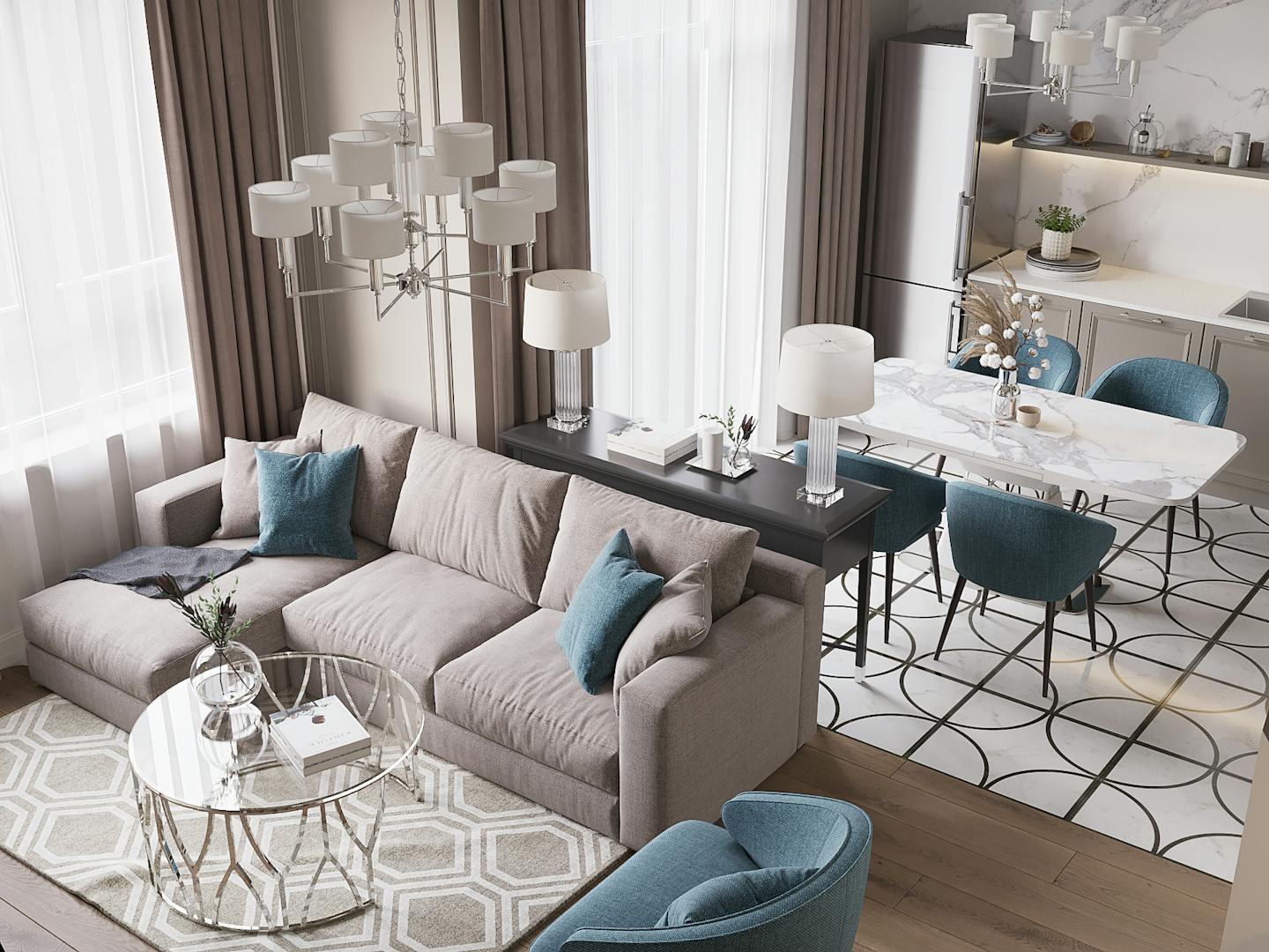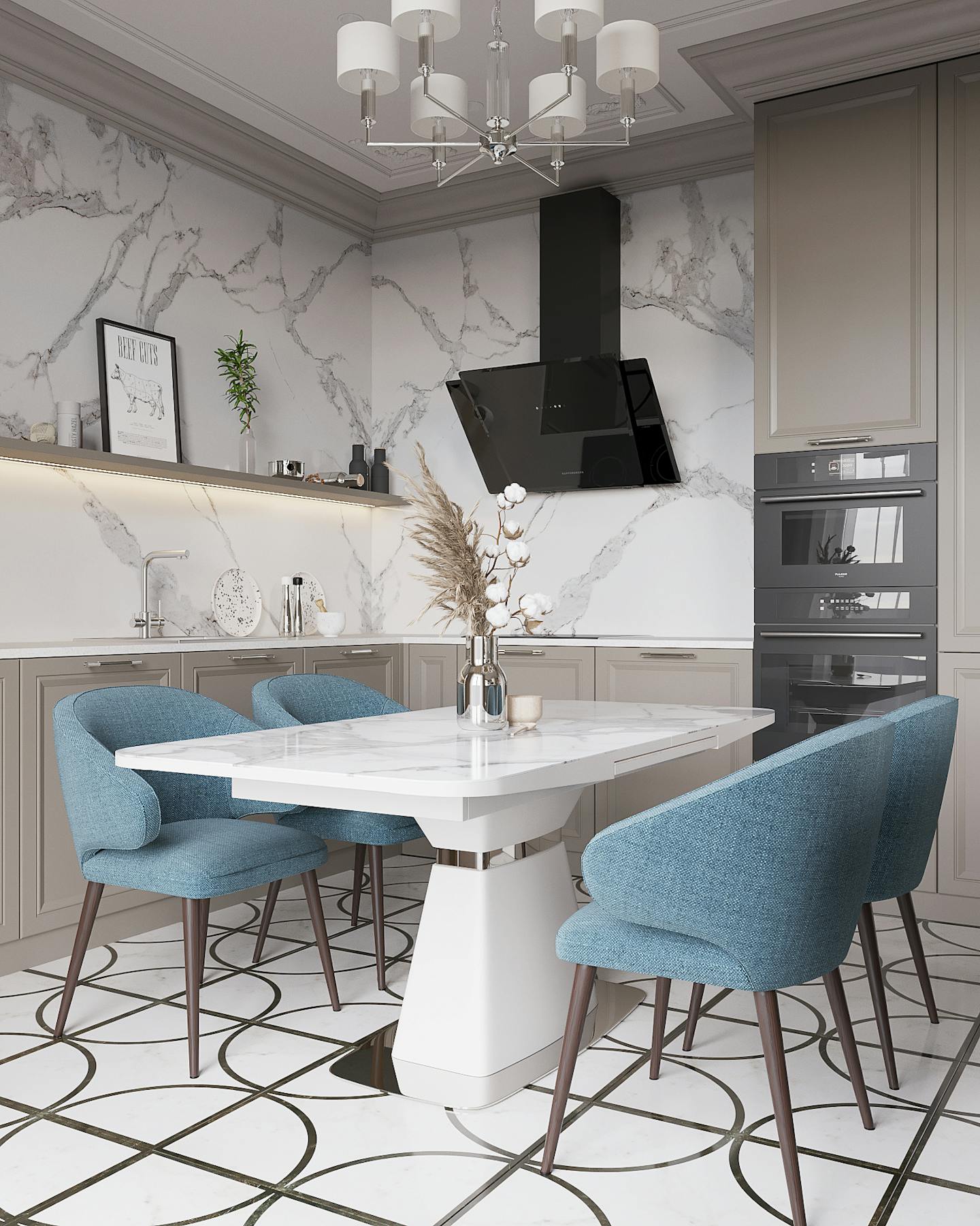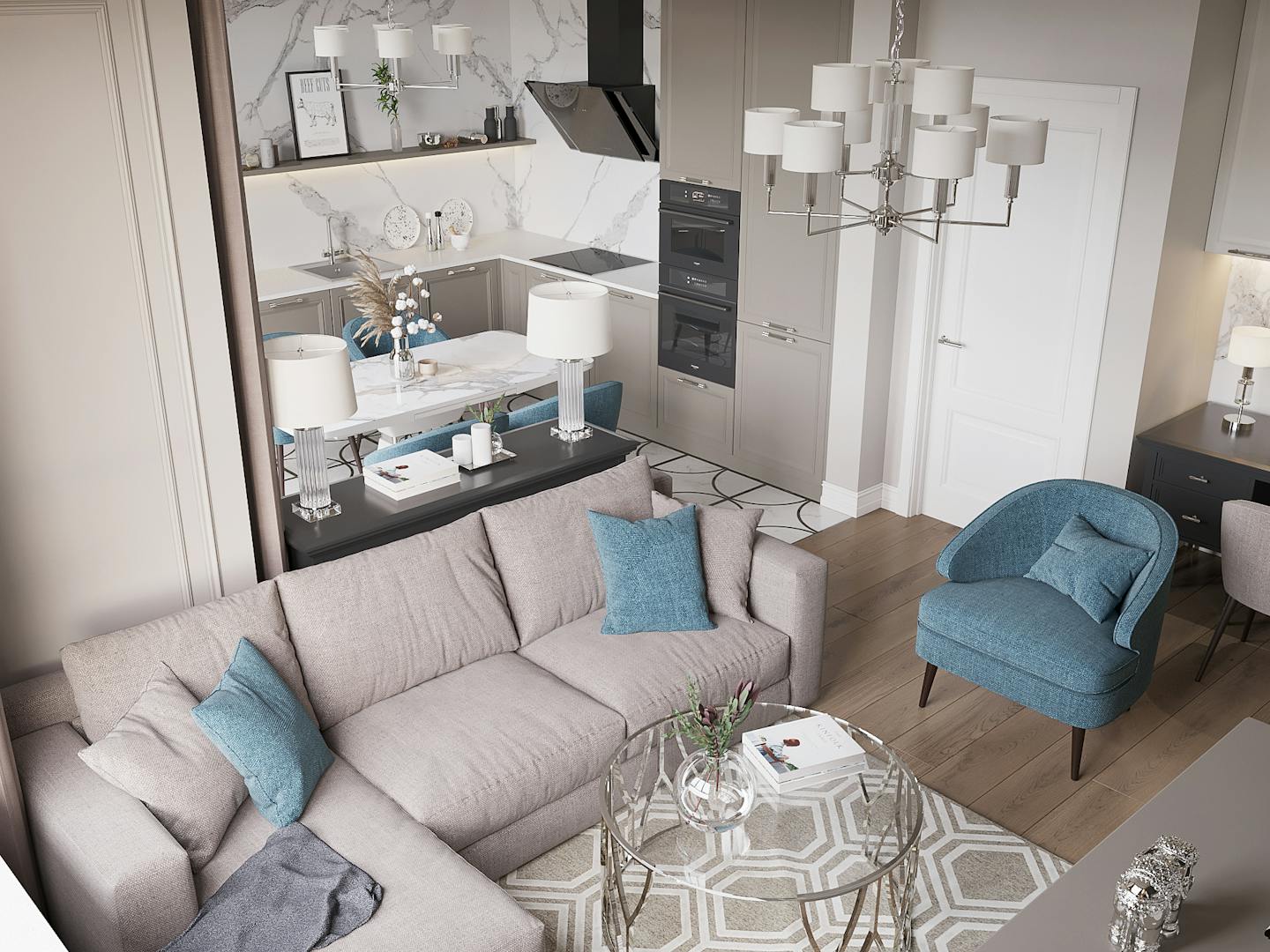 В гостиной расположился угловой диван и голубые кресла, которые притягивают к себе внимание. Керамогранит с мраморным рисунком, который оформили в качестве фартука на кухне, решили