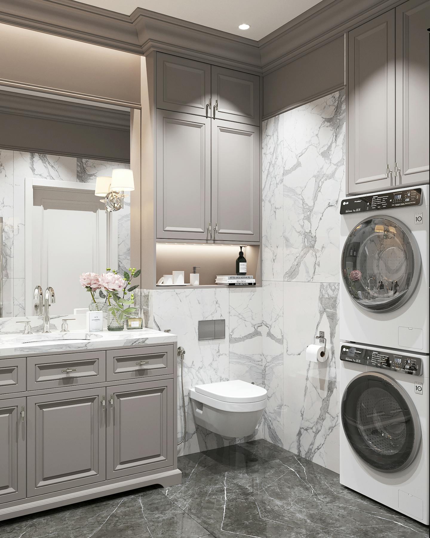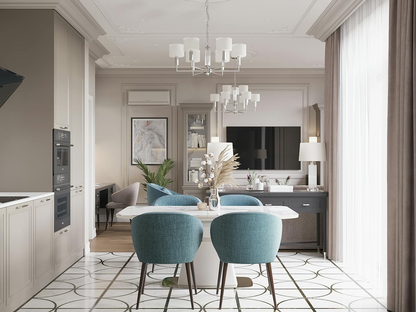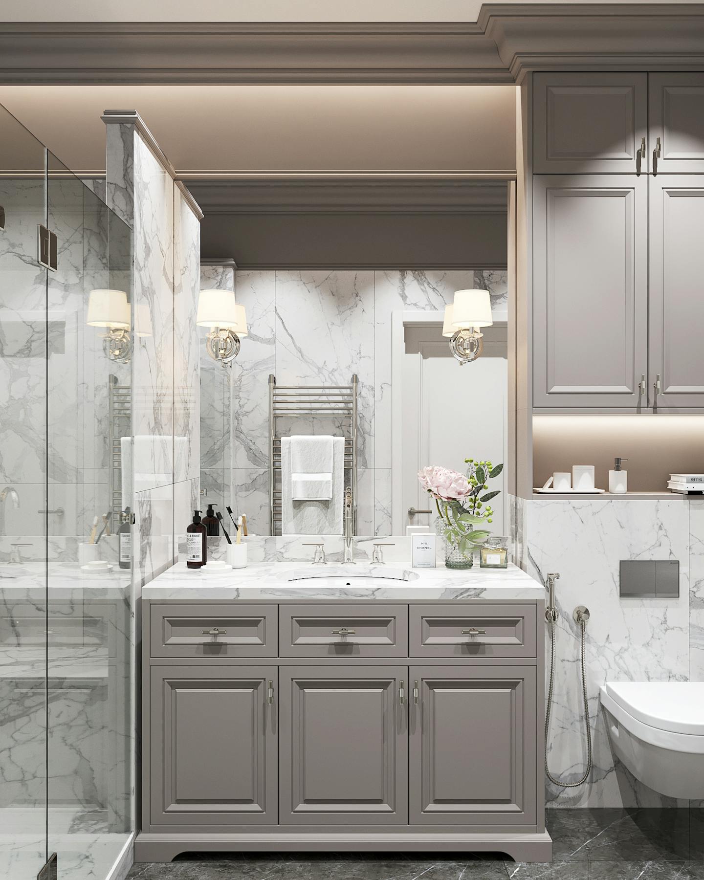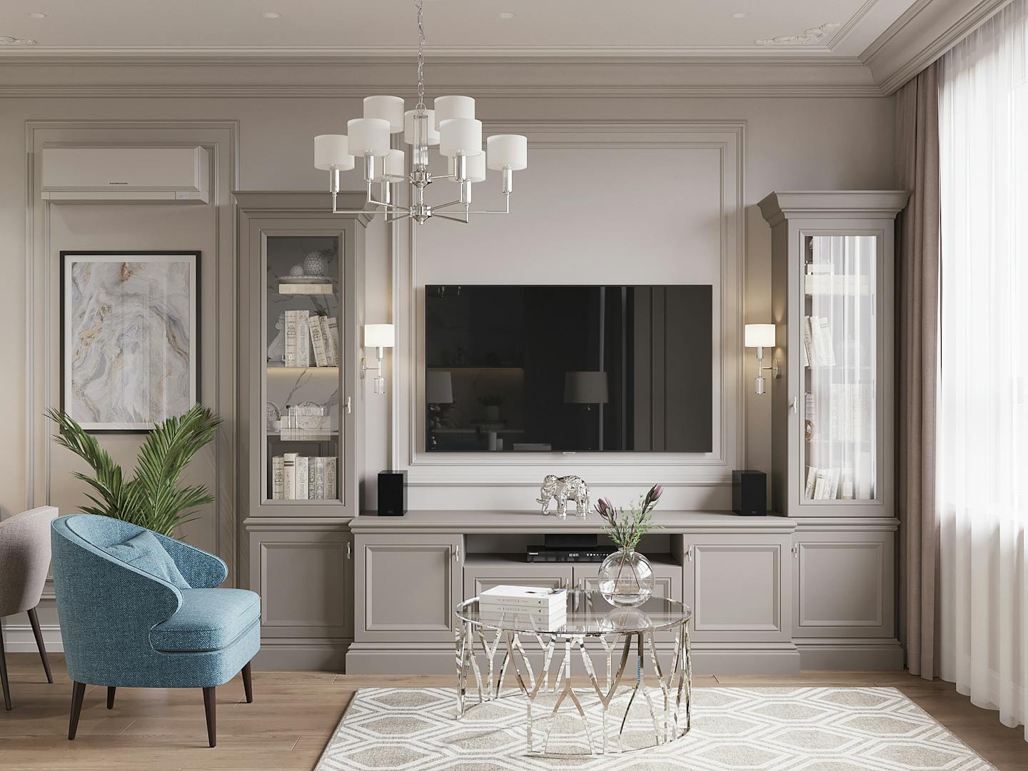 В обстановке доминируют светлые холодные тона и акцентный пыльный голубой, способствующие релаксации и восстановлению после дня, проведенного в суете большого города.