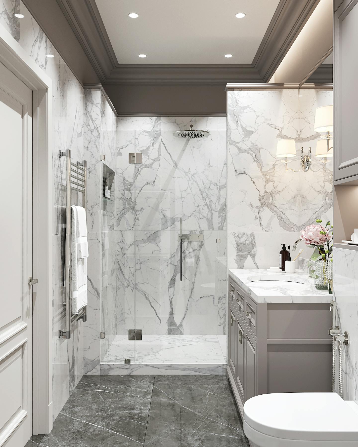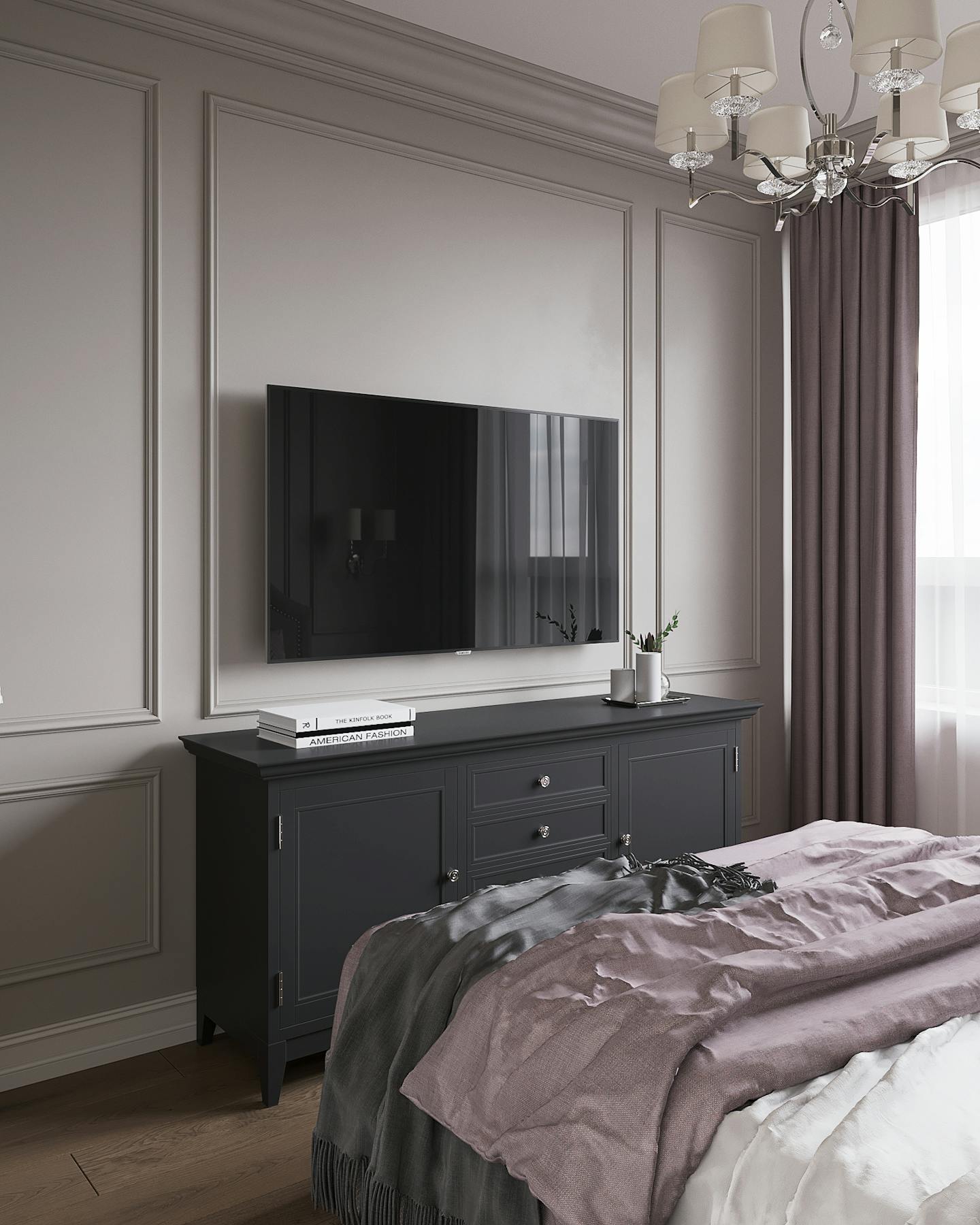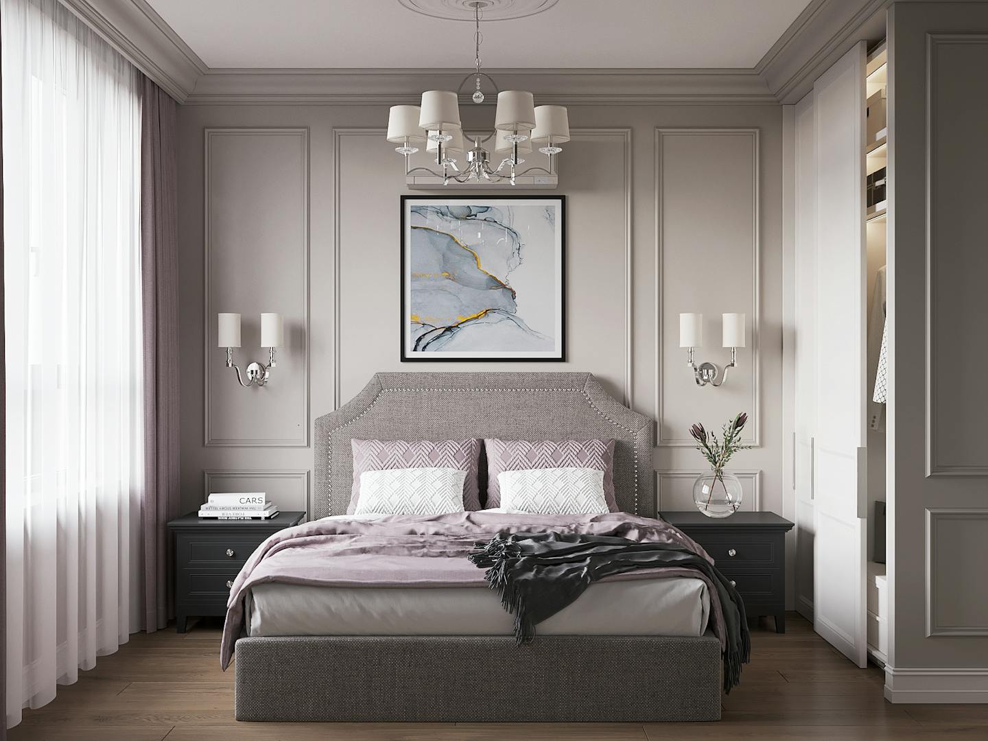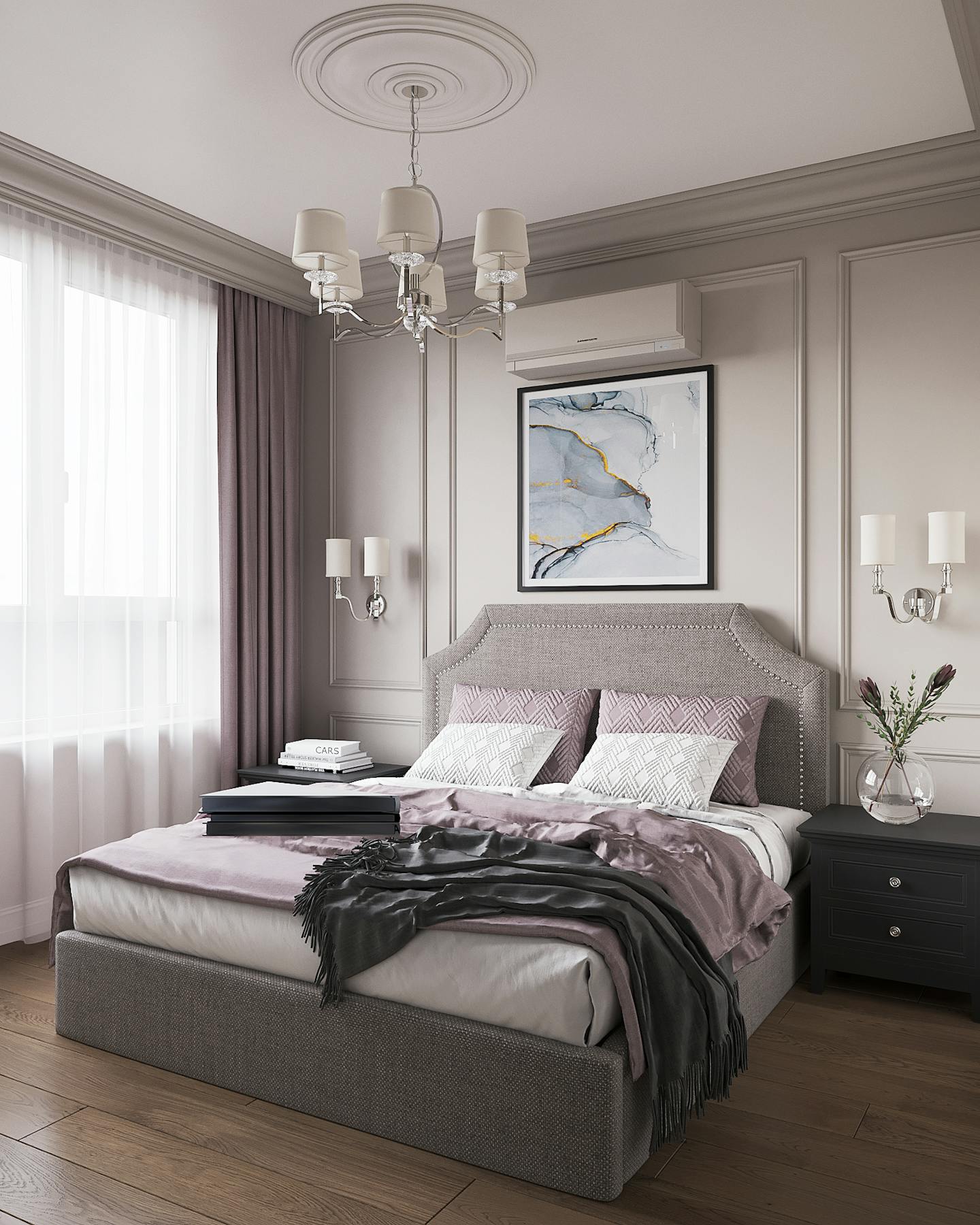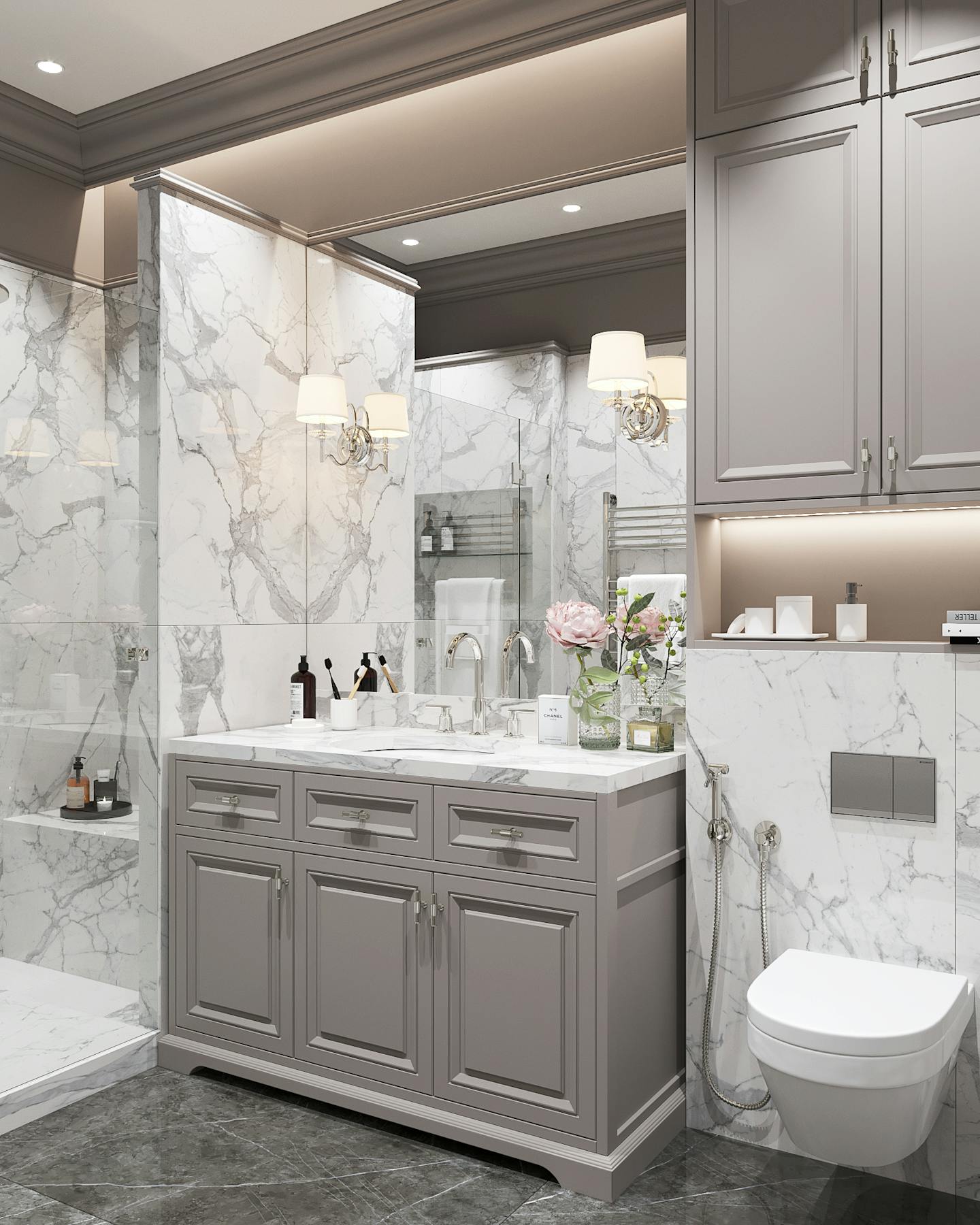 В обстановке доминируют светлые холодные тона и акцентный пыльный голубой, способствующие релаксации и восстановлению после дня, проведенного в суете большого города.