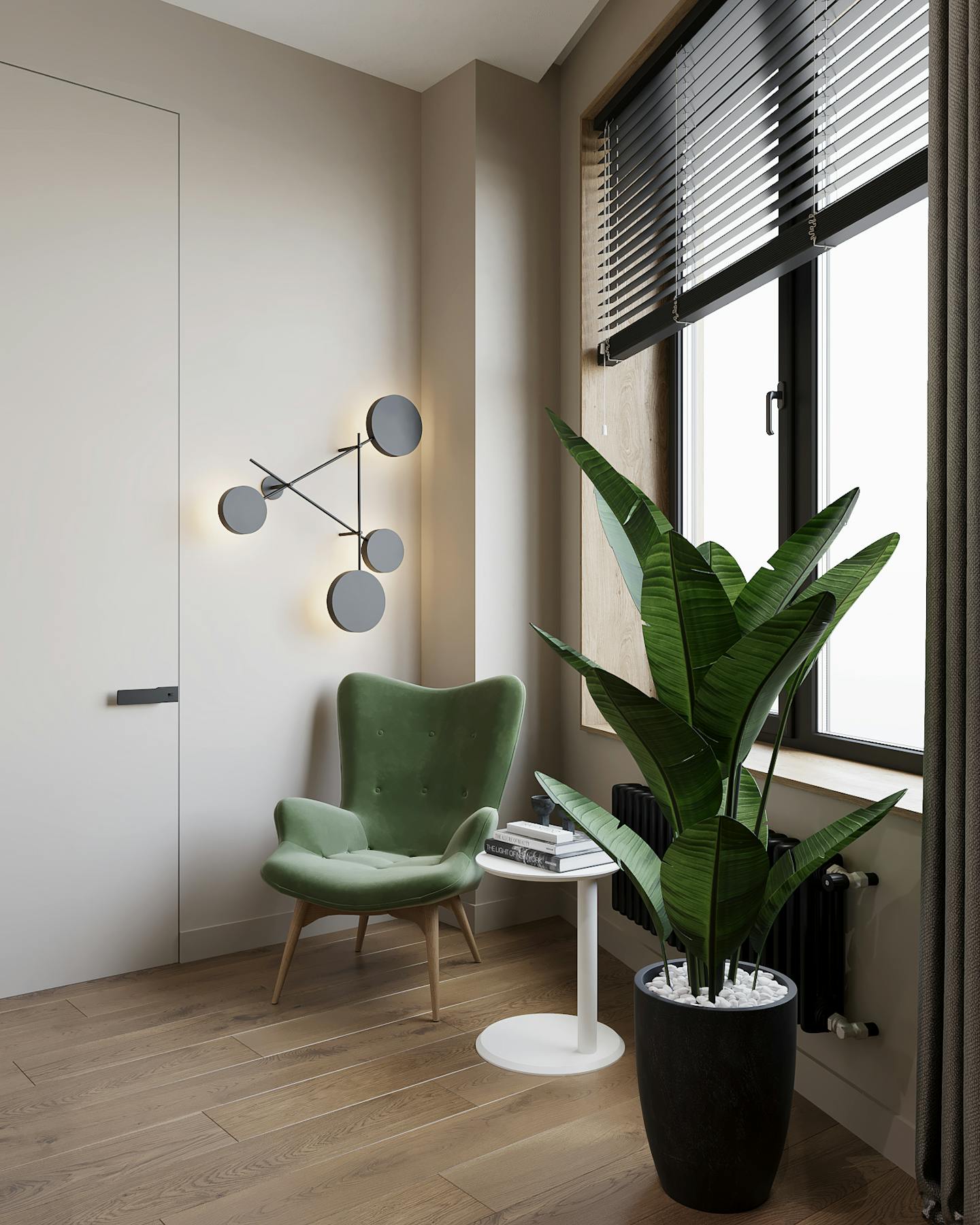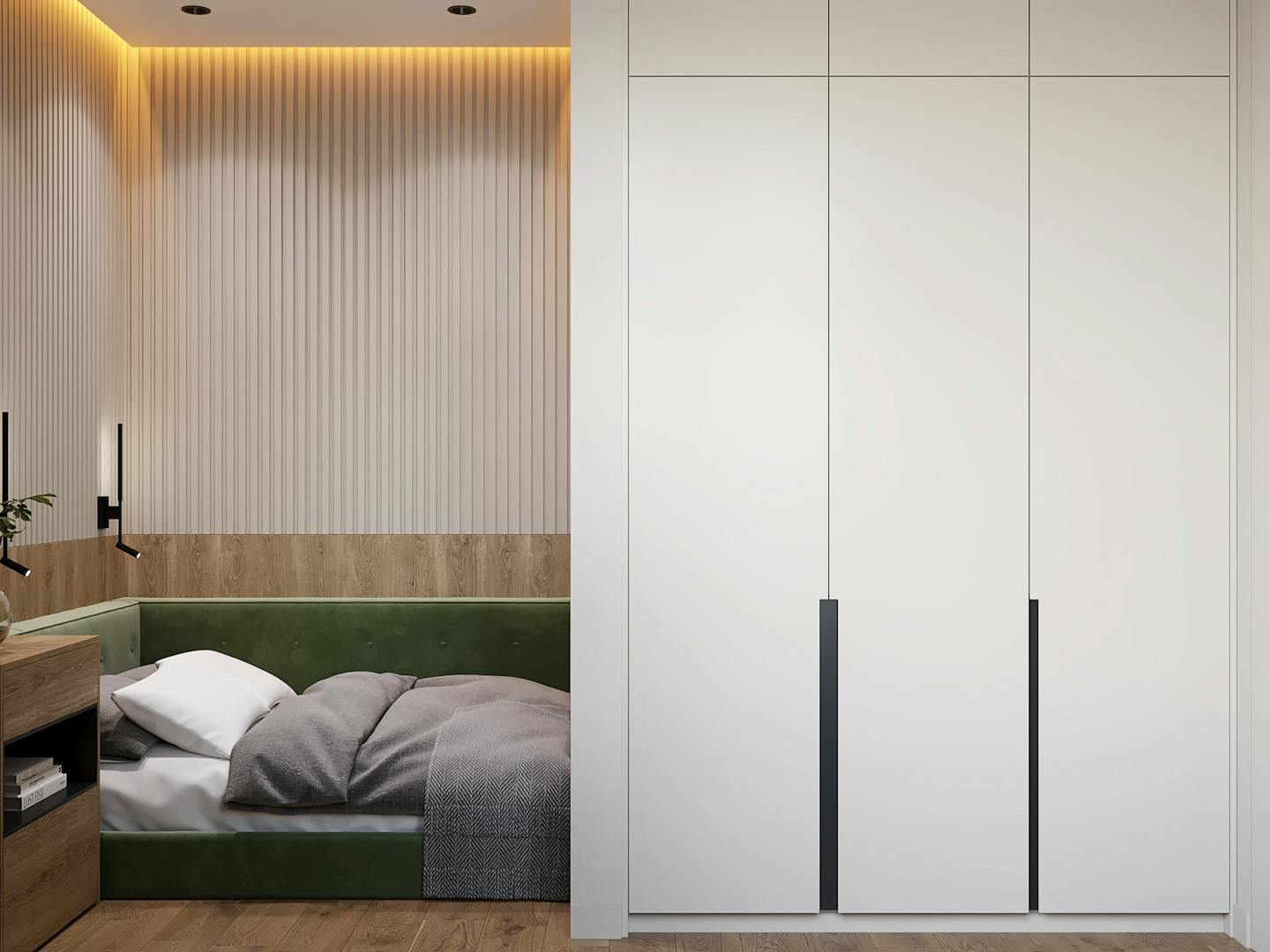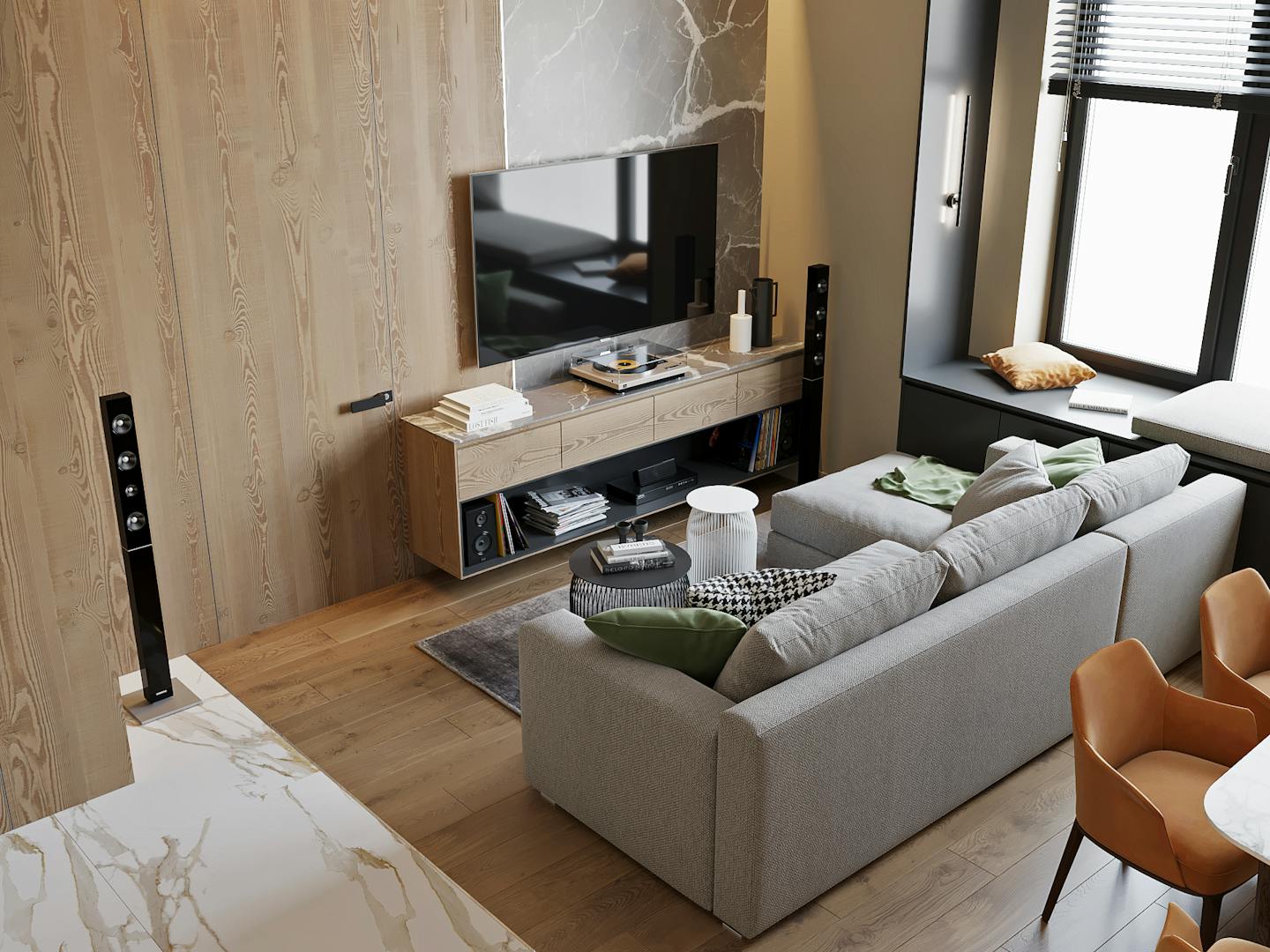 На кухне лучшим решением оказался угловой раскладывающийся диван, который объединяется с обеденной группой. Спальня осталась изолированной, но вход в нее предусмотрели не из холла, а из гостиной. Места для хранения есть и в спальне, и в детской, а также в мебели под окнами. Детская в проекте неправильной формы, поэтому кровать скрывается в нише. Остальное пространство оставили под кресло и журнальный столик. Рабочее место не потребовалось.