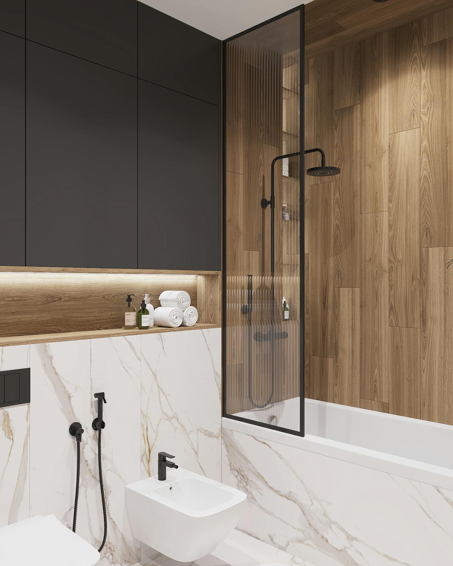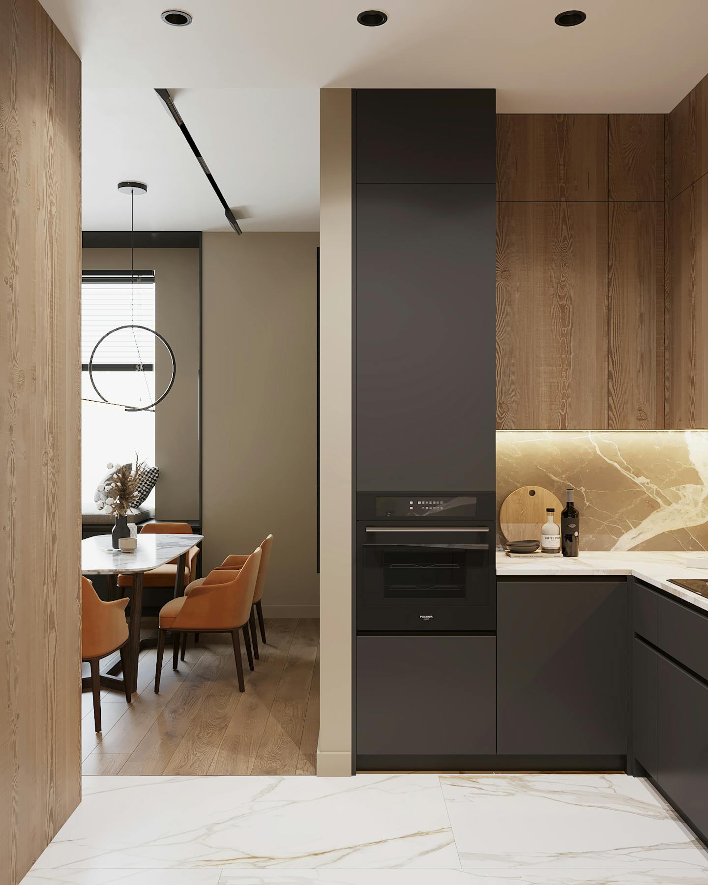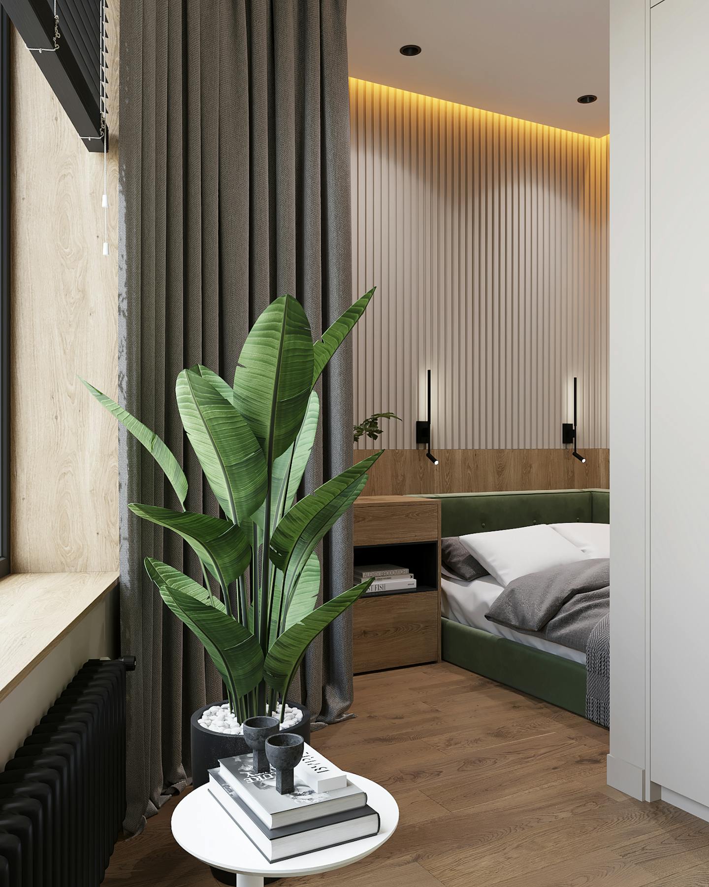На кухне лучшим решением оказался угловой раскладывающийся диван, который объединяется с обеденной группой. Спальня осталась изолированной, но вход в нее предусмотрели не из холла, а из гостиной. Места для хранения есть и в спальне, и в детской, а также в мебели под окнами. Детская в проекте неправильной формы, поэтому кровать скрывается в нише. Остальное пространство оставили под кресло и журнальный столик. Рабочее место не потребовалось.