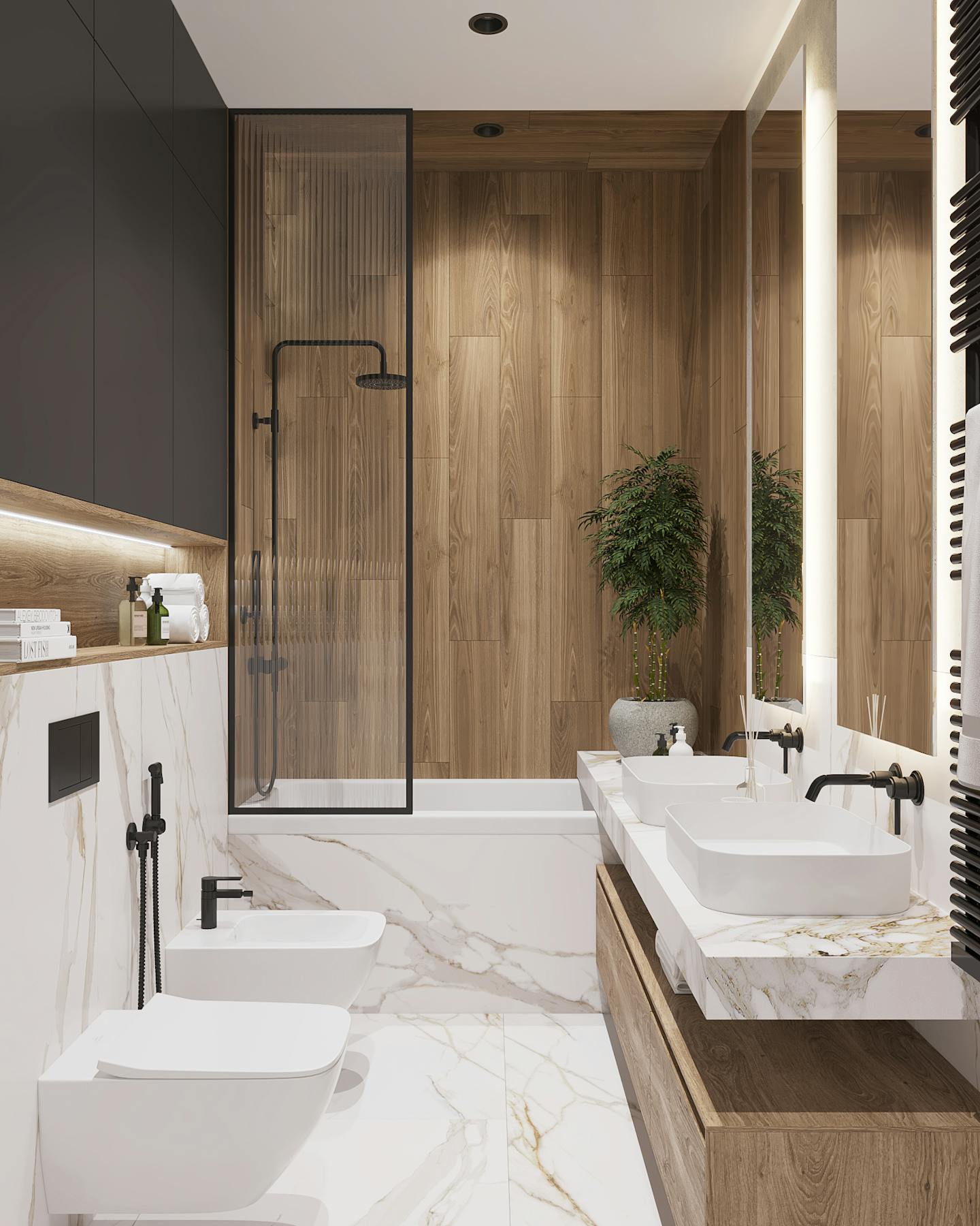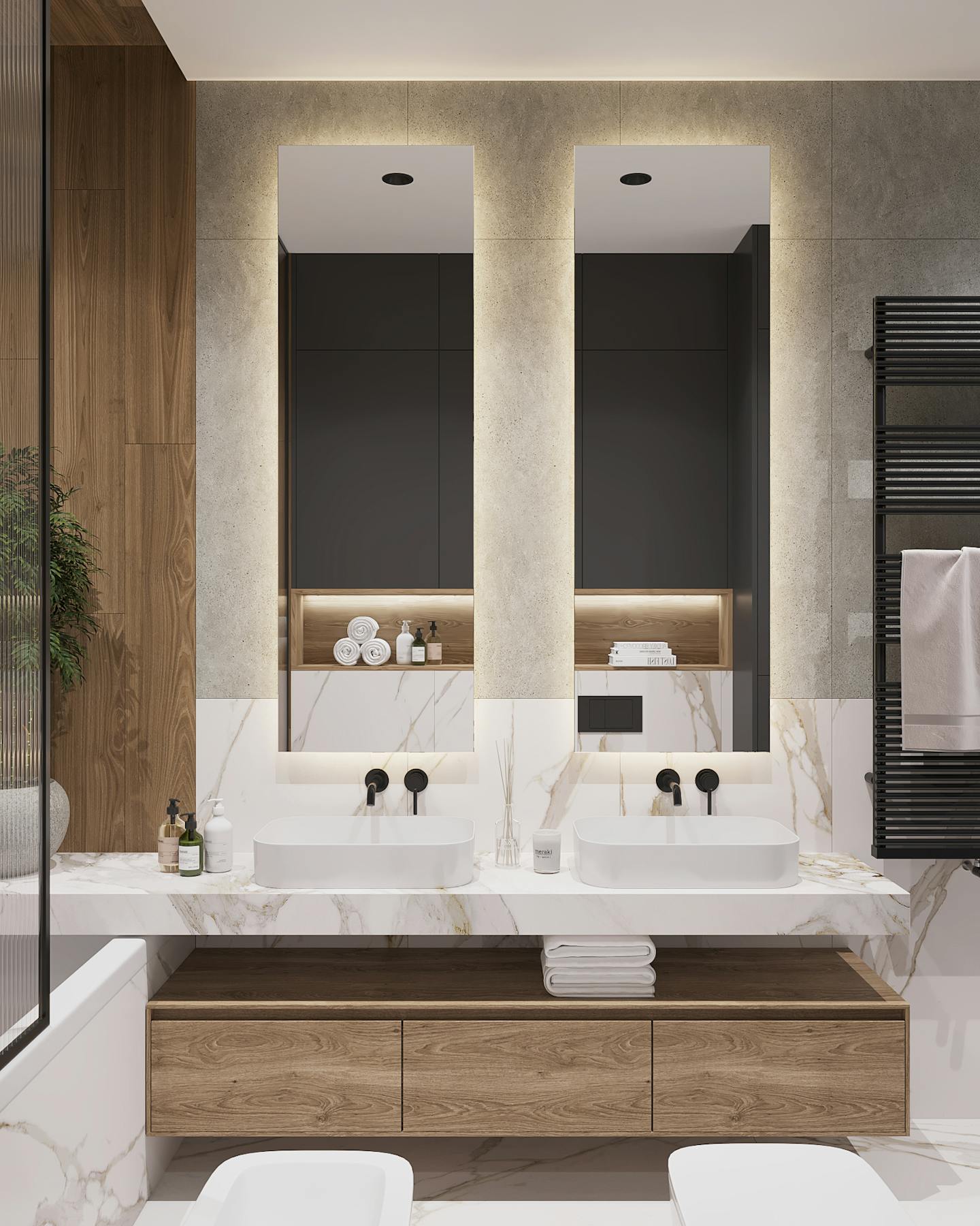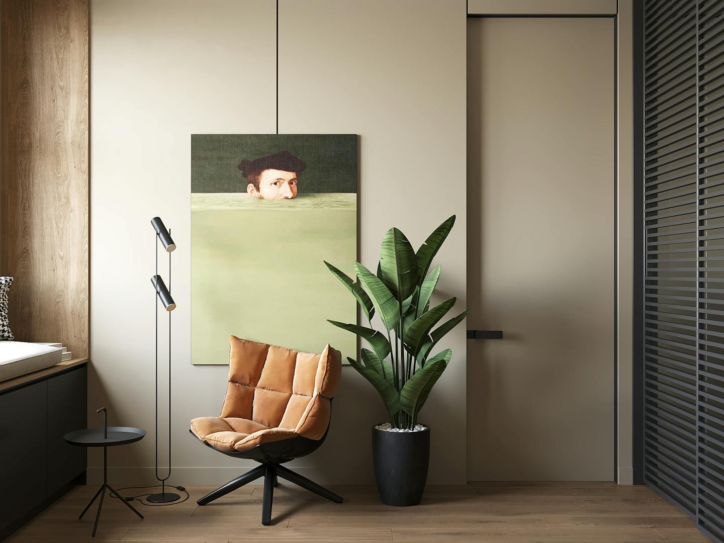 Интересный акцент появился за счет картин, которые висят в гостиной и спальне. Лица, изображенные на портретах, придают живости и разбавляют строгую геометричность интерьера, выглядывая из рамы.