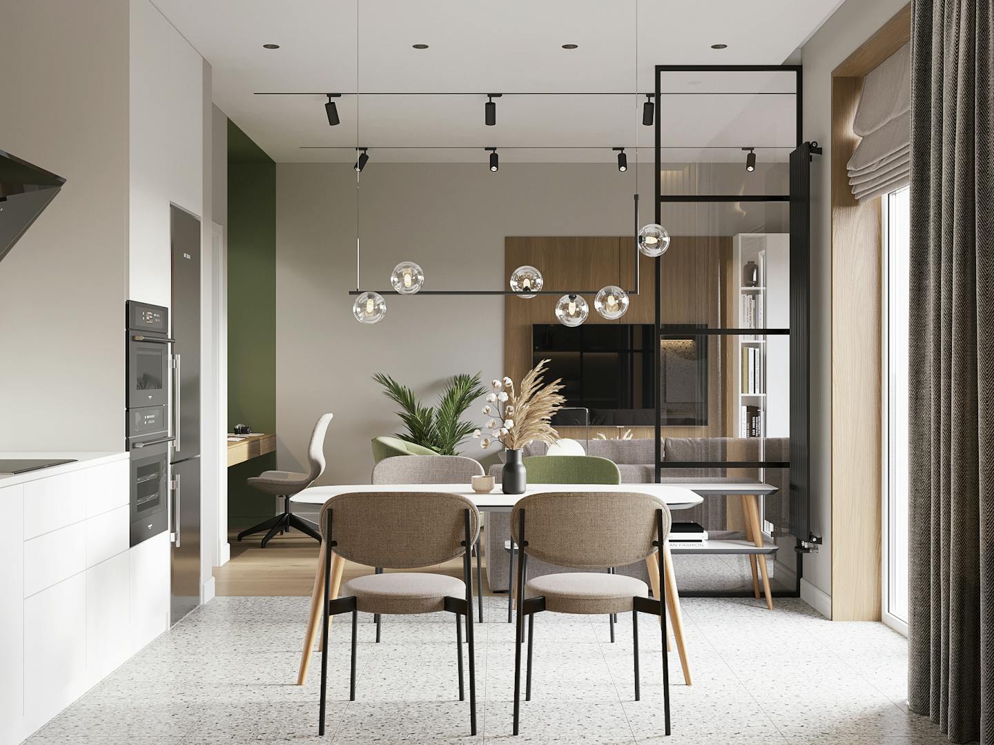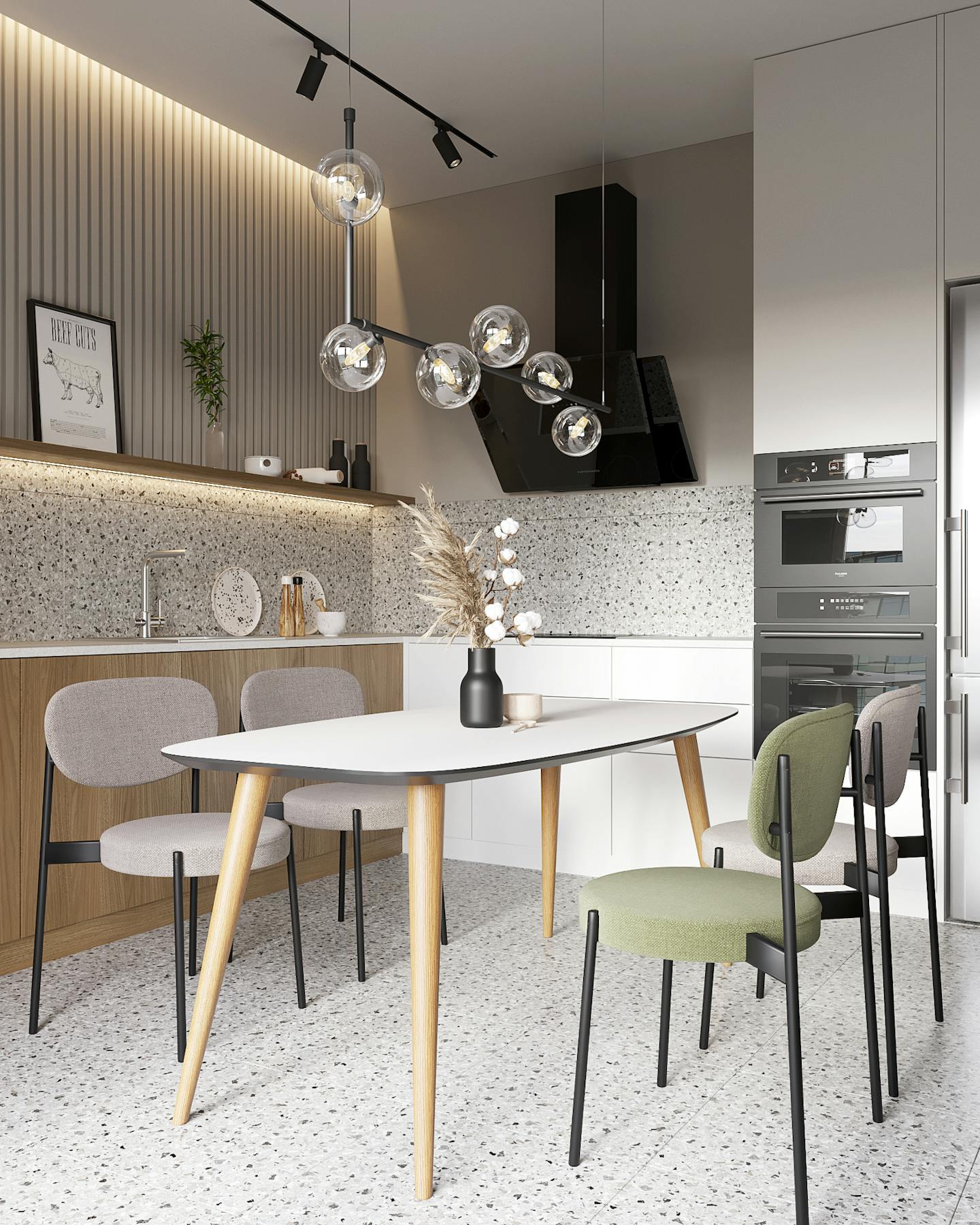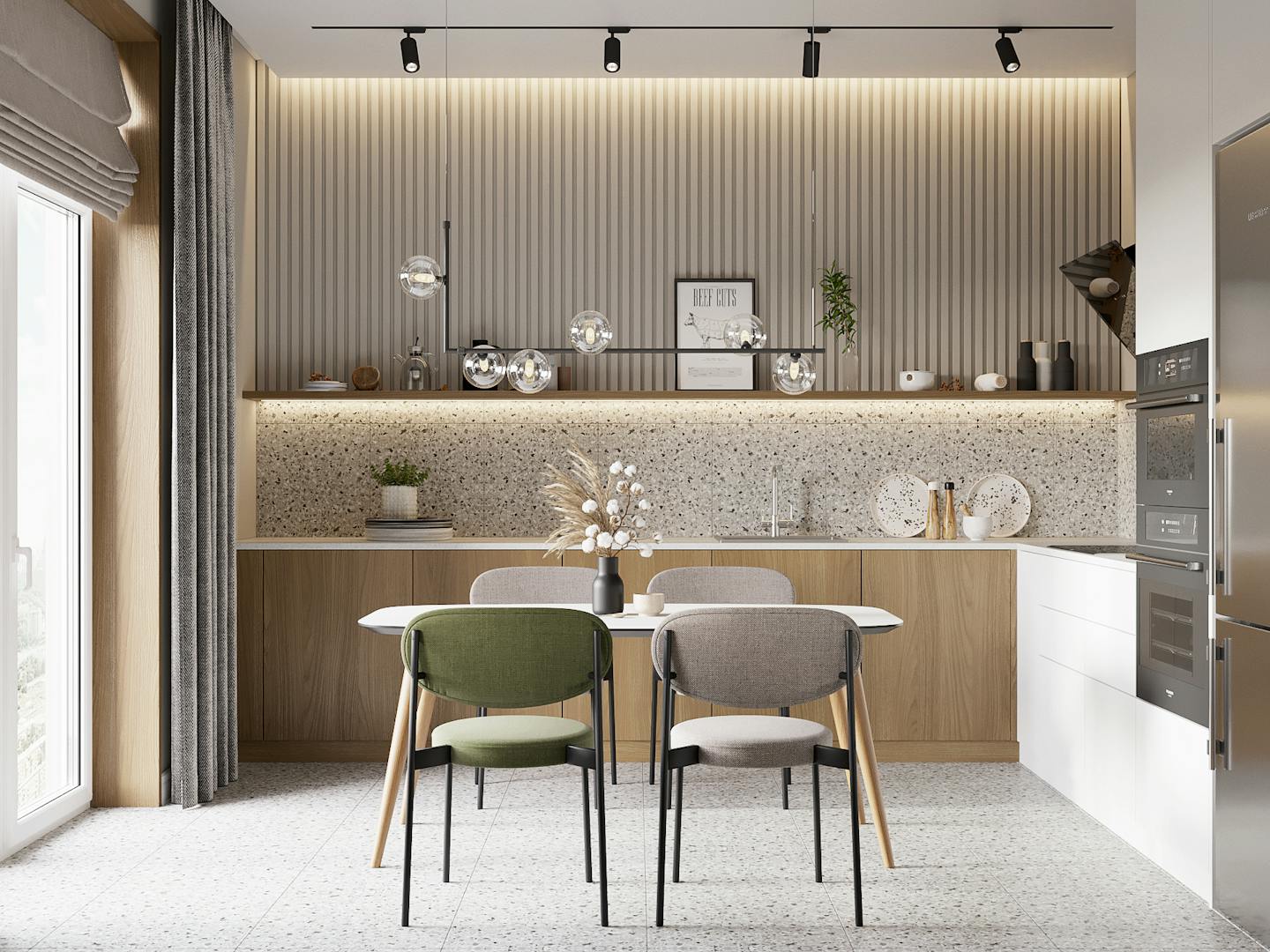 Кухня-гостиная получилась достаточно эргономичной. Вдоль одной стены разместили линейную кухню с фасадами белого и древесного цвета. Пеналы со встроенной техникой разместили рядом. Над столешницей нет высоких шкафов, вместо них оставили сплошную полку. Для кухонного фартука выбрали плитку тераццо. Небольшая стеклянная перегородка разделяет столовую и гостиную зоны.