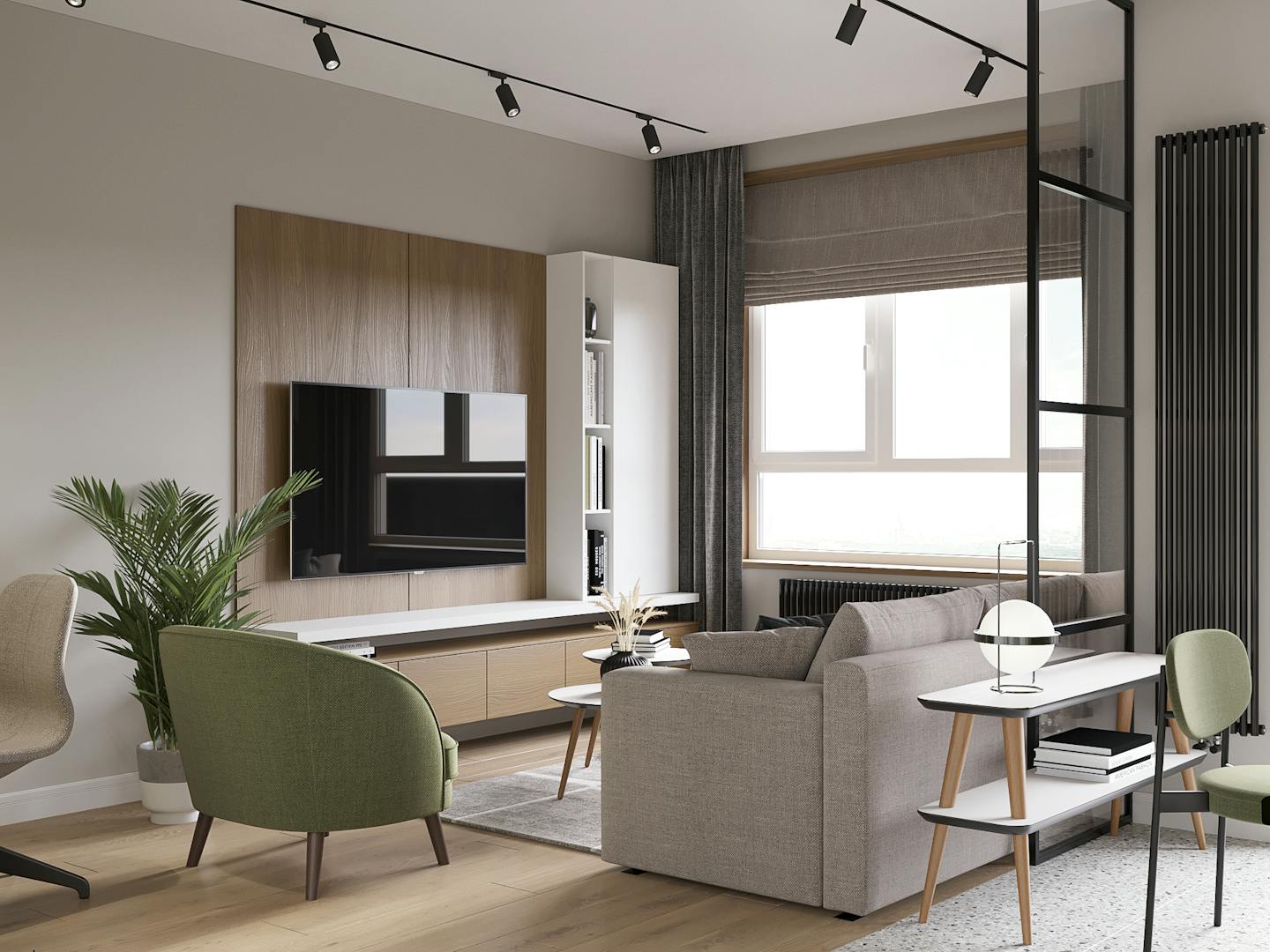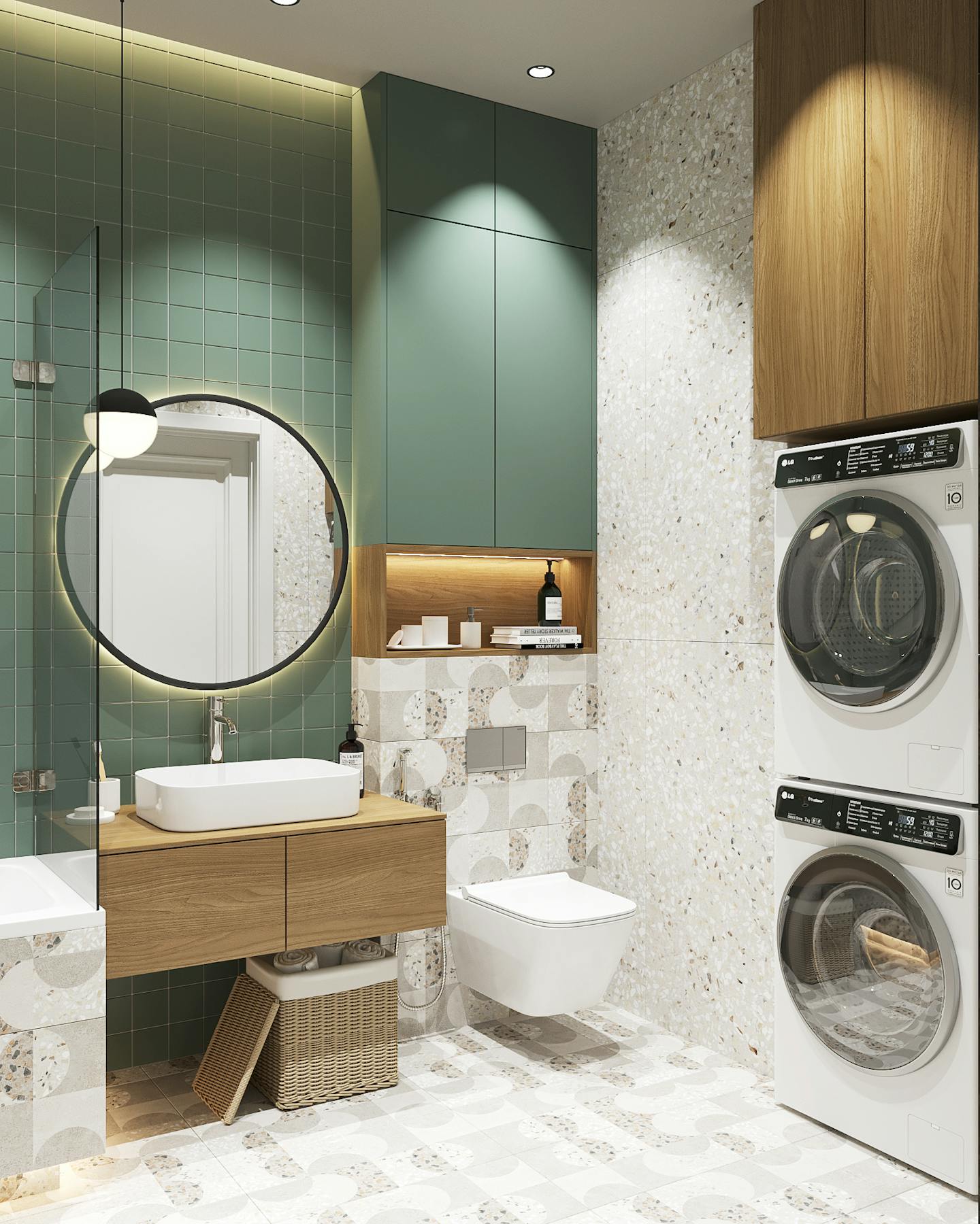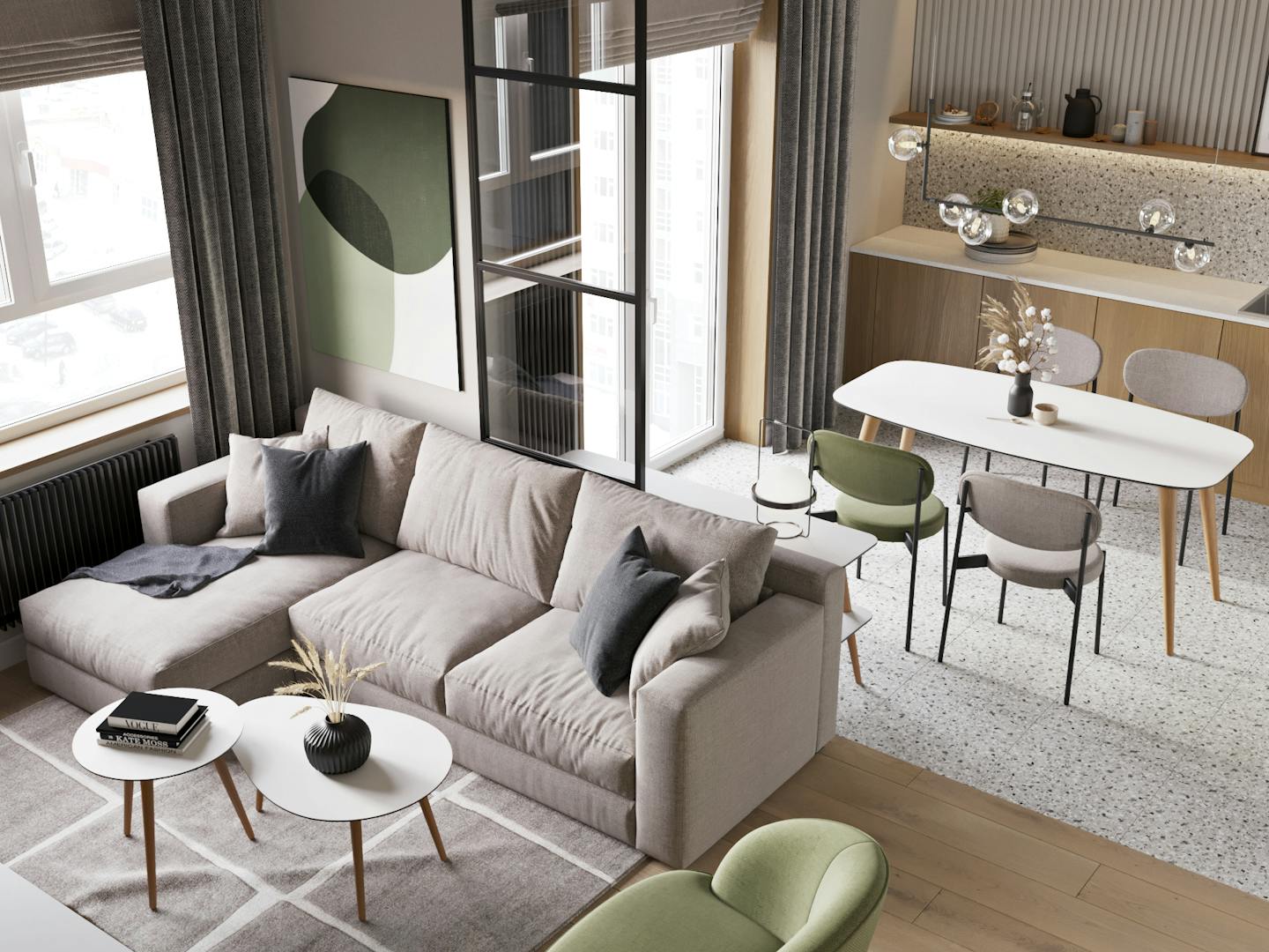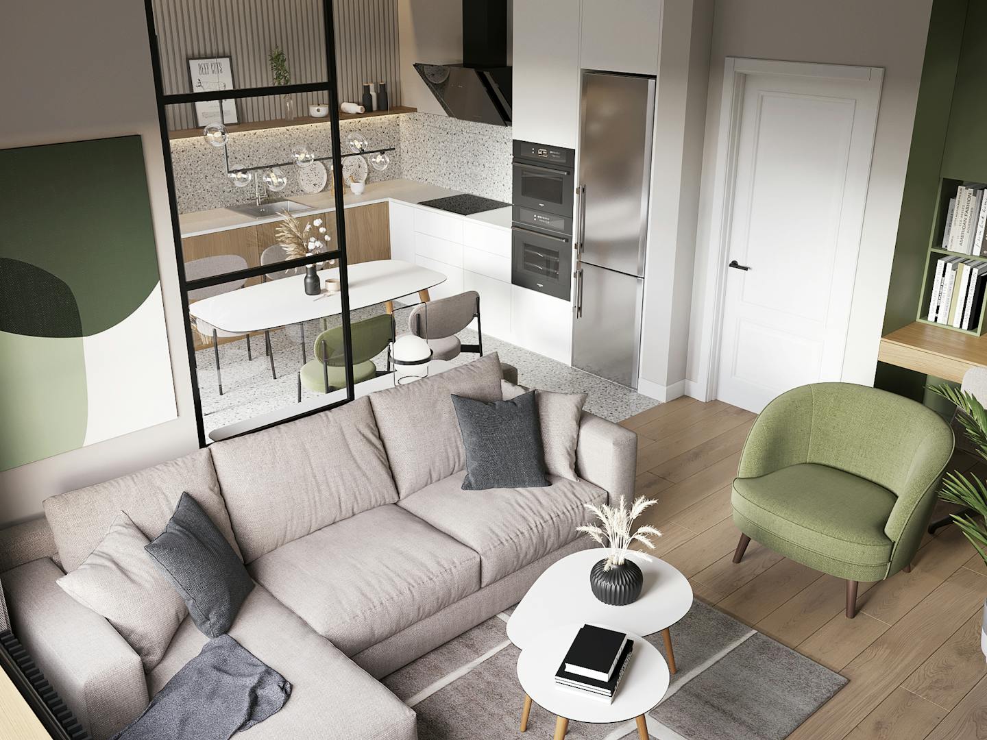 Кухня-гостиная получилась достаточно эргономичной. Вдоль одной стены разместили линейную кухню с фасадами белого и древесного цвета. Пеналы со встроенной техникой разместили рядом. Над столешницей нет высоких шкафов, вместо них оставили сплошную полку. Для кухонного фартука выбрали плитку тераццо. Небольшая стеклянная перегородка разделяет столовую и гостиную зоны.