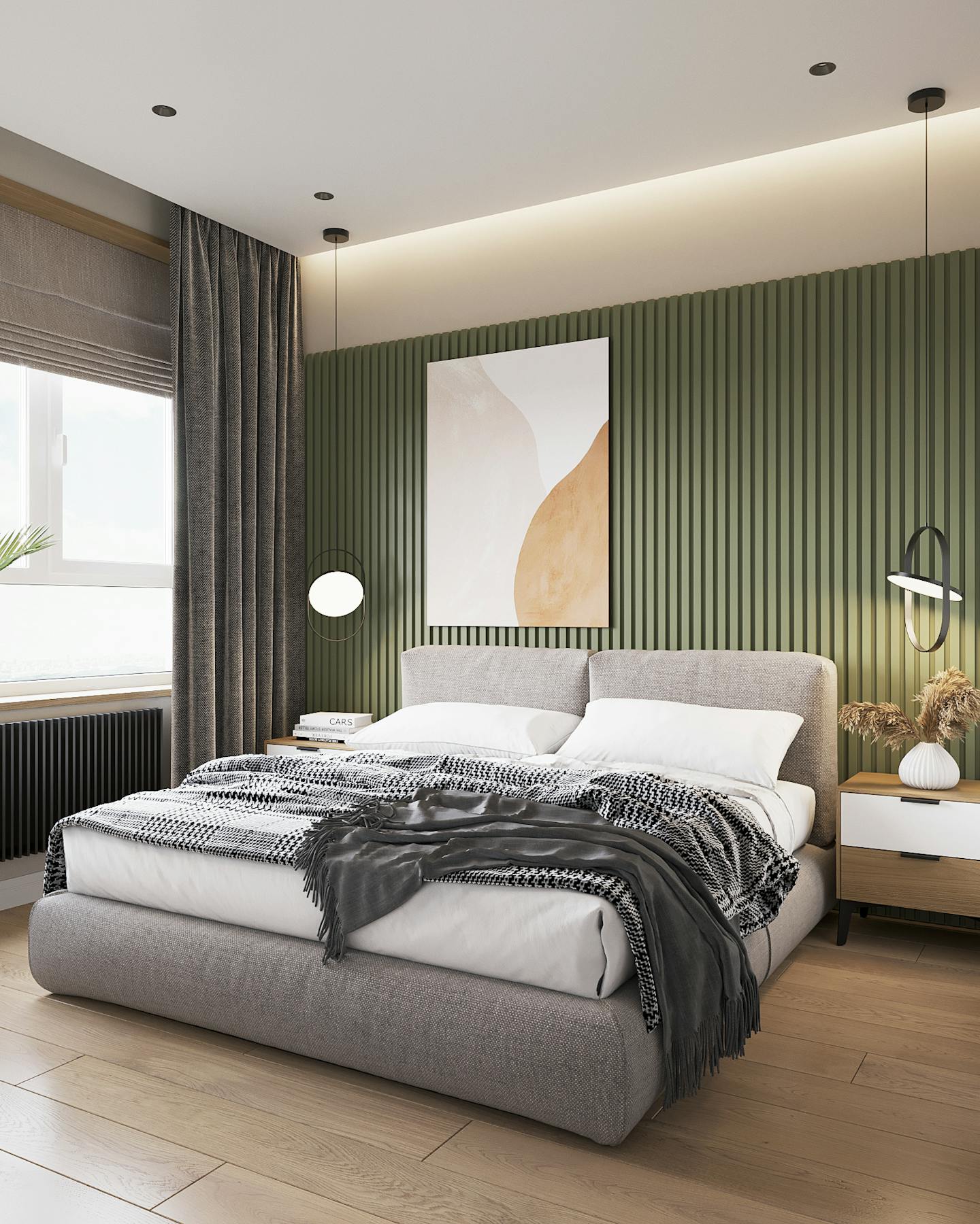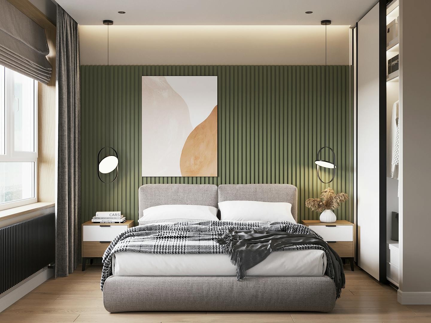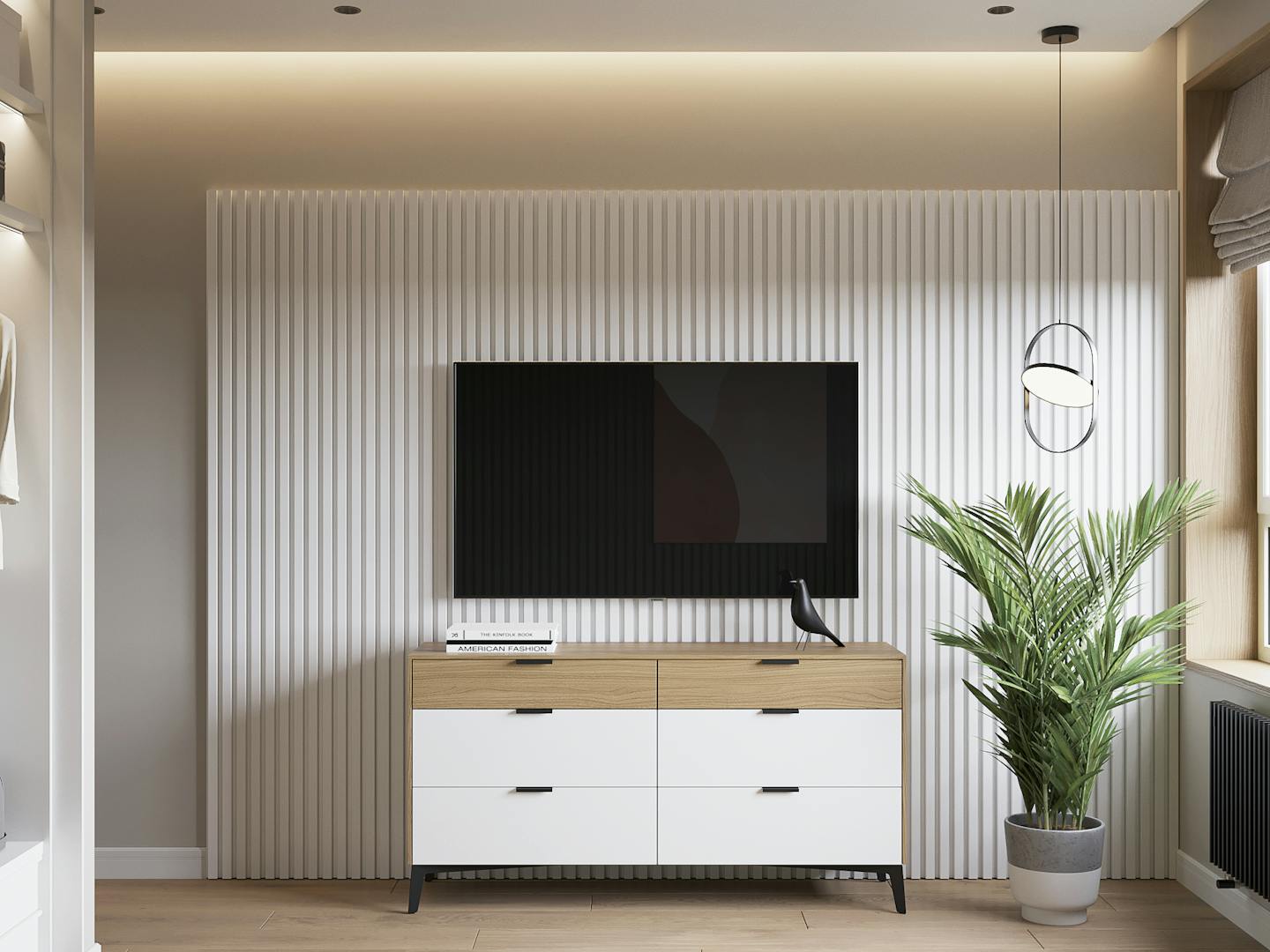 Еще одна повторяющаяся деталь — реечные панели. Мы их использовали вместо верхних шкафов кухни, в зоне ТВ, и в спальне в изголовье кровати. Комбинация цвета и материала позволила интересно подчеркнуть разные зоны интерьера и визуально выделить их.