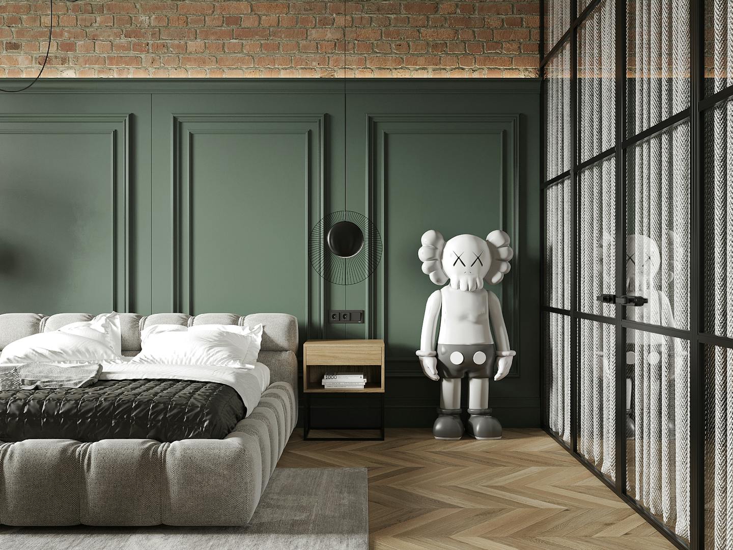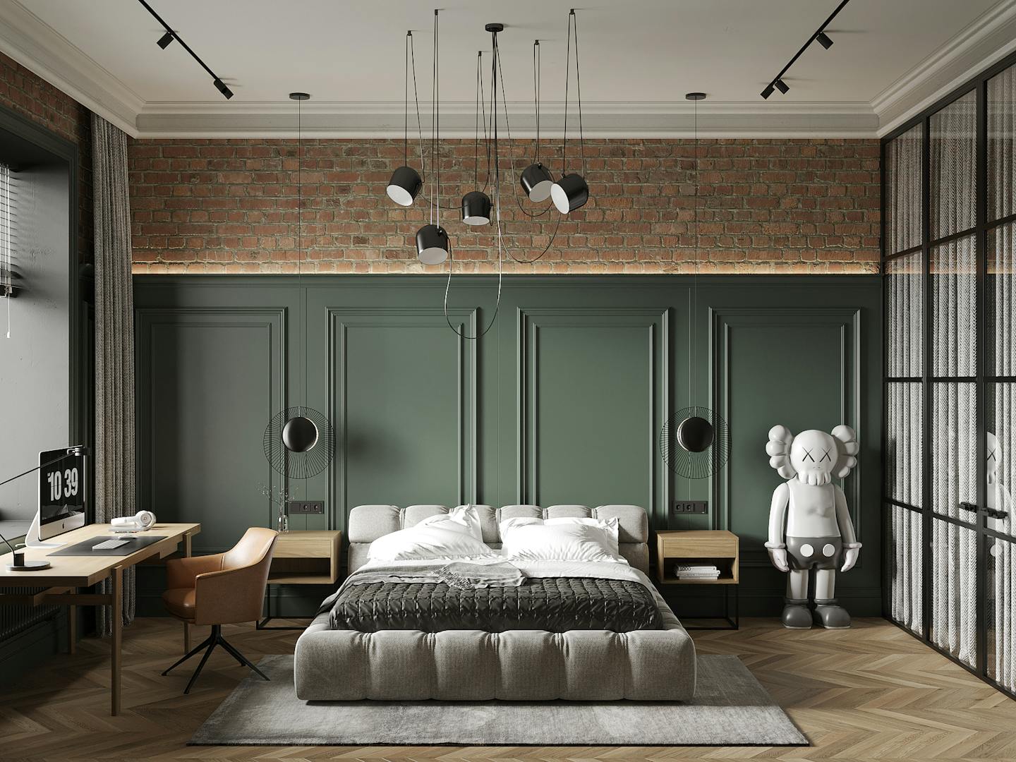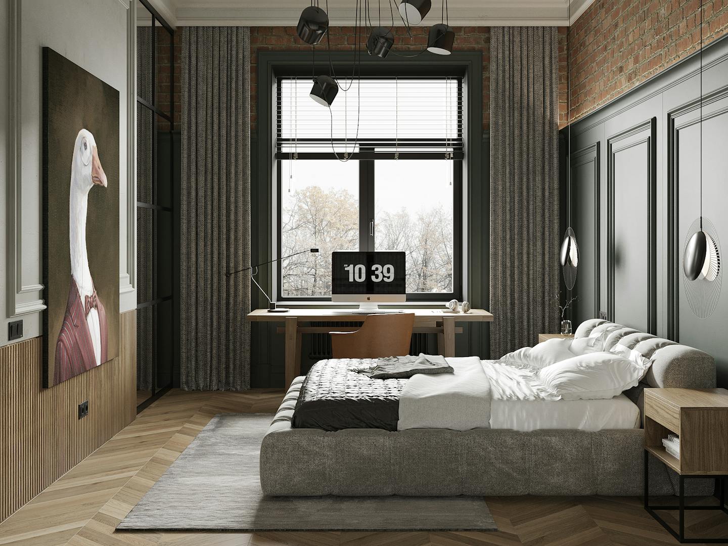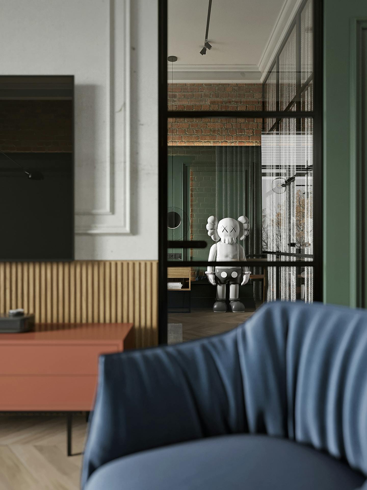 В спальне есть два элемента, которые притягивают к себе внимание. Это, собственно, сам Важный Гусь и скульптура KAWS. Они отображают в себе всю концепцию квартиры – пространства для образованных молодых людей, которые следят за современными веяниями в искусстве и дизайне. Простые современные формы, натуральные материалы и металлические конструкции, в зоне ТВ – реечные панели и молдинг. На наш взгляд, в конечном итоге нам удалось создать необходимую творческую, но уютную атмосферу для наших заказчиков.