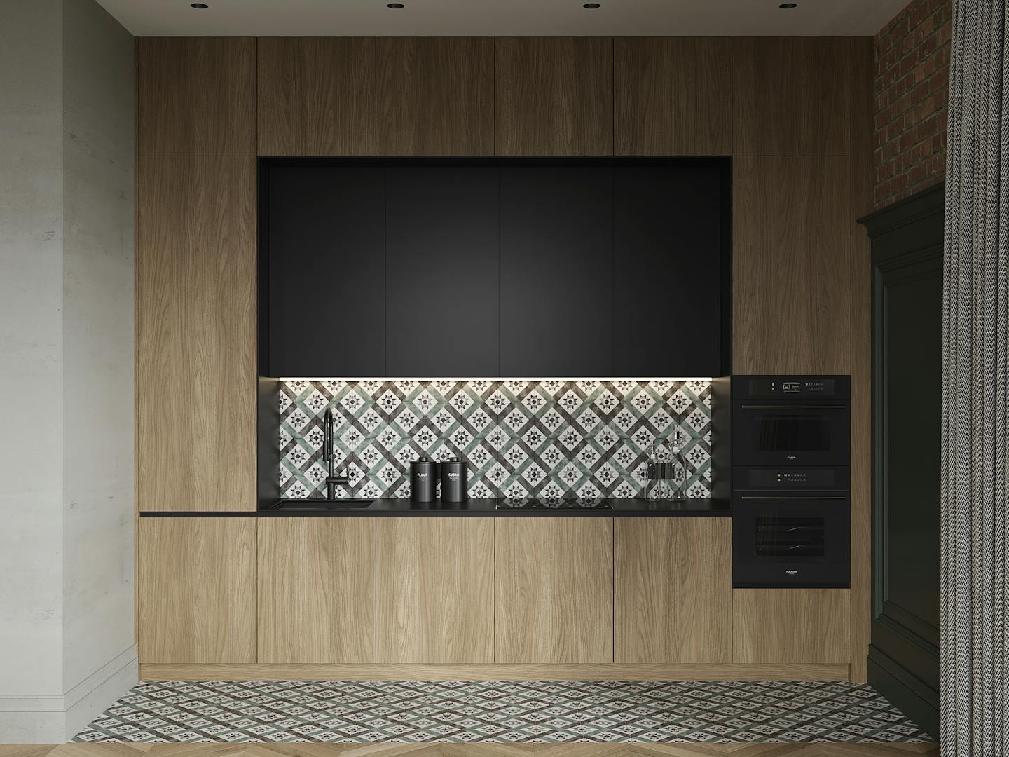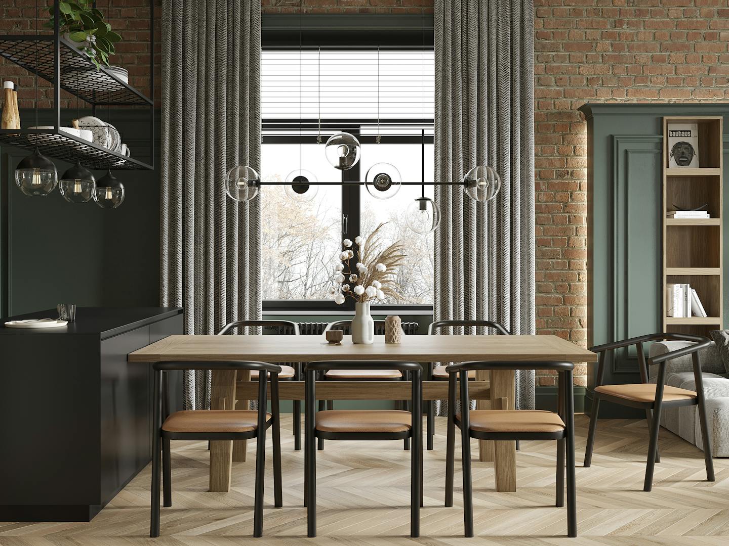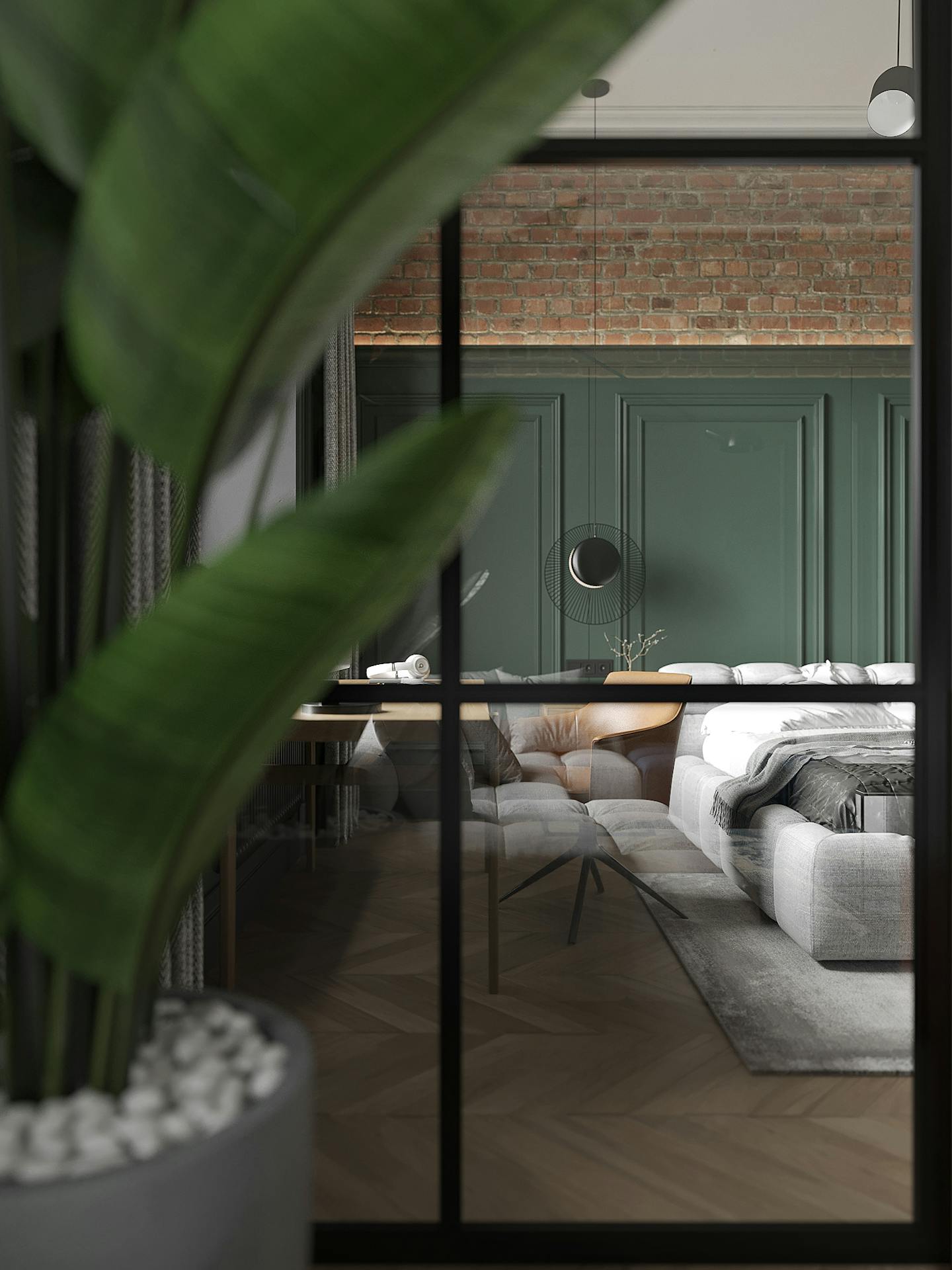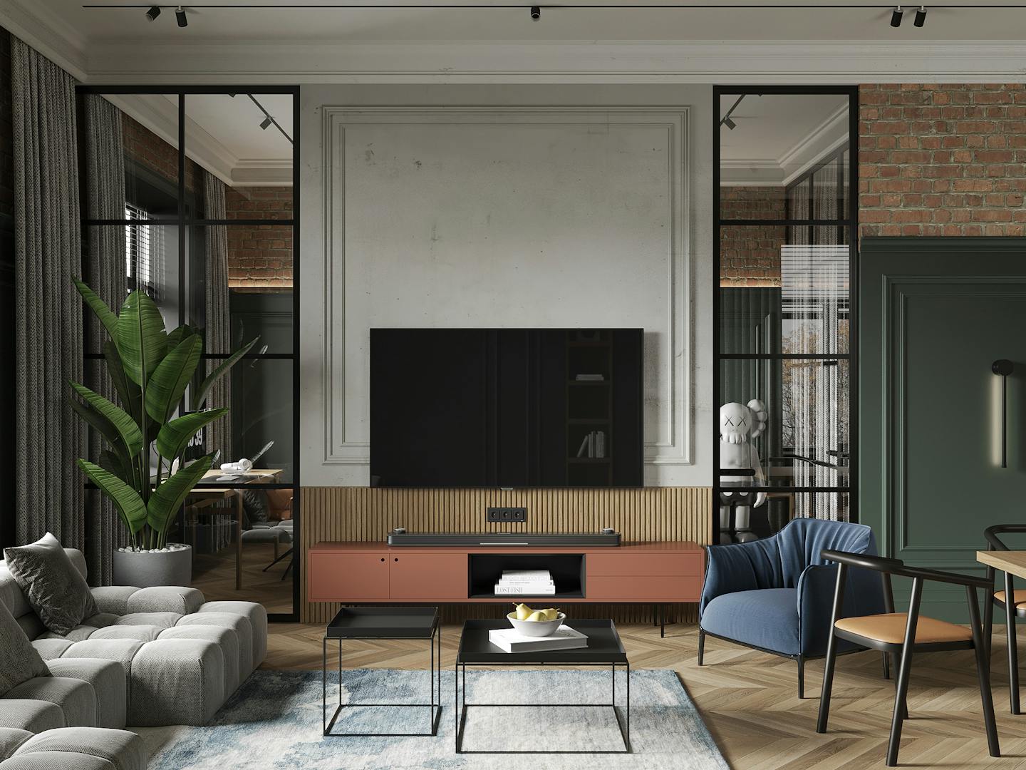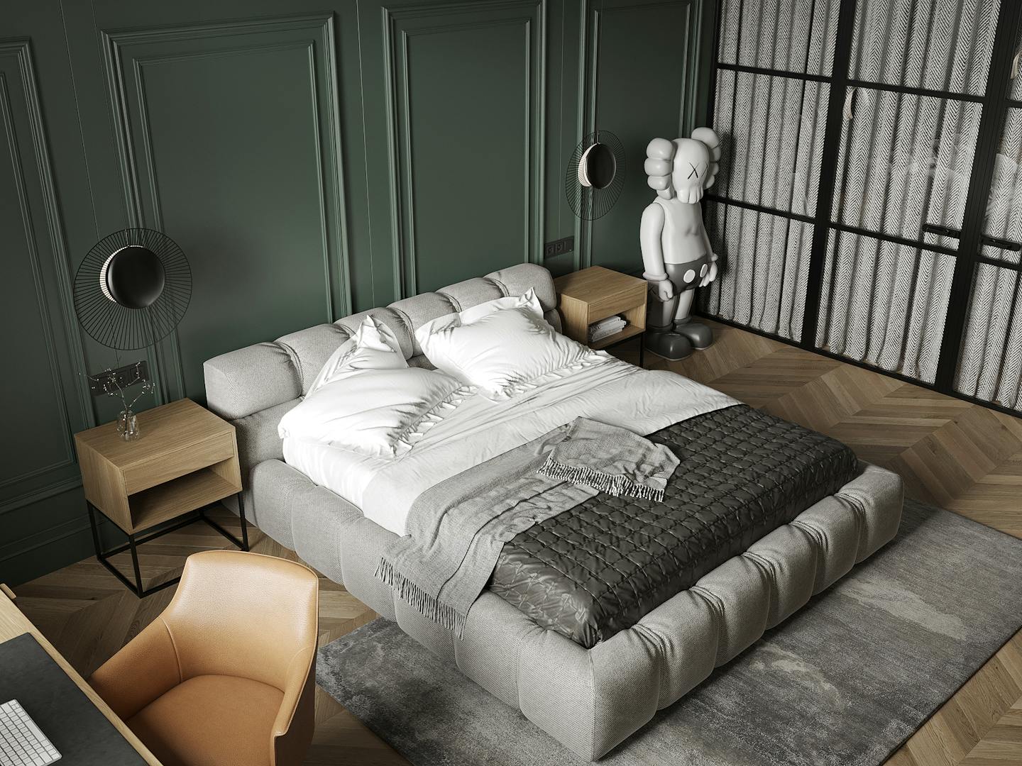 В спальне есть два элемента, которые притягивают к себе внимание. Это, собственно, сам Важный Гусь и скульптура KAWS. Они отображают в себе всю концепцию квартиры – пространства для образованных молодых людей, которые следят за современными веяниями в искусстве и дизайне. Простые современные формы, натуральные материалы и металлические конструкции, в зоне ТВ – реечные панели и молдинг. На наш взгляд, в конечном итоге нам удалось создать необходимую творческую, но уютную атмосферу для наших заказчиков.