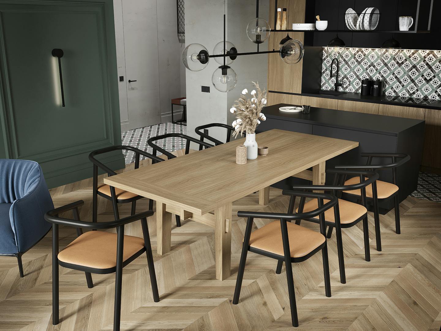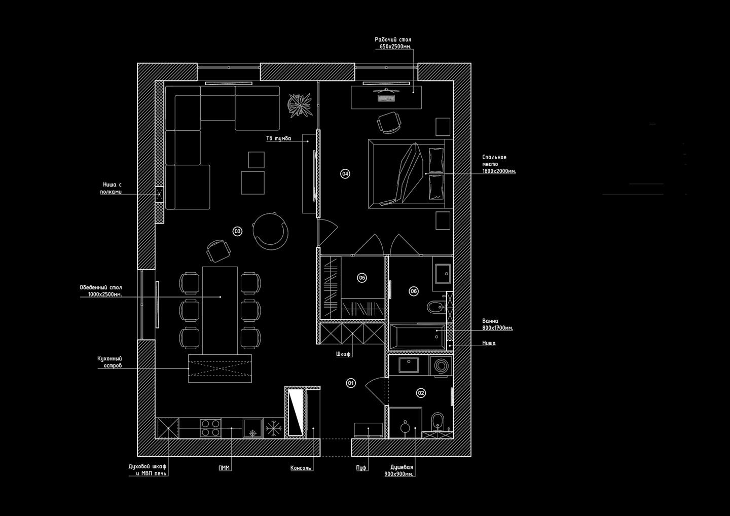 В центре планировки – просторная кухня-гостиная, которая включает в себя столовую группу и просторный модульный диван, который пригодится для многолюдных тусовок и посиделок. В спальне у окна предусмотрена рабочая зона. Во всех помещениях использовано минимум шкафов и тумб, чтобы было много места и воздуха. Основное место для хранения - вместительный гардероб. Также несколько шкафов разместили в прихожей. Не забыли и об эстетичной входной зоне с большим зеркалом и подвесными тумбой и светильниками.