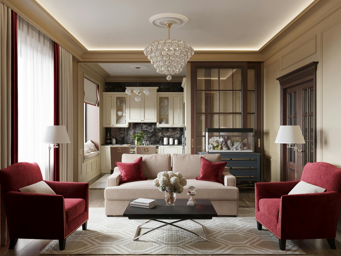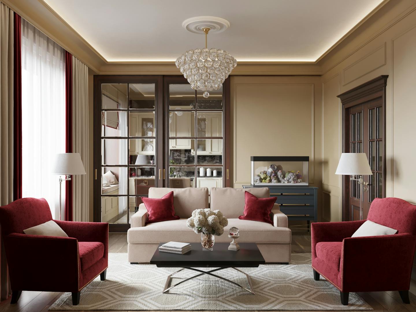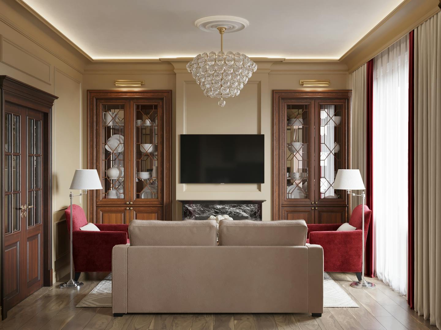 В качестве напольного покрытия использованы панели из мрамора на кухне и инженерную доску в других помещениях. В гостиной по просьбе заказчиков разместили искусственный камин — он отлично смотрится в общей композиции дивана и кресел карминового цвета.
