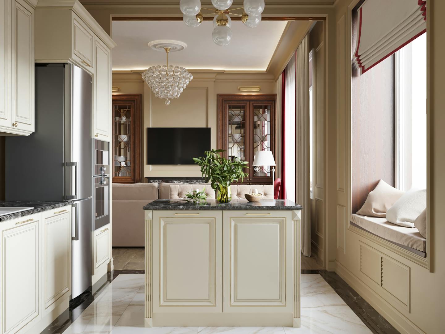 Просторность квартиры сыграла нам руку — для обширного декора нужно пространство. В данном случае, широкие карнизы и объёмные светильники смотрятся уместно и составляют единый классический ансамбль.