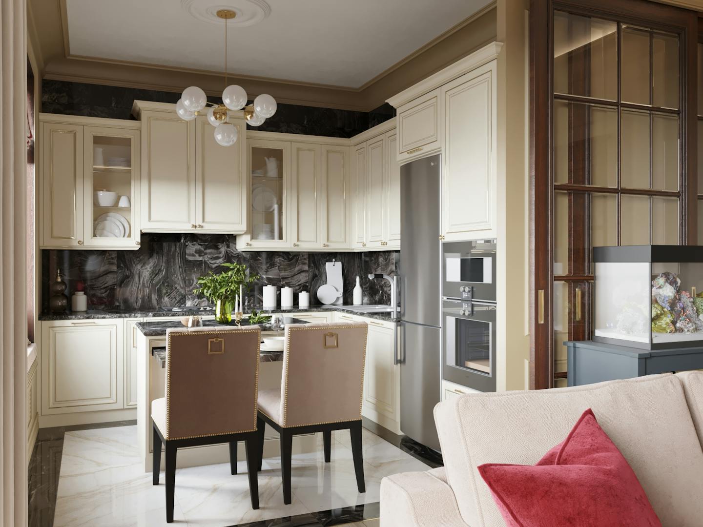 Кухонный гарнитур с филенками, молдинги, гипсовые розетки и натуральное дерево удачно складываются в единую композицию. В этих же тонах отделан и кухонный остров, размещенный рядом с обеденным столом. В столовой группе нашли применение дизайнерские стулья с велюровой спинкой и золотистой фурнитурой.