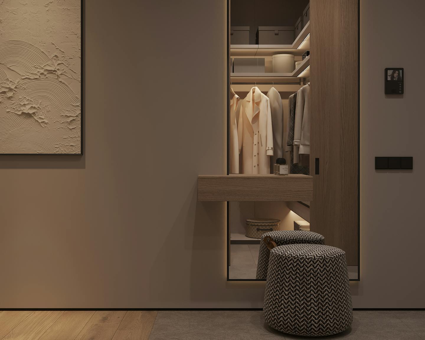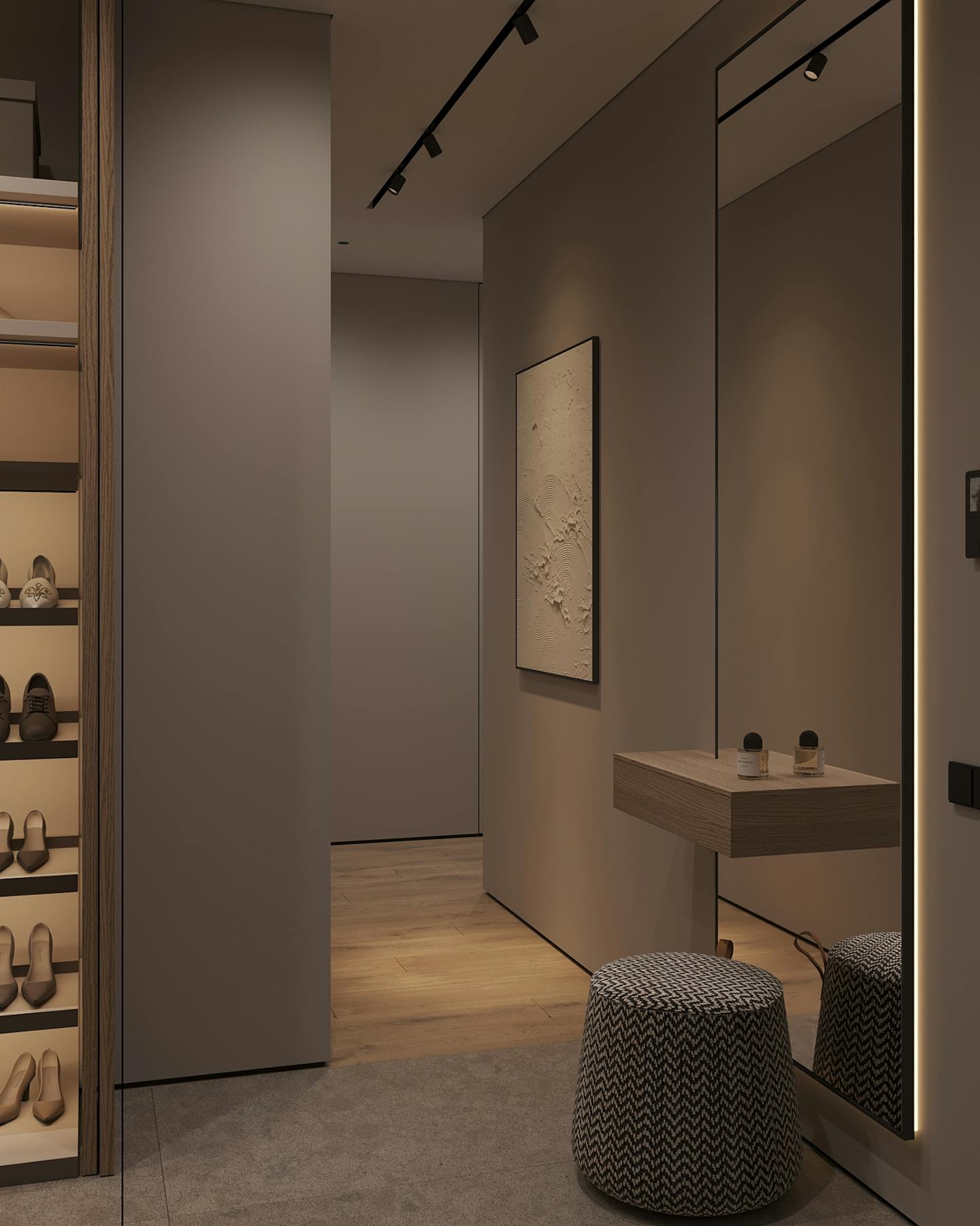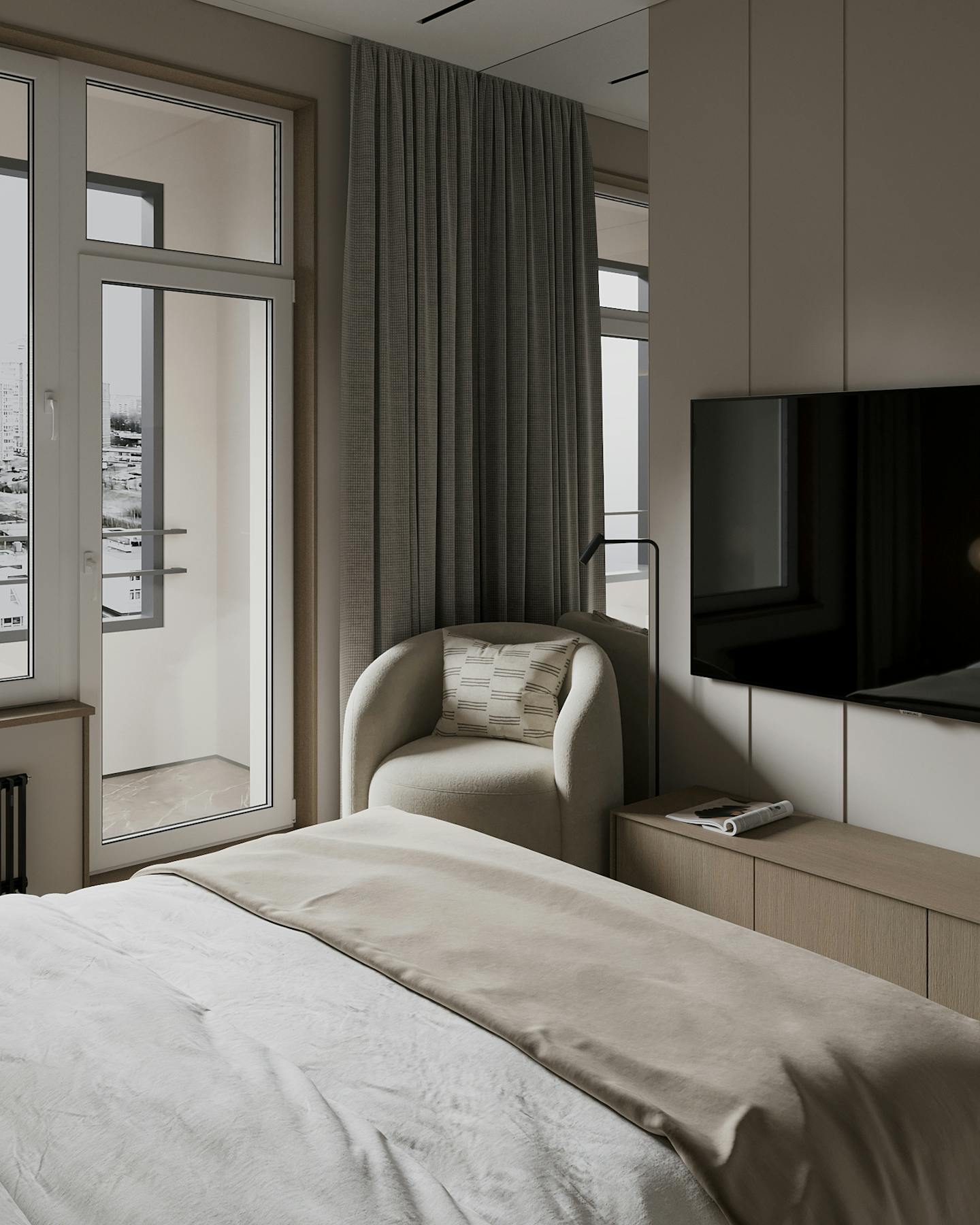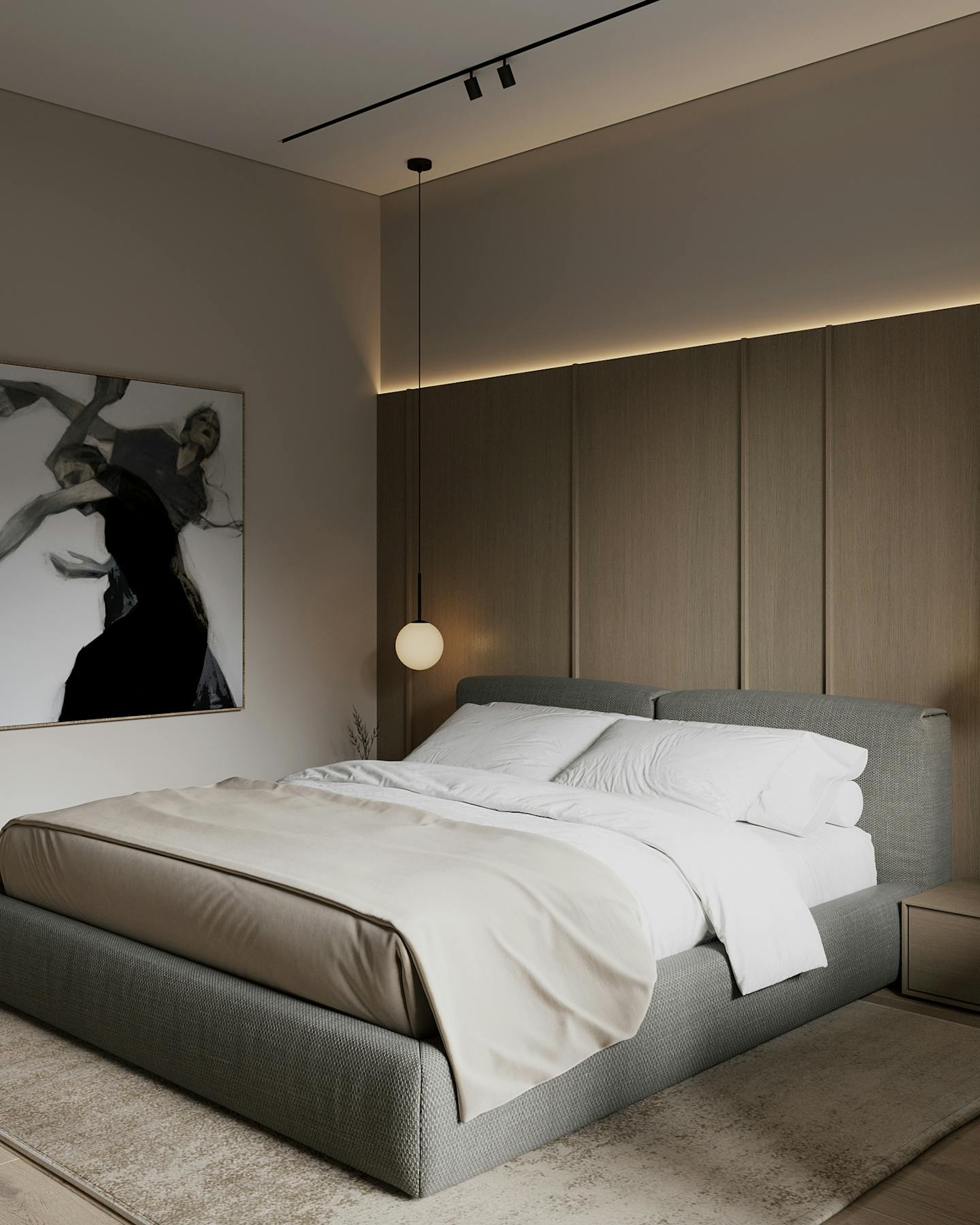 Проект современного интерьера, выполненного в спокойной серо-бежевой гамме. Мягкие серые оттенки в сочетании с тёплыми бежевыми цветами создают комфортное и стильное пространство.