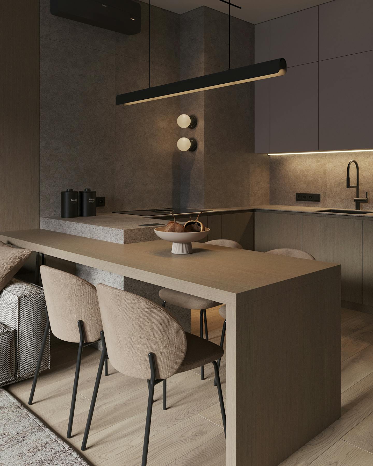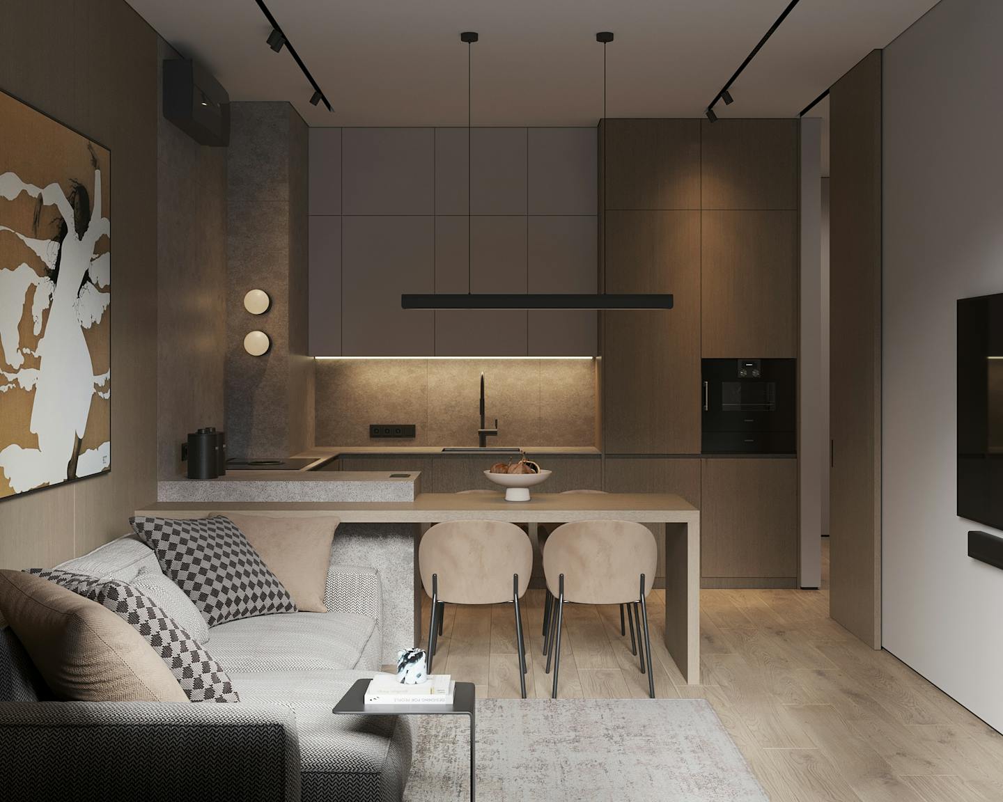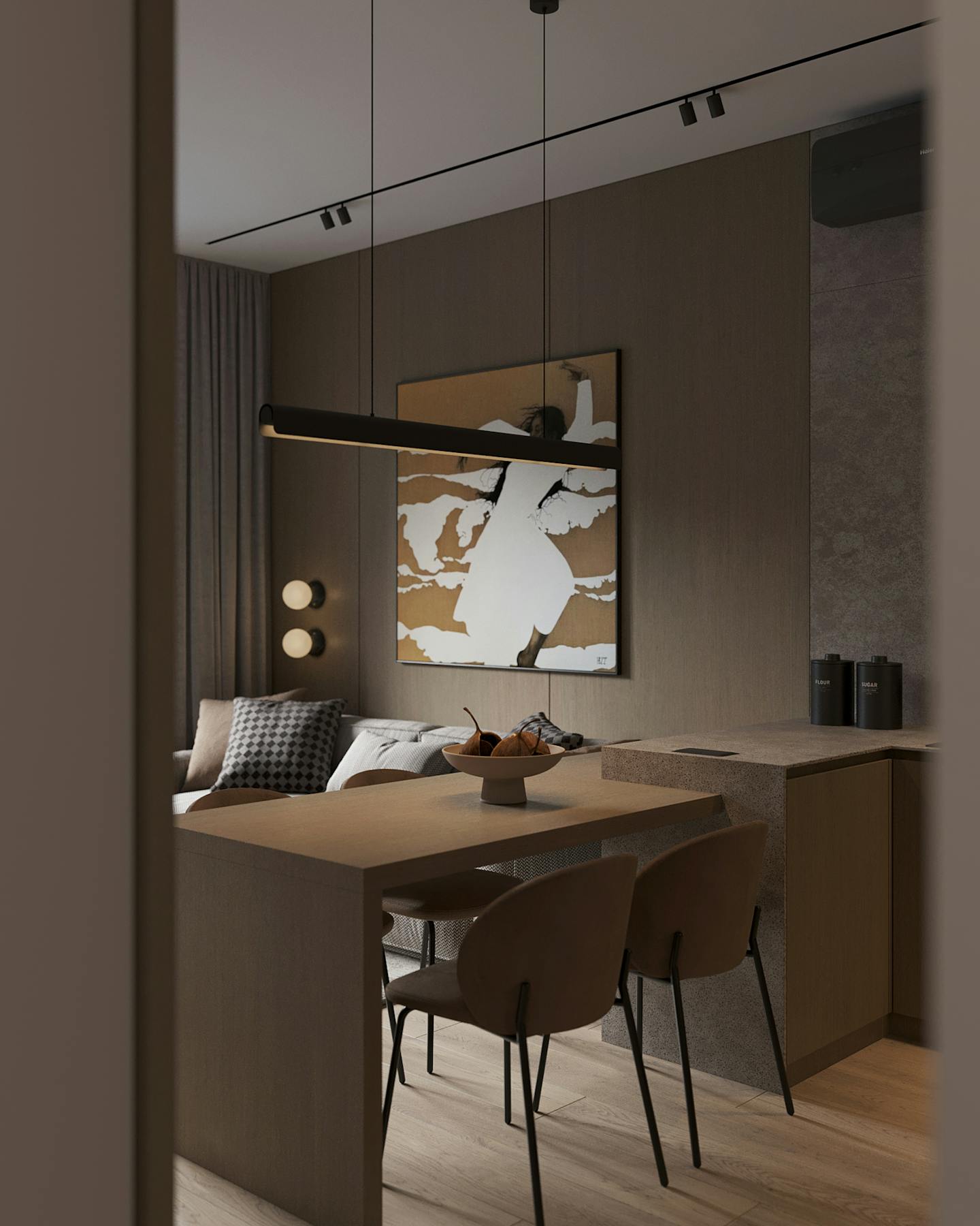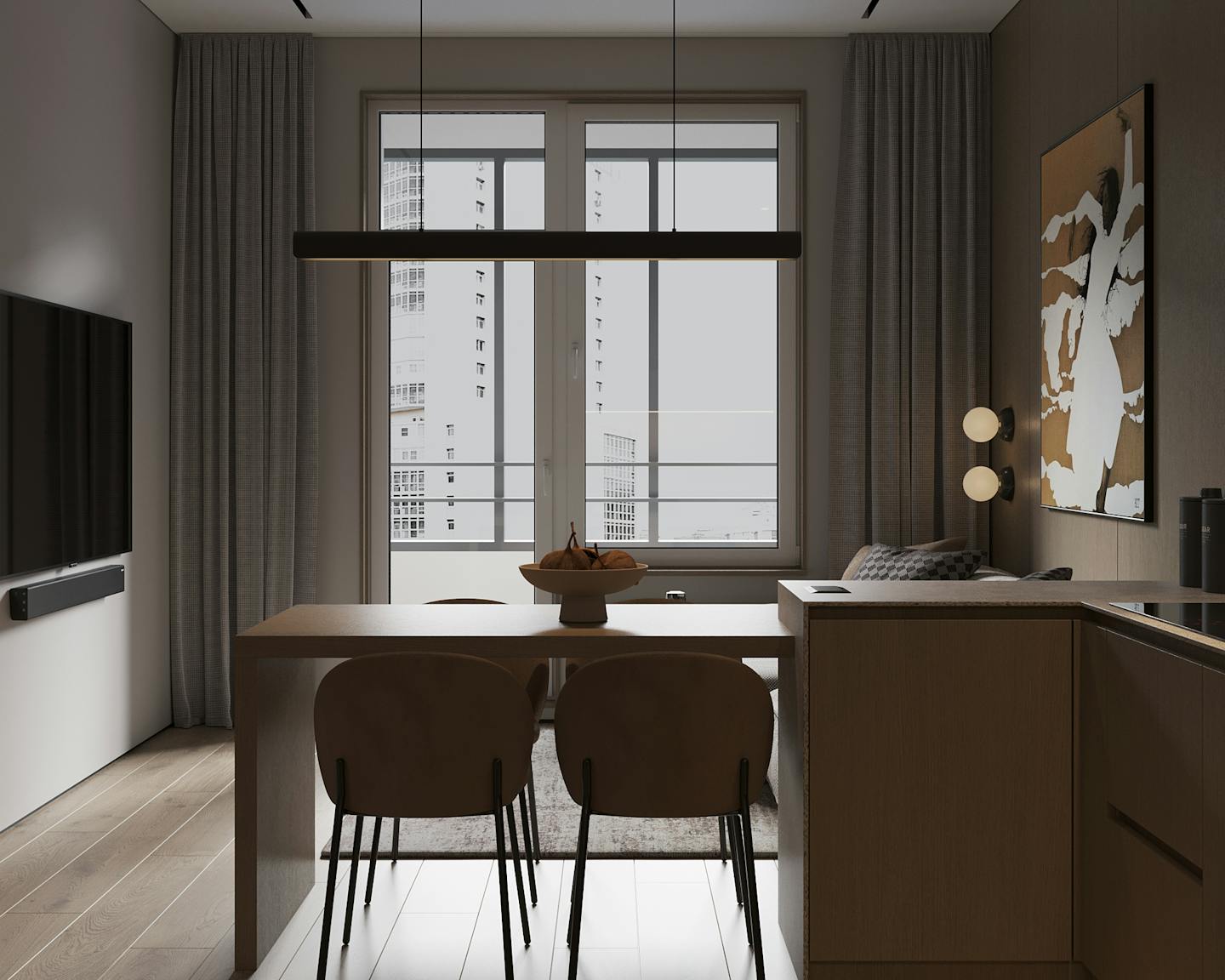 Проект современного интерьера, выполненного в спокойной серо-бежевой гамме. Мягкие серые оттенки в сочетании с тёплыми бежевыми цветами создают комфортное и стильное пространство.