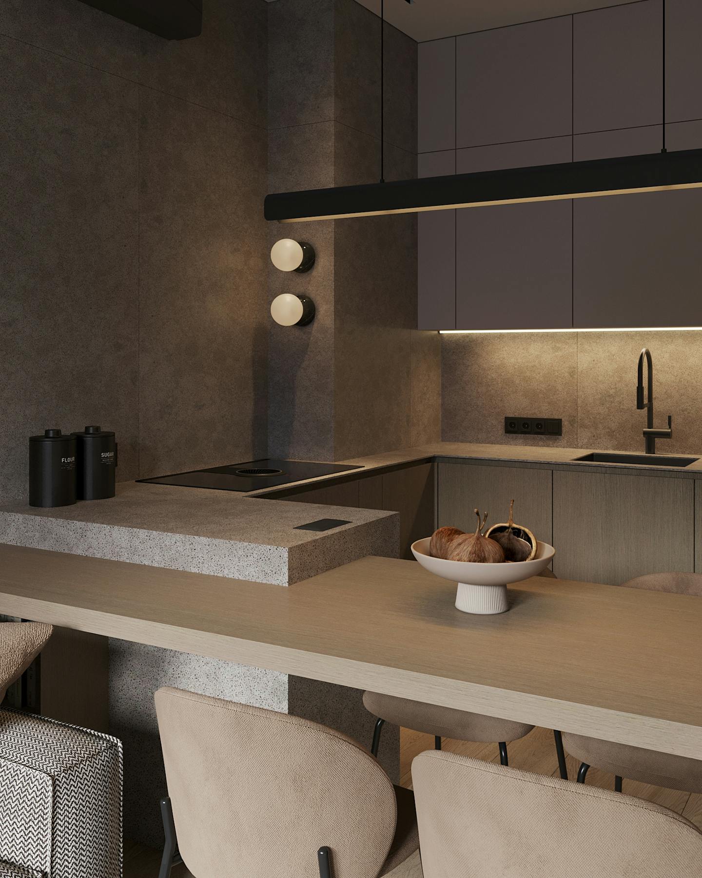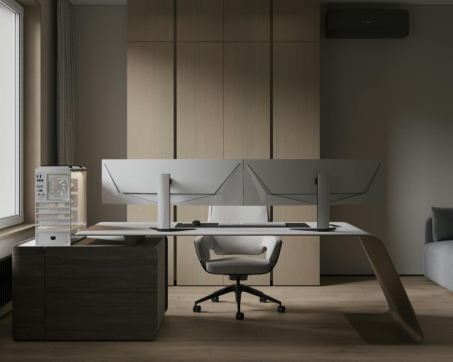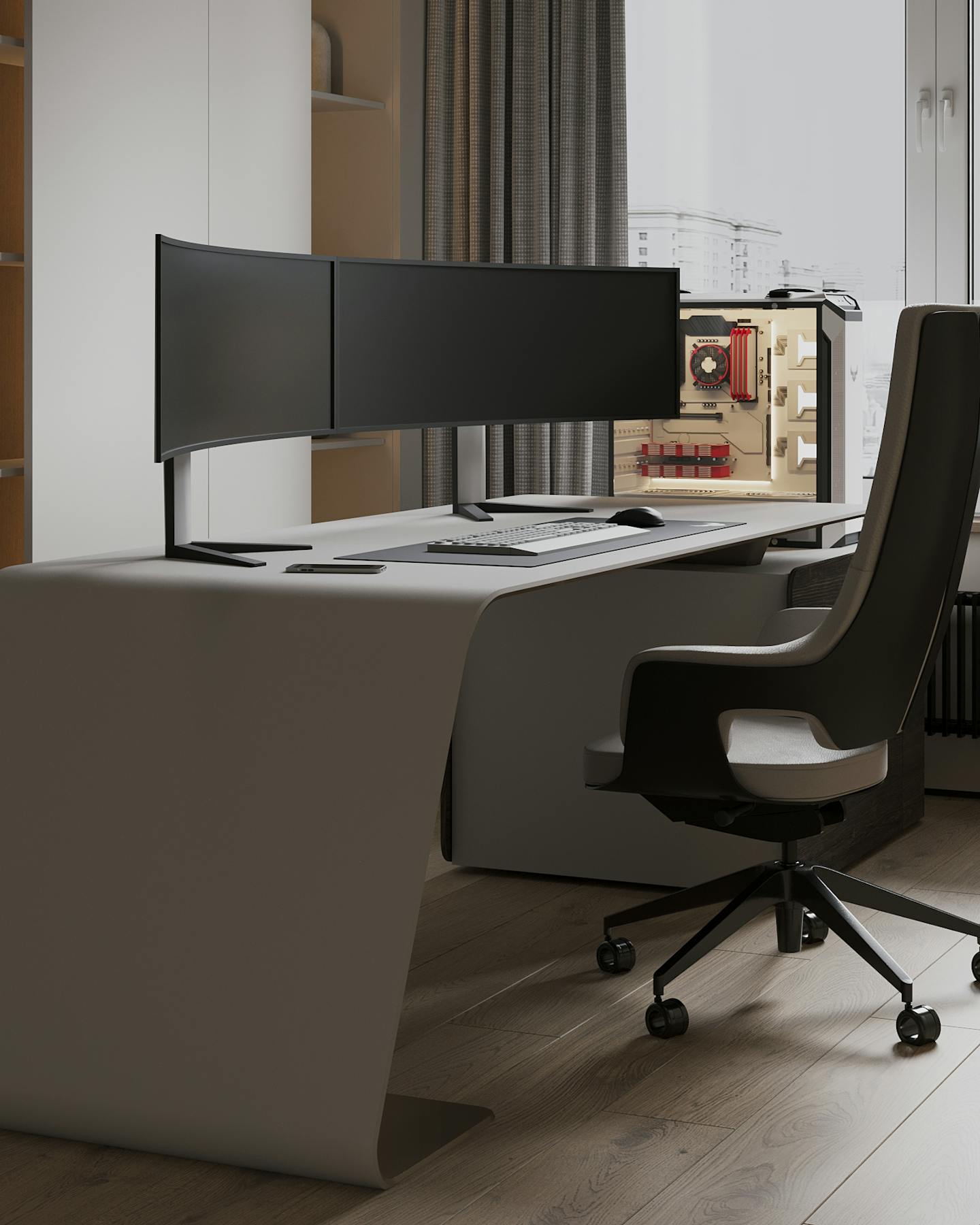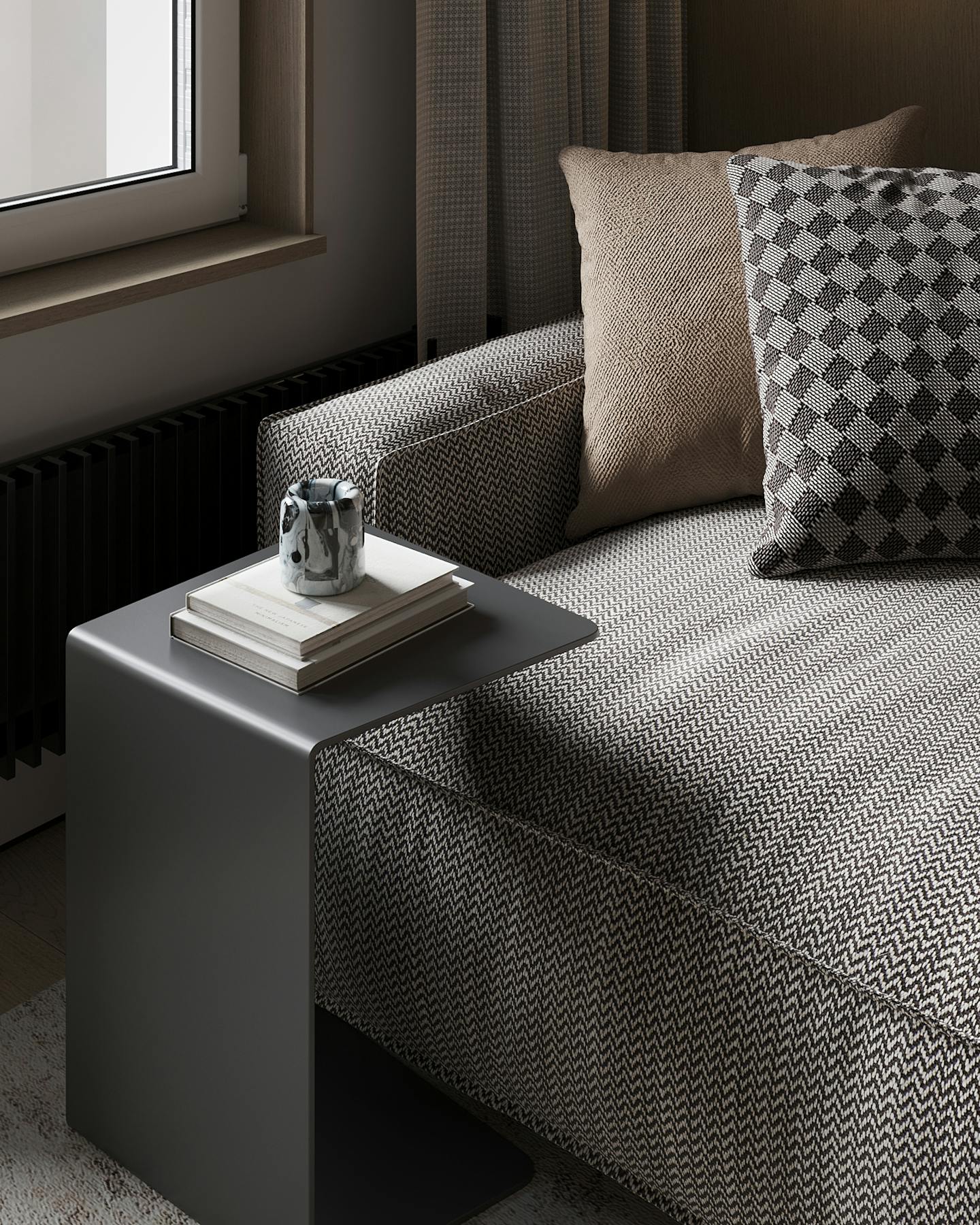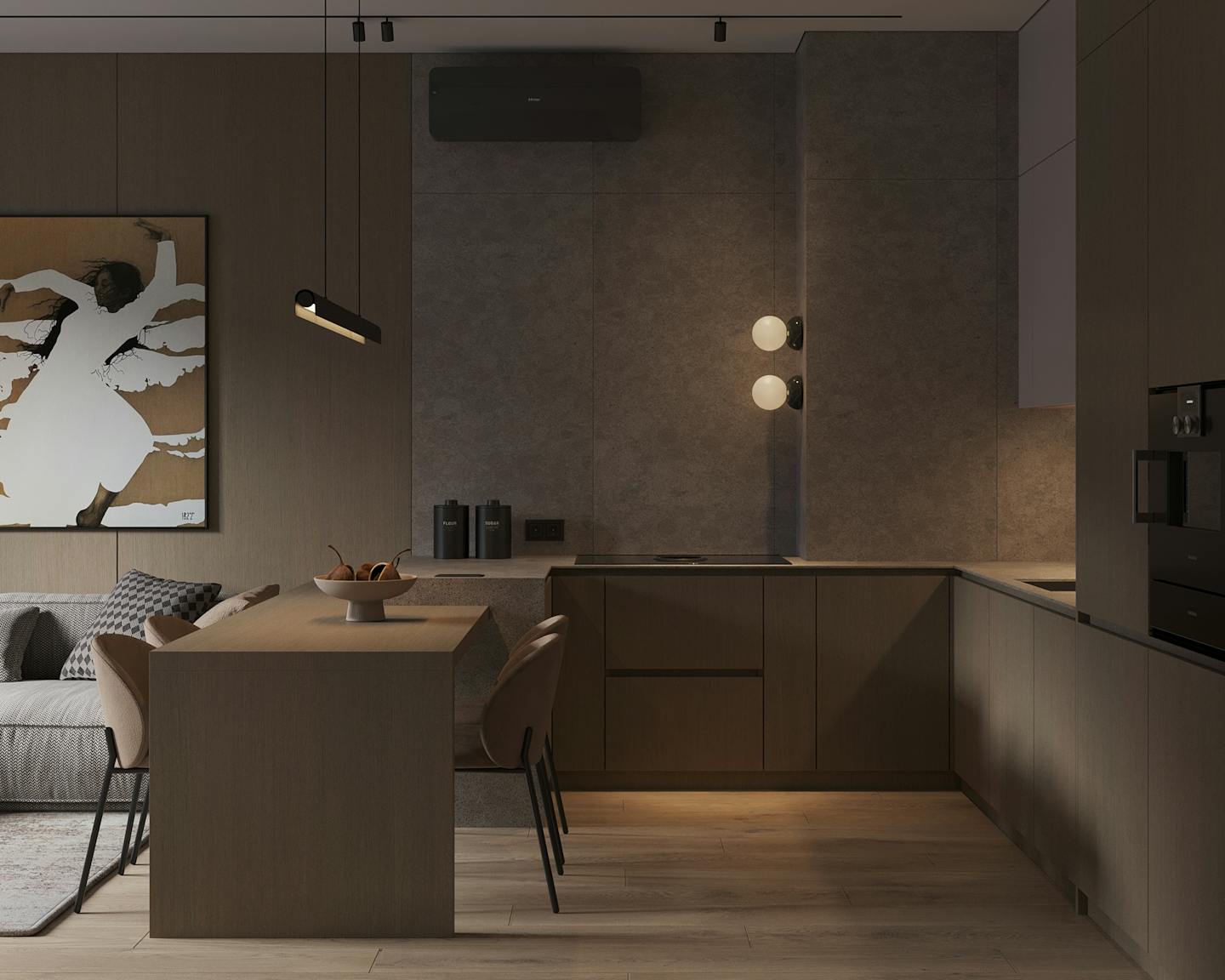 Проект современного интерьера, выполненного в спокойной серо-бежевой гамме. Мягкие серые оттенки в сочетании с тёплыми бежевыми цветами создают комфортное и стильное пространство.