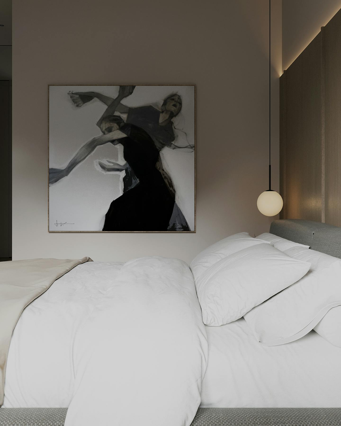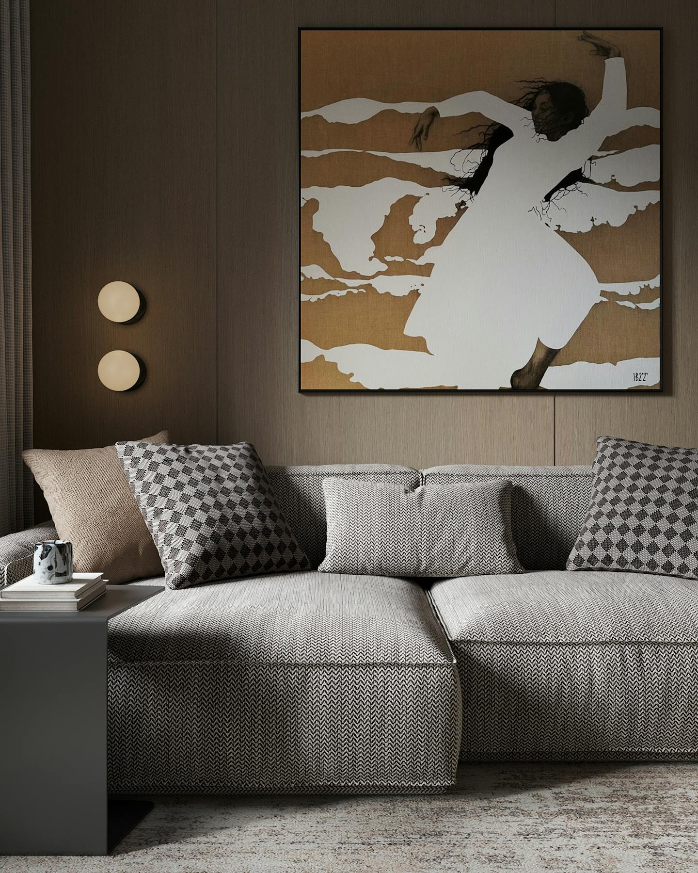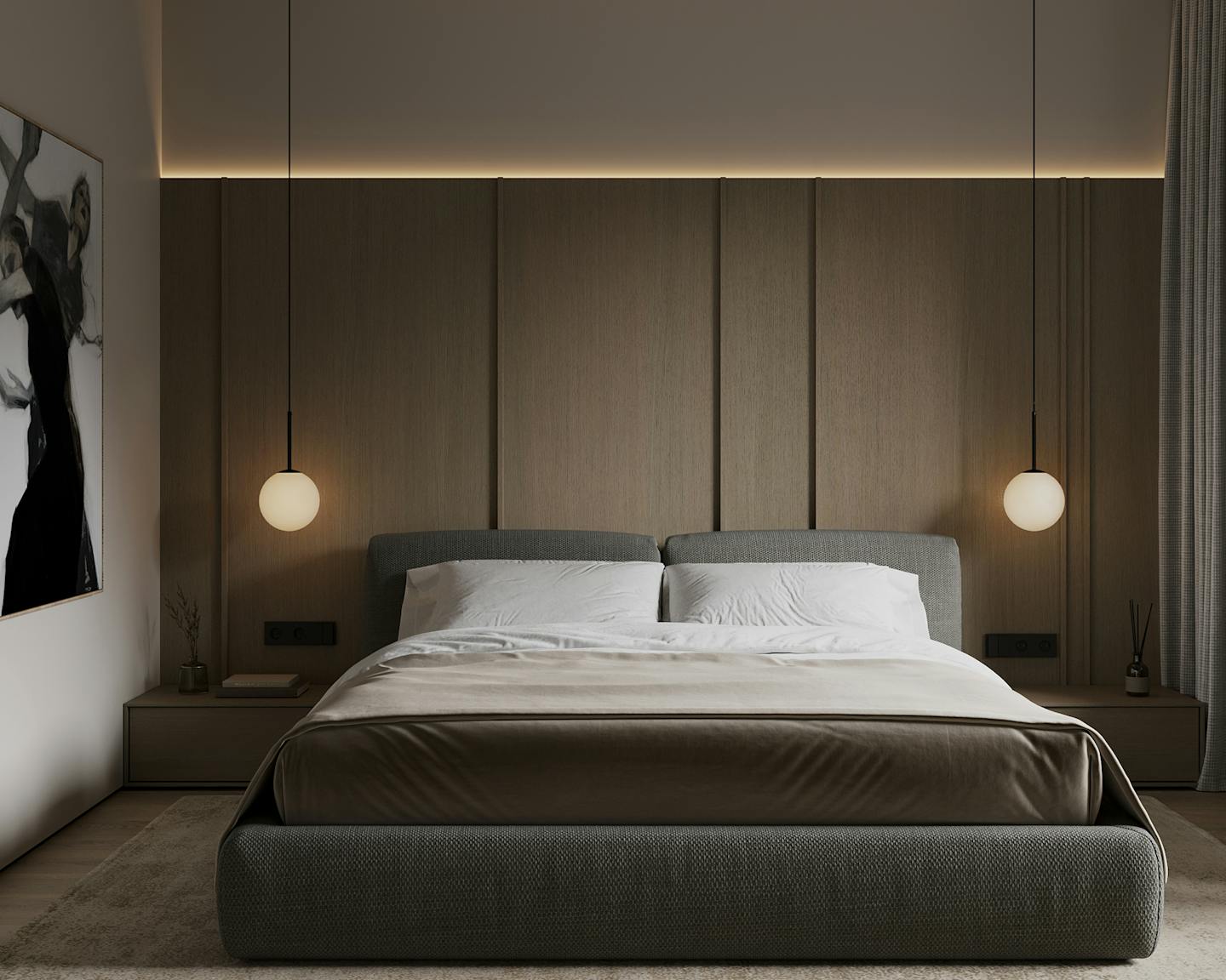 В интерьере используются ткани с интересной текстурой, что добавляет глубину и разнообразие в общий образ. Акцентные картины на стенах придают интерьеру индивидуальность и характер. Они могут стать ярким пятном в общей гамме и добавить визуальный интерес.