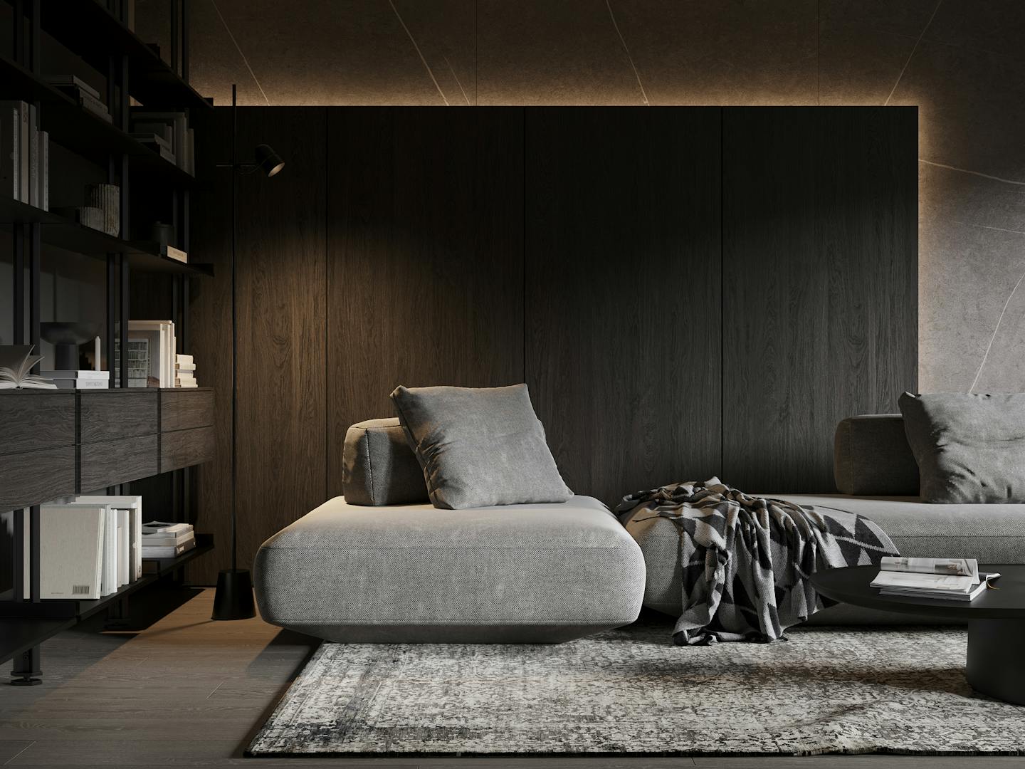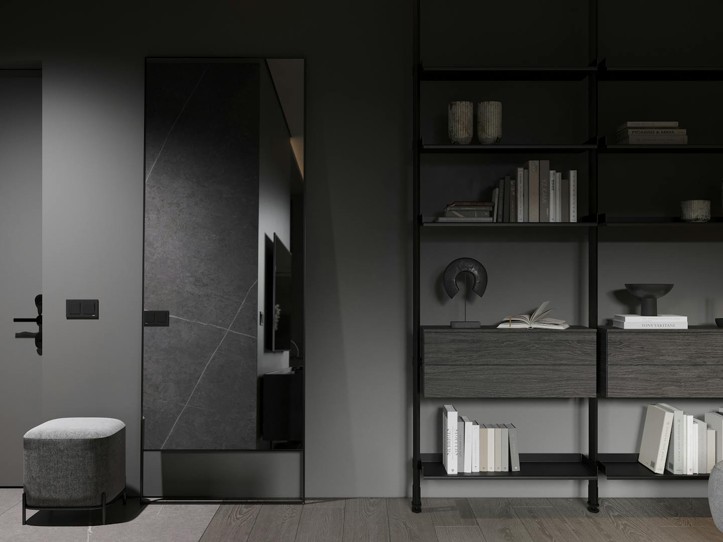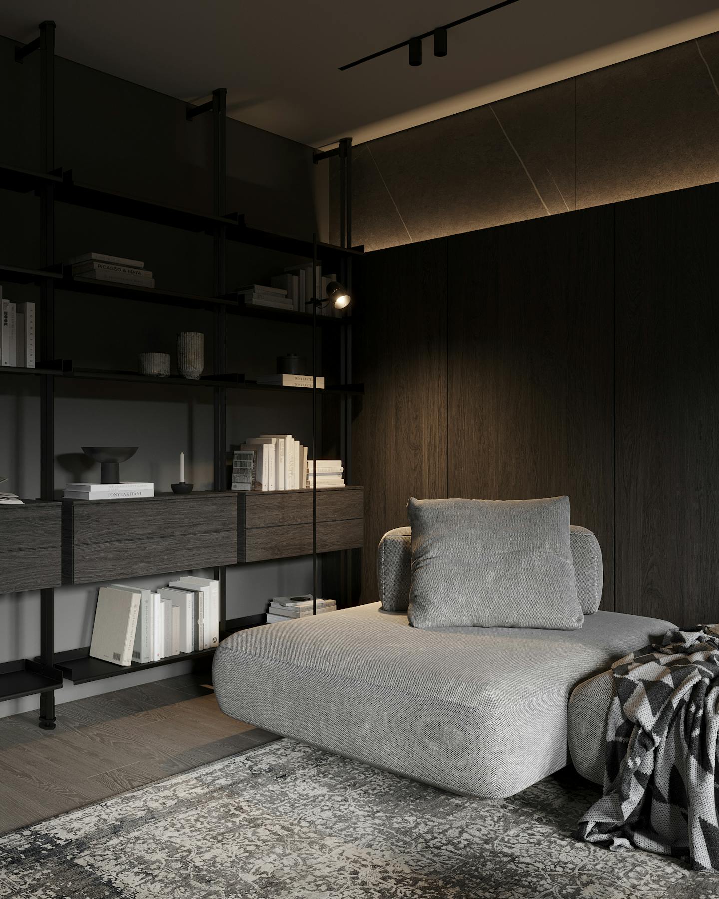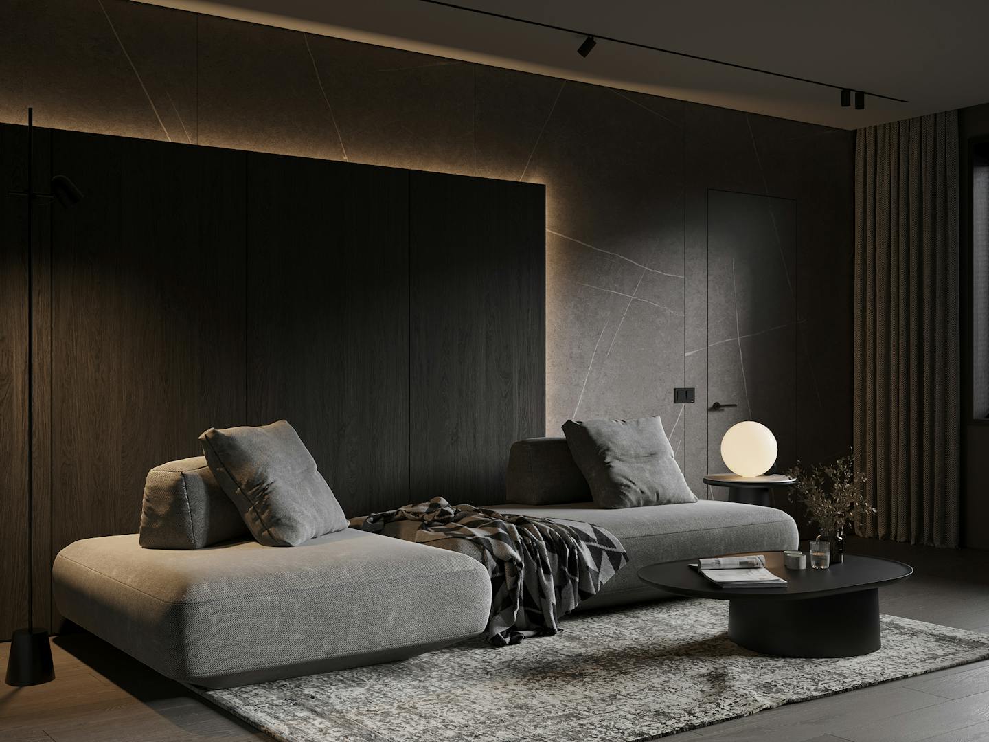 Таинственный и уютный интерьер с преобладанием серых оттенков – один из самых сложных проектов. В основу его легла теория о черном цвете, который поглощает весь свет, ничего не отражая. Темный интерьер формирует атмосферу таинственности и эмоциональную безопасность.