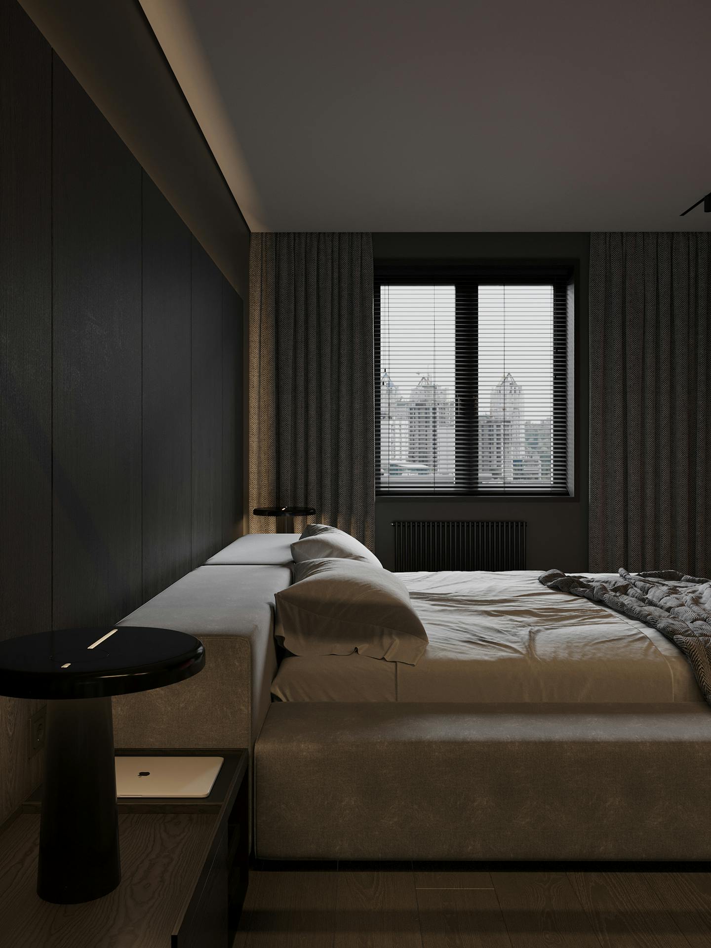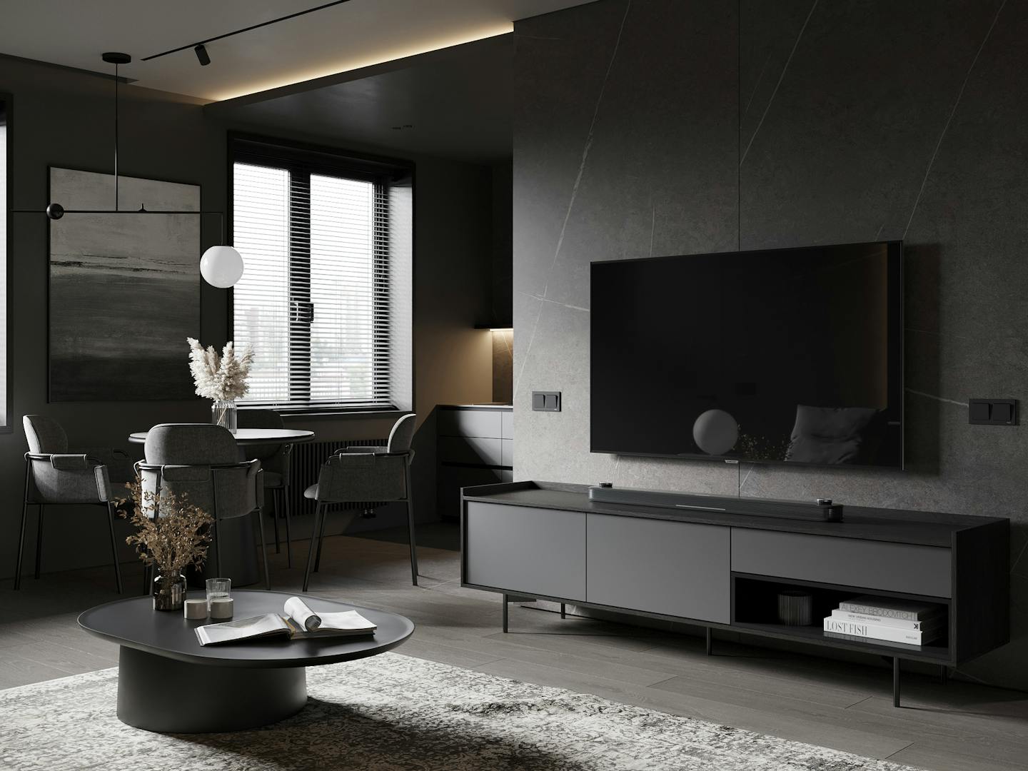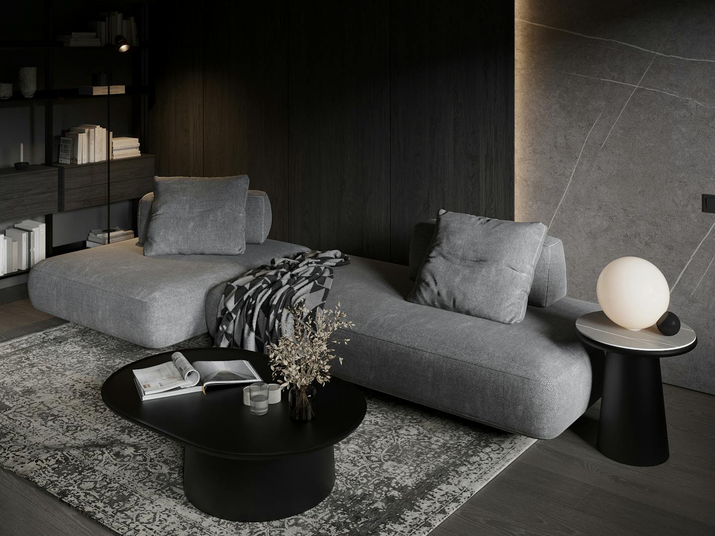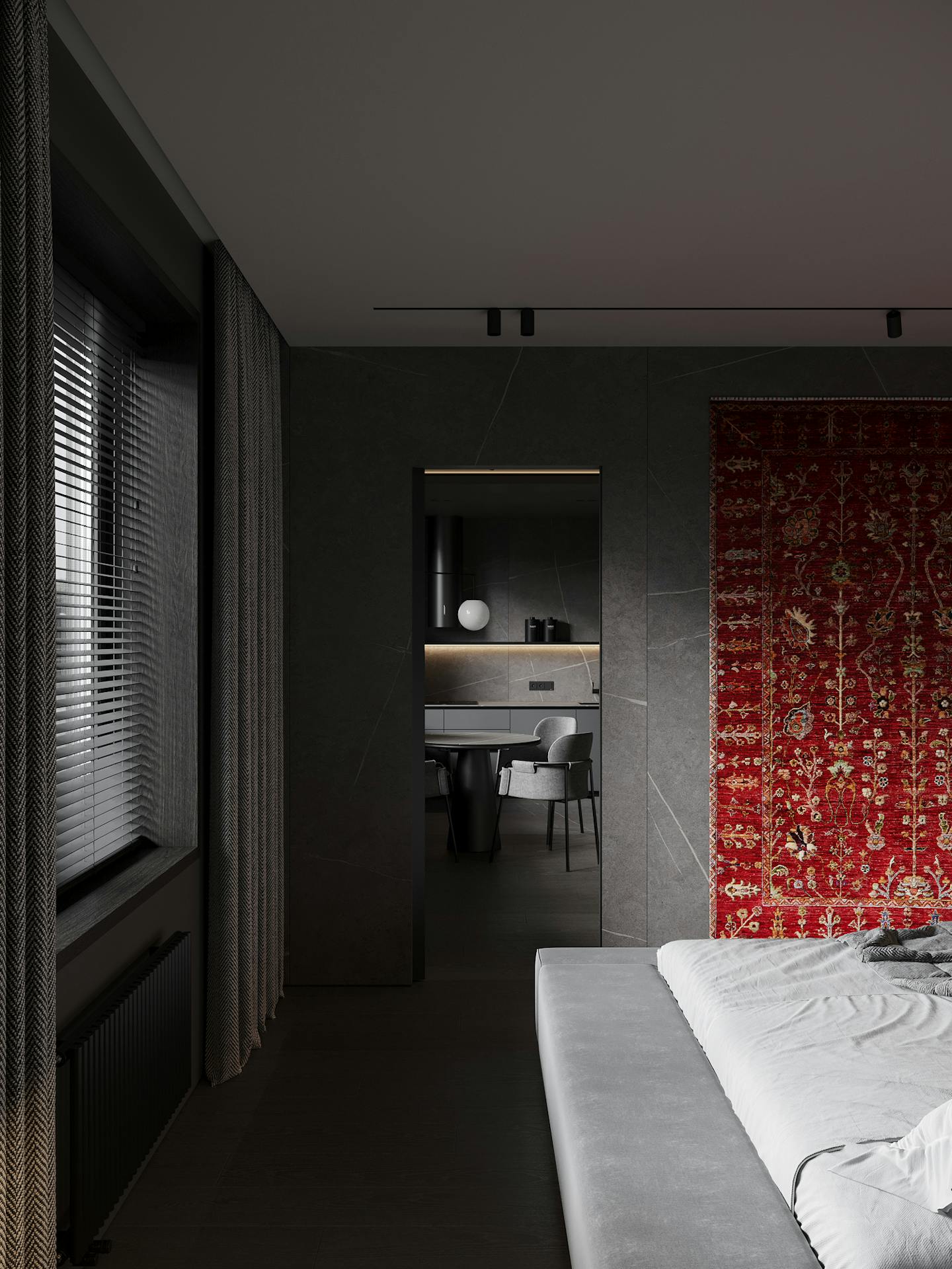 Таинственный и уютный интерьер с преобладанием серых оттенков – один из самых сложных проектов. В основу его легла теория о черном цвете, который поглощает весь свет, ничего не отражая. Темный интерьер формирует атмосферу таинственности и эмоциональную безопасность.