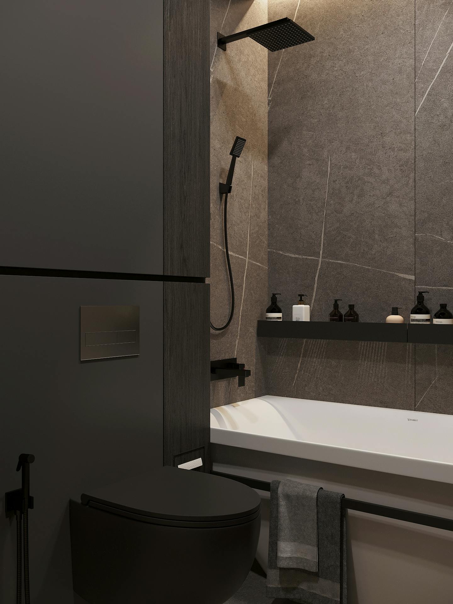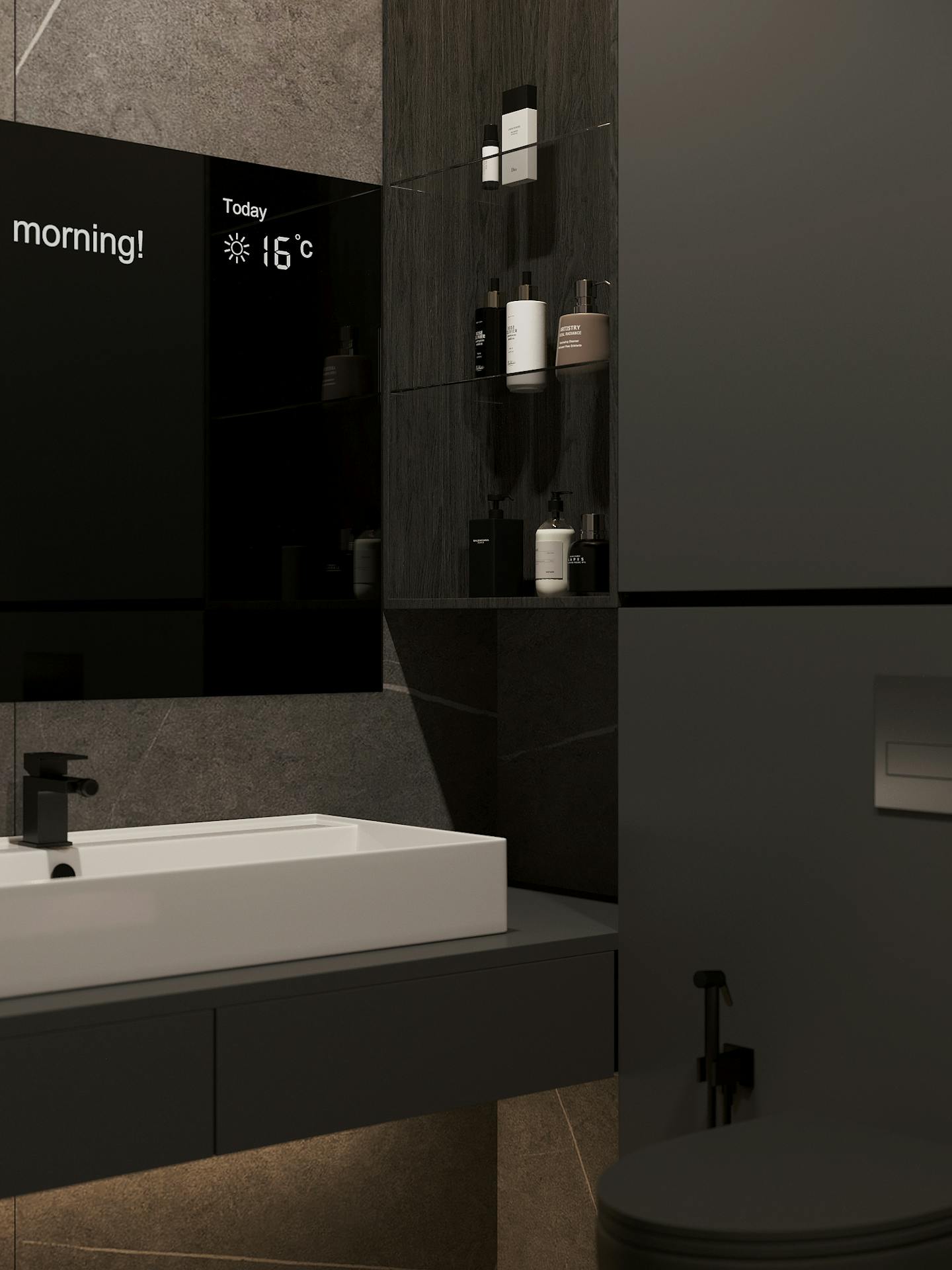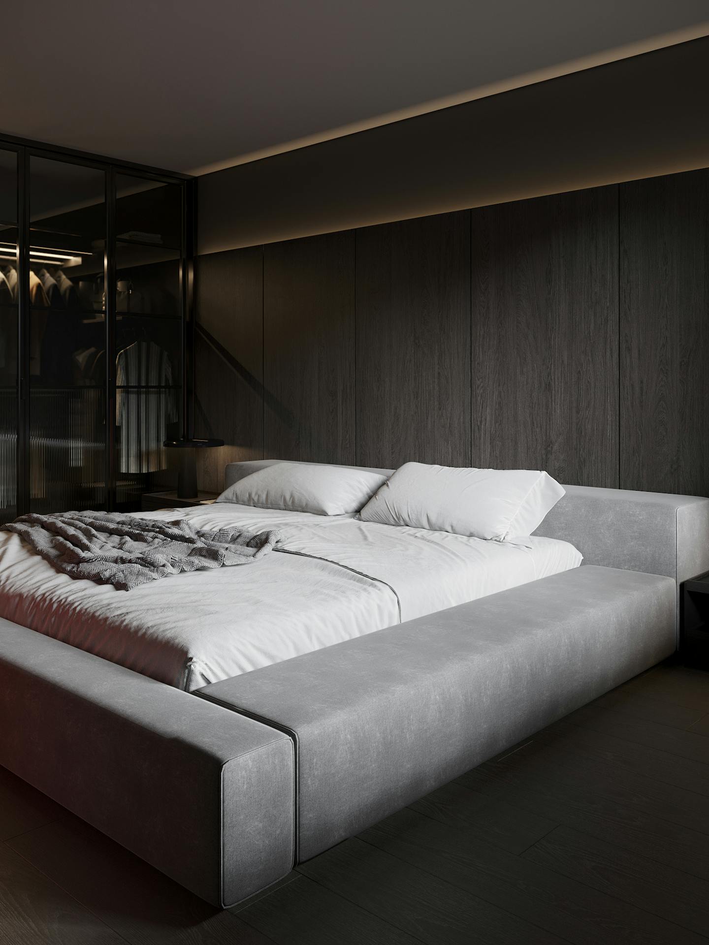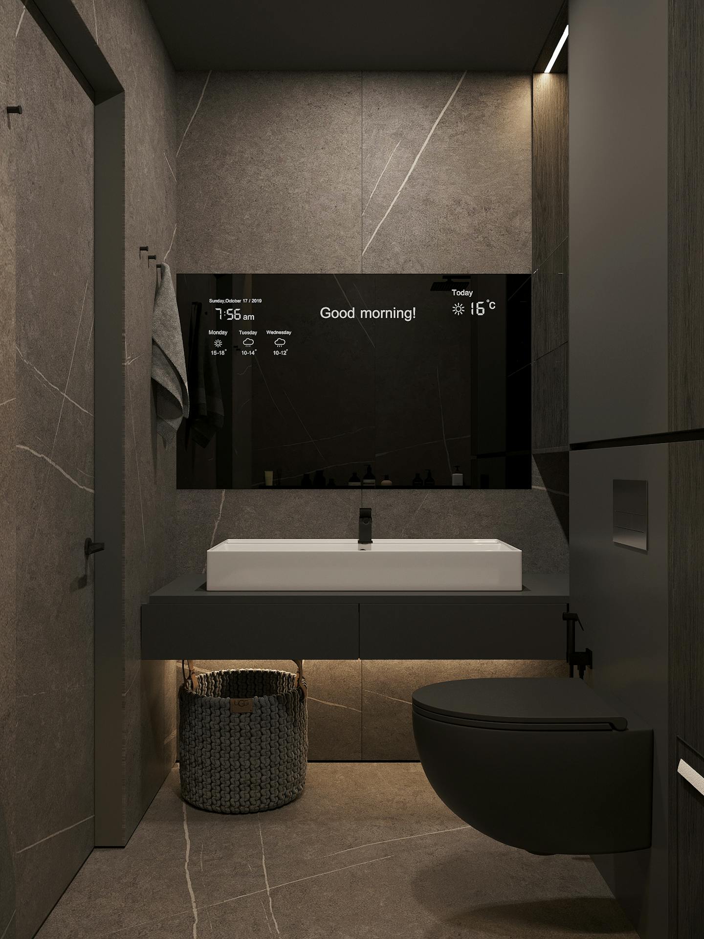 Таинственный и уютный интерьер с преобладанием серых оттенков – один из самых сложных проектов. В основу его легла теория о черном цвете, который поглощает весь свет, ничего не отражая. Темный интерьер формирует атмосферу таинственности и эмоциональную безопасность.
